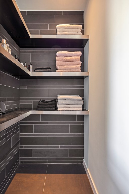 The bathroom is a showpiece: stylishly tiled, modern, and generous, with a bathtub, large walk-in shower, and double vanity.
