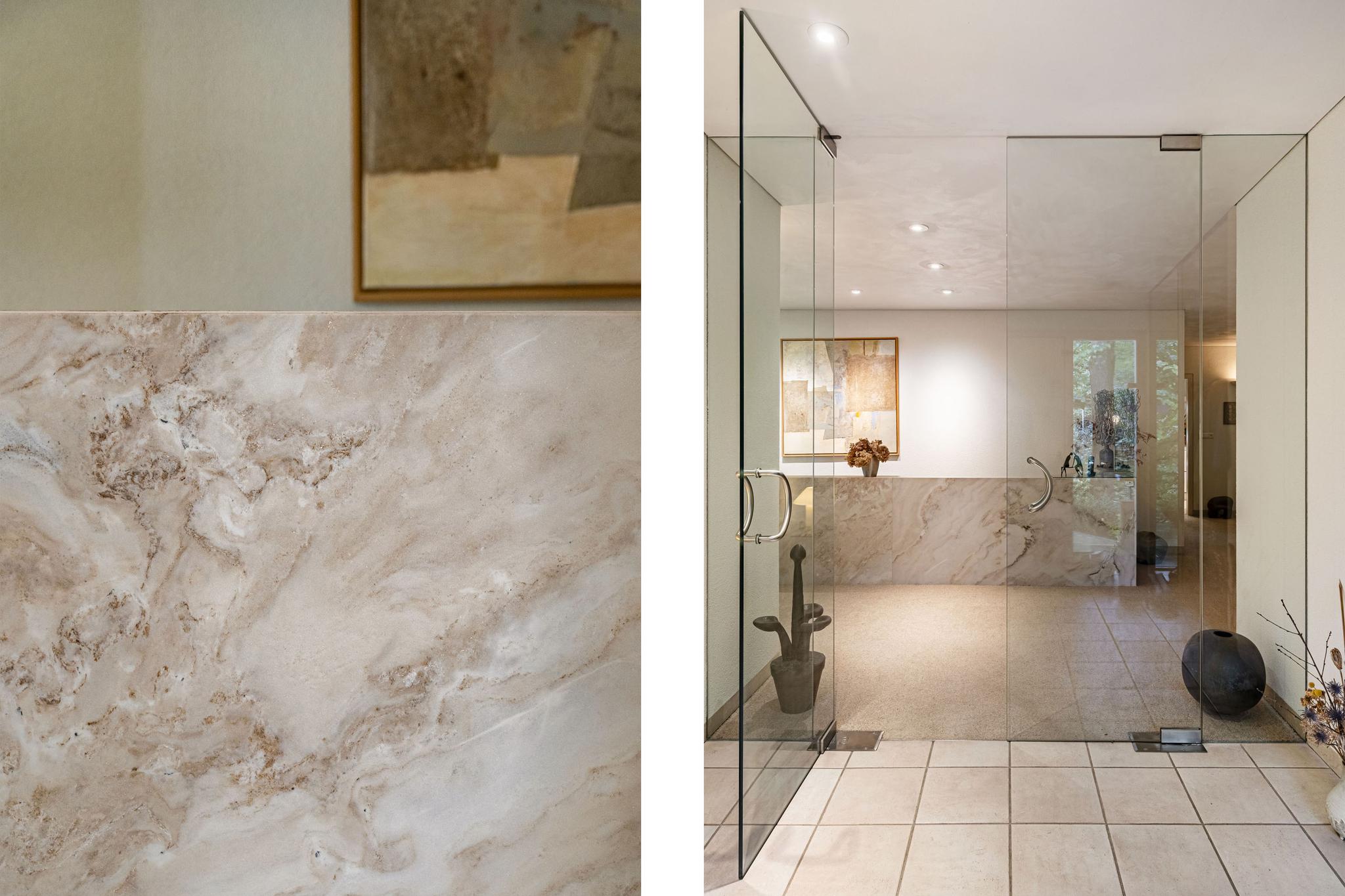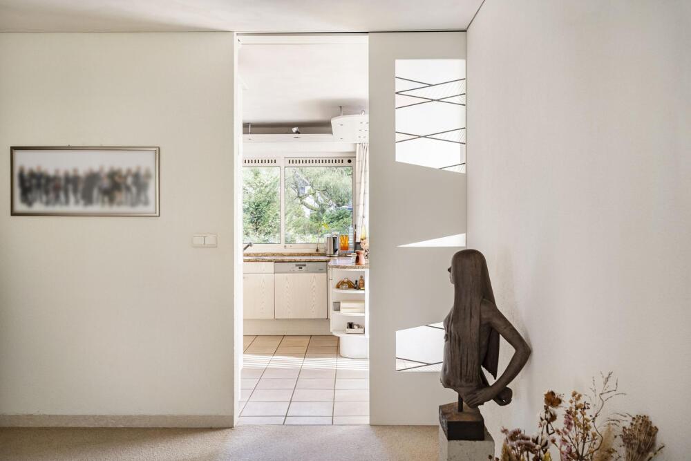 Moving further into the home, you enter the exceptionally large living area. The lounge features a full-width glass façade, offering breathtaking views of the garden. The open-plan kitchen is connected to a utility room, which includes a dumbwaiter from the basement. The dining room is located on the garden side, and in between lies a spacious study. All of these areas flow openly into each other, while the study and kitchen can be closed off with elegant sliding doors. The large covered terrace, accessible from the living room through sliding doors, features an electric retractable roof and sunshade.