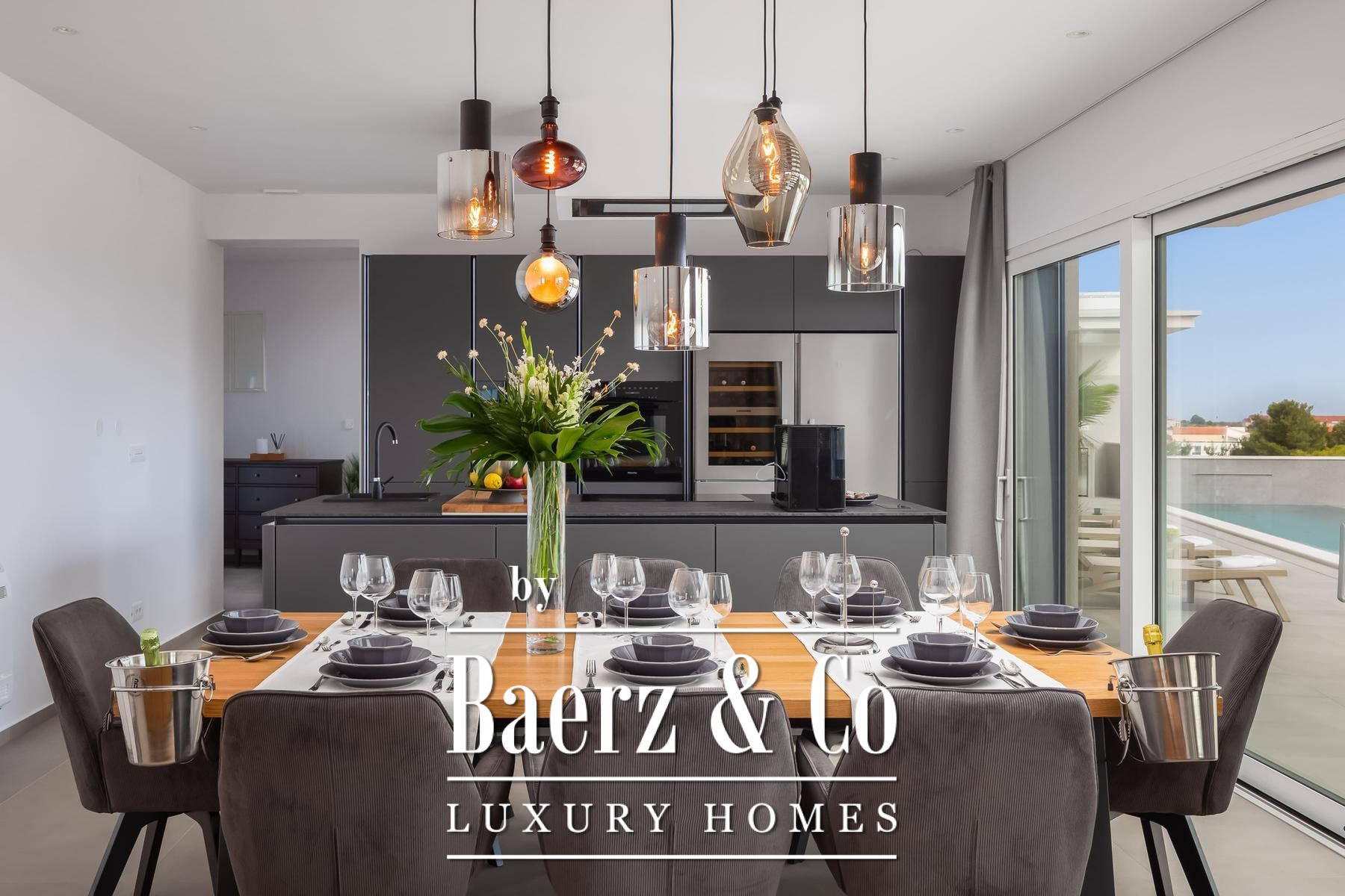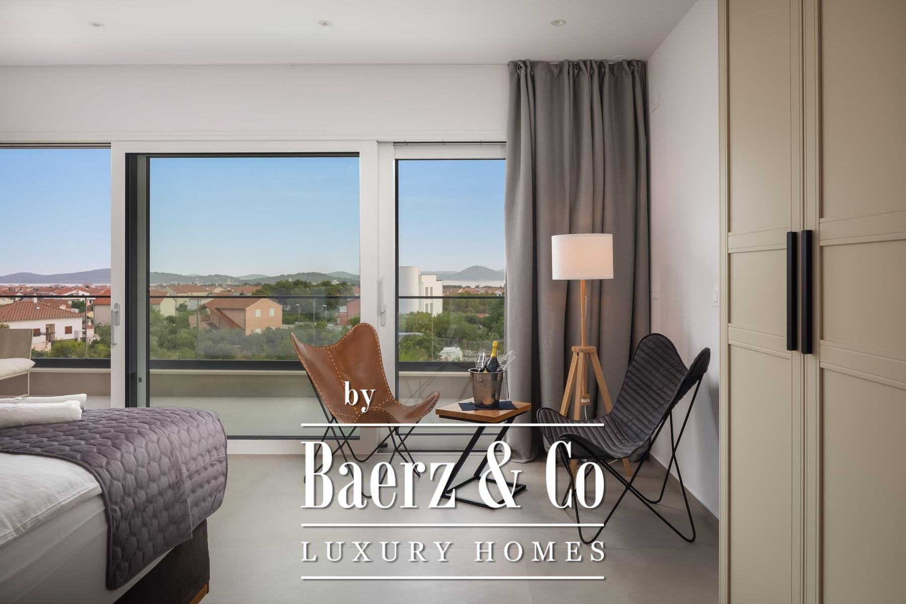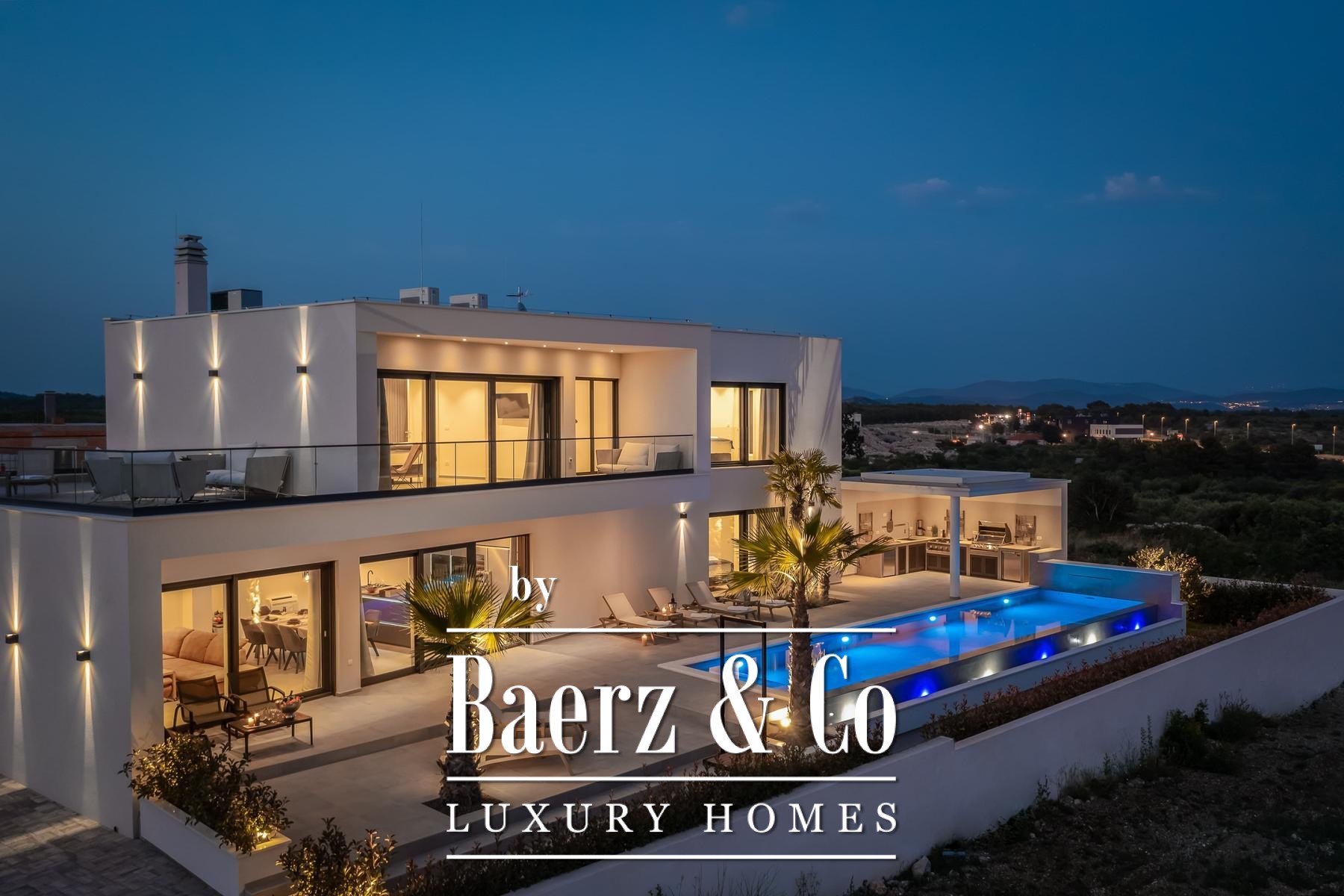 Vodice, modern villa with a swimming pool and sea view, 332.92 m2. The villa was built in 2022. It is being sold fully furnished and equipped, and is ideal for a vacation or tourist rental.Built on 2 floors on a plot of 838 m2. It consists of a ground floor with 2 bedrooms, each with its own bathroom, a garage, a toilet, and a spacious living room with a kitchen and dining room. The living room opens onto an outdoor terrace with a large heated pool next to which there is a sunbathing area, and a summer kitchen equipped with top-quality appliances. On the first floor there are three more bedrooms, each with its own bathroom, and a laundry room with a washing machine and two dryers. The bedrooms open onto