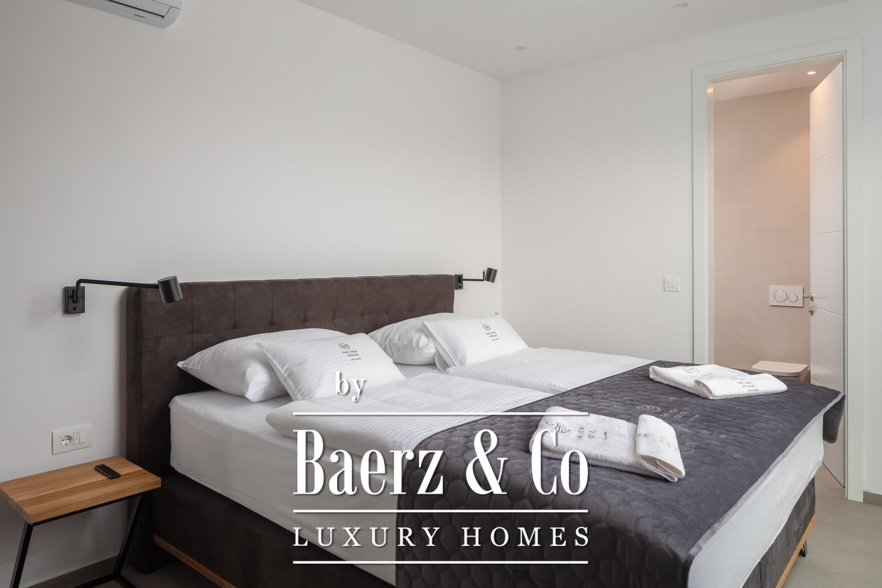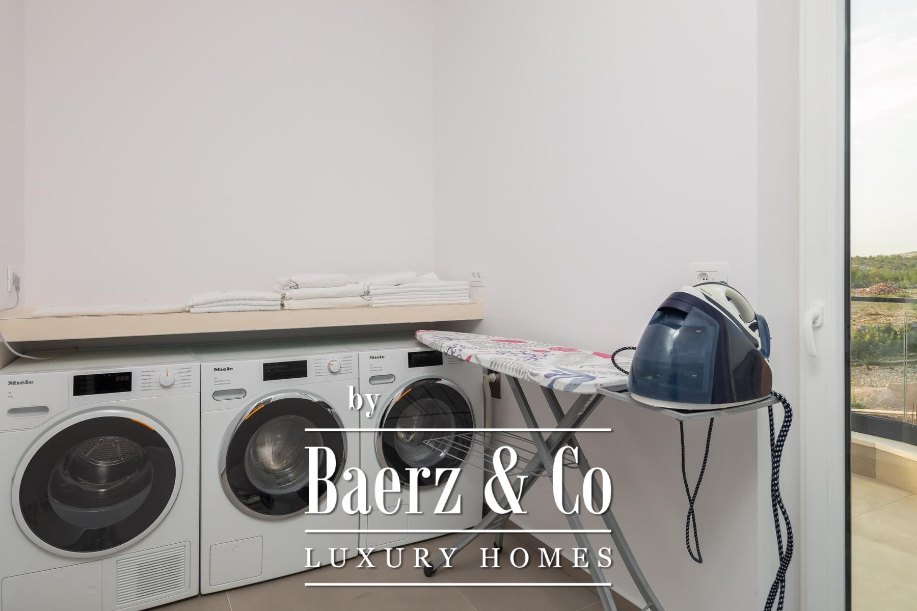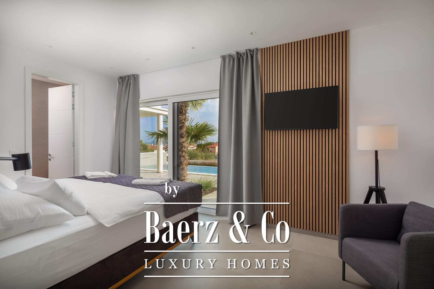 Vodice, modern villa with a swimming pool and sea view, 332.92 m2. The villa was built in 2022. It is being sold fully furnished and equipped, and is ideal for a vacation or tourist rental.Built on 2 floors on a plot of 838 m2. It consists of a ground floor with 2 bedrooms, each with its own bathroom, a garage, a toilet, and a spacious living room with a kitchen and dining room. The living room opens onto an outdoor terrace with a large heated pool next to which there is a sunbathing area, and a summer kitchen equipped with top-quality appliances. On the first floor there are three more bedrooms, each with its own bathroom, and a laundry room with a washing machine and two dryers. The bedrooms open onto