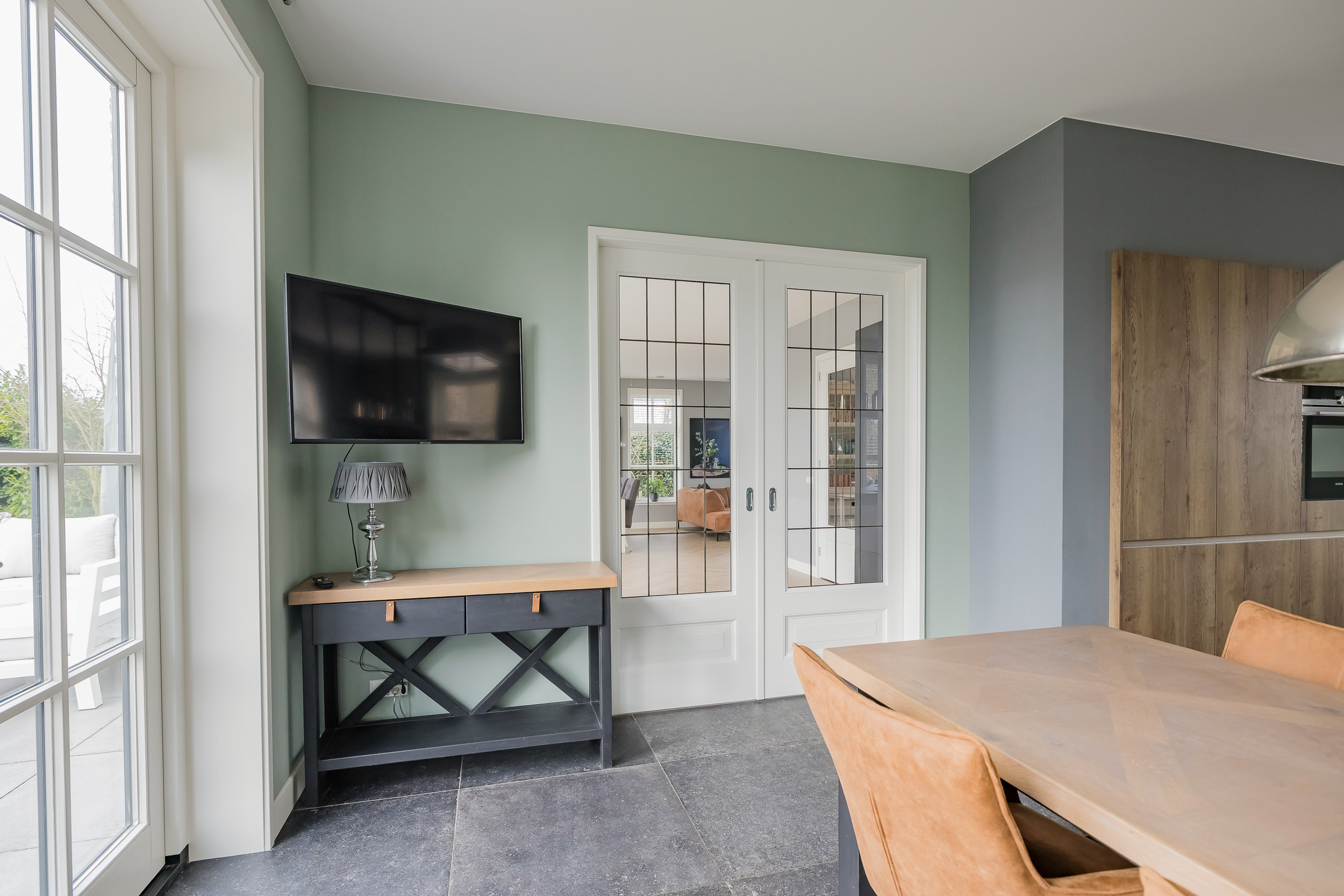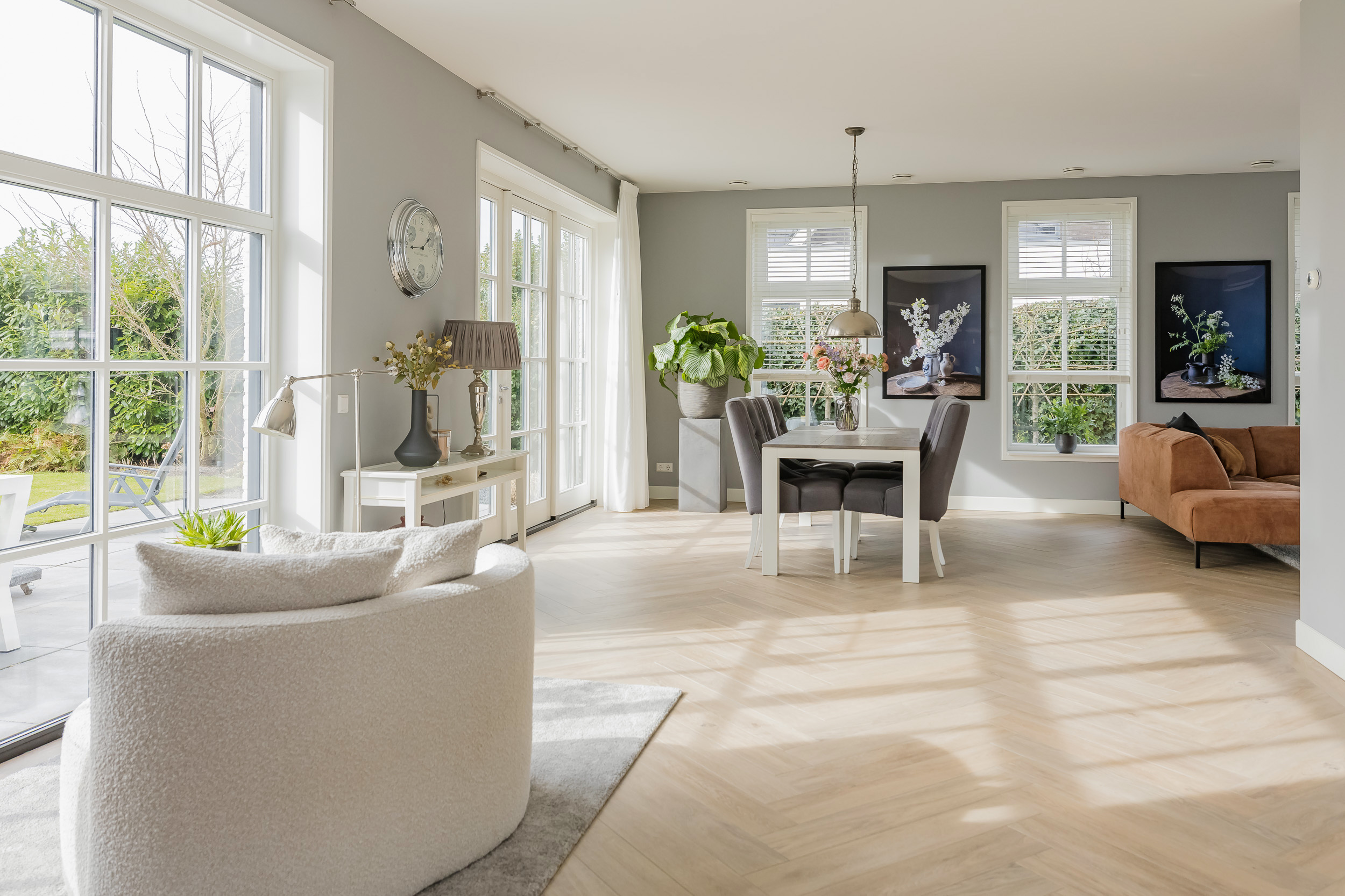 The living room is spacious and bright thanks to the large windows with white muntin bars and French doors leading to the terrace and the surrounding garden. The floor features stylish light wood flooring. At the rear, you can enjoy a fantastic unobstructed view of the bulb fields.