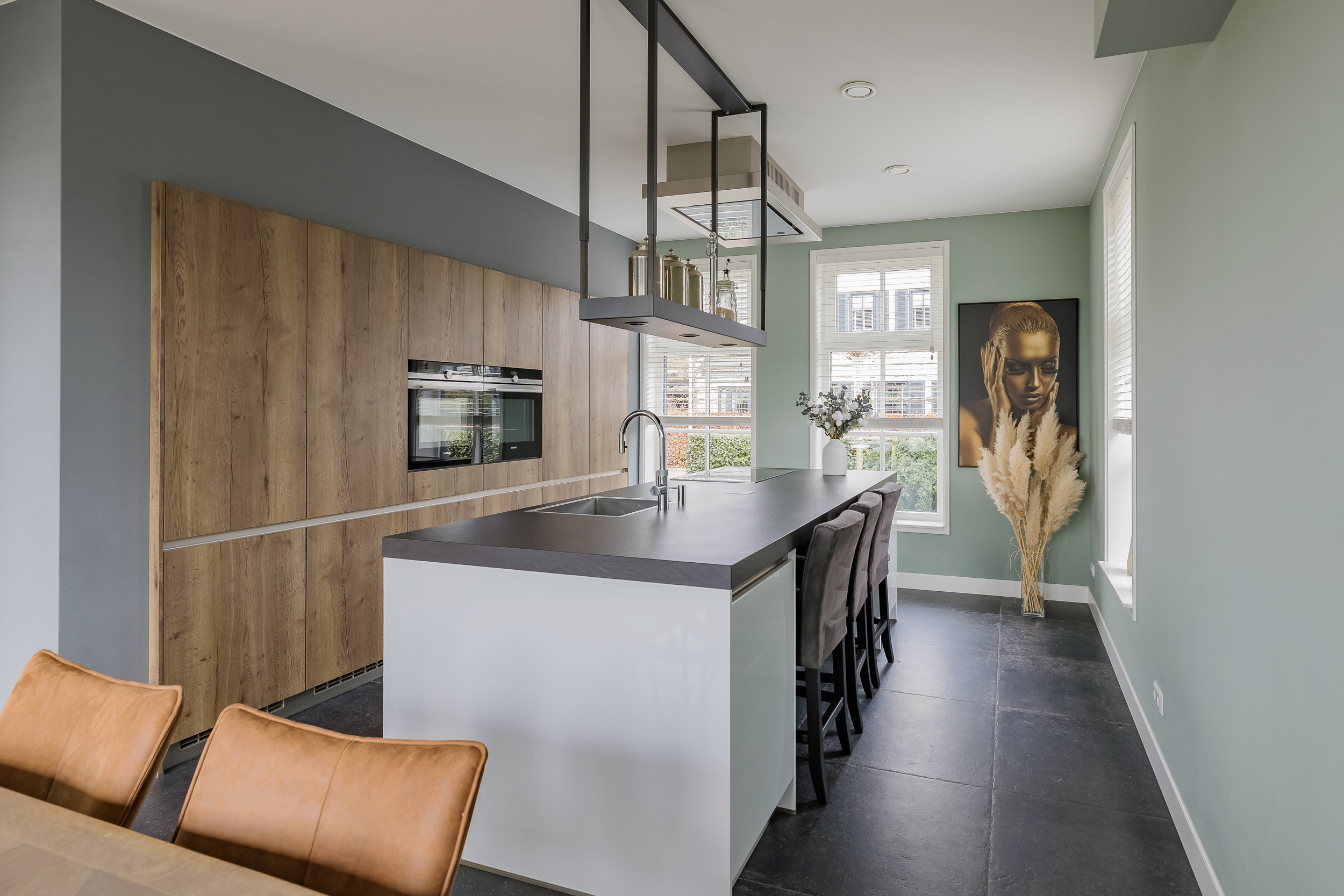 Sliding doors lead to the beautiful kitchen with a cooking island. Adjacent to this is the utility room with space for laundry appliances and a door to the office area on the ground floor: ideal for working from home.