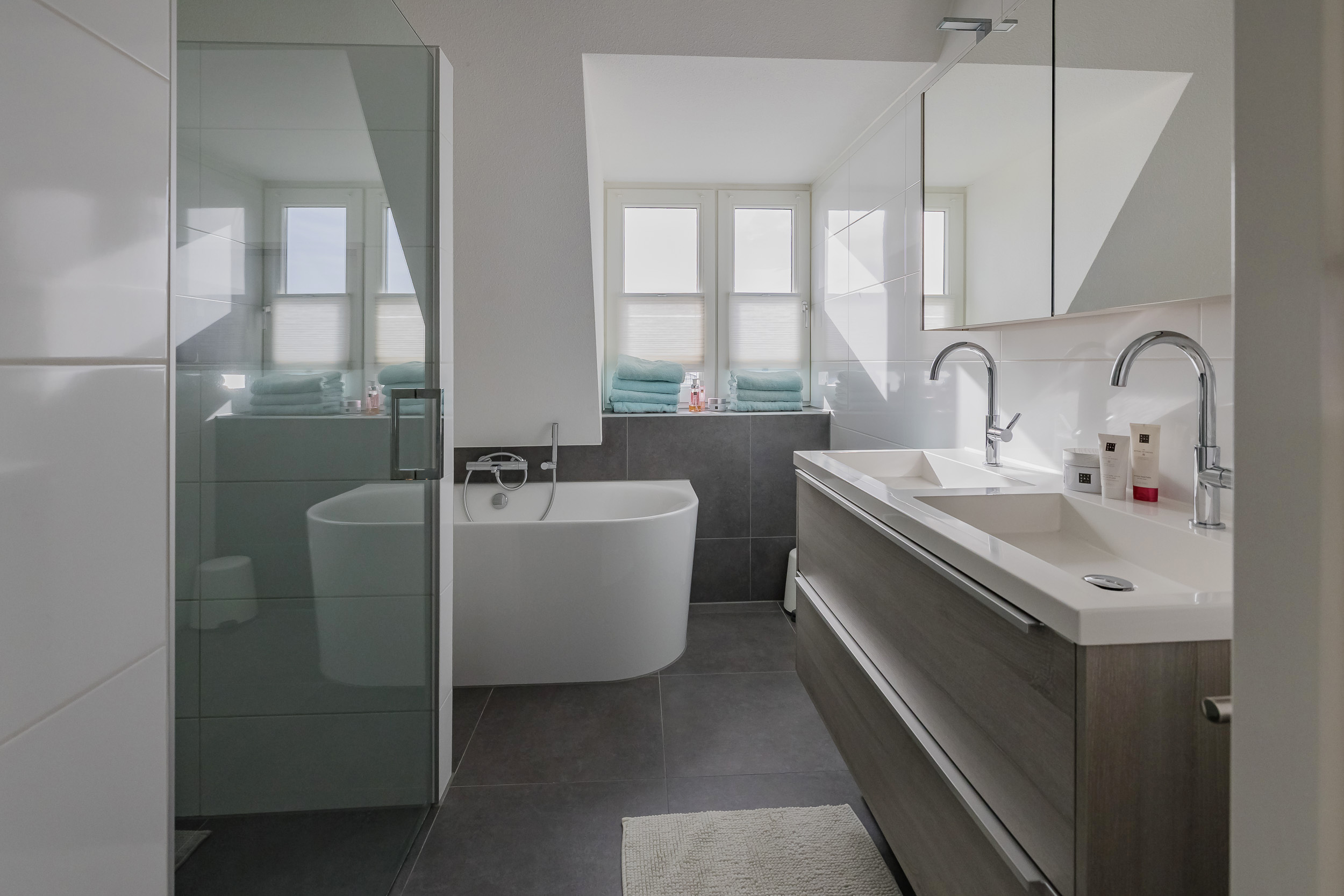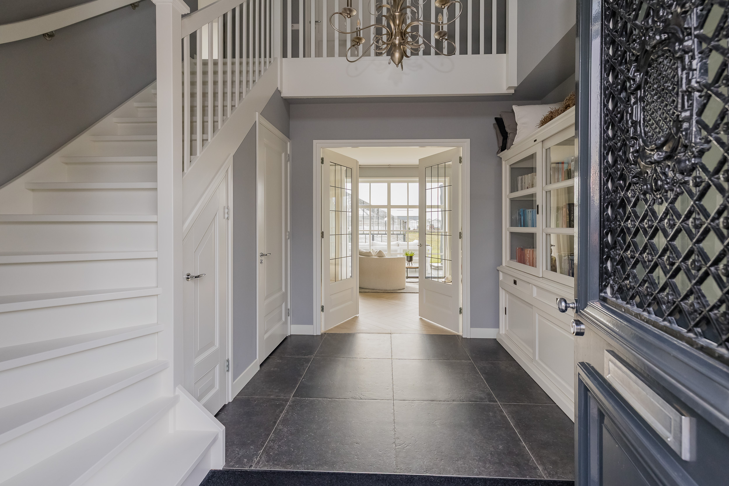 As soon as you step inside, you’ll experience the tranquility and high-quality finishes. The impressive entryway with a loft opens onto the spacious living room. Everywhere you look, you’ll see sleek, tone-on-tone finishes in shades of gray combined with plenty of white, creating a bright and modern atmosphere.