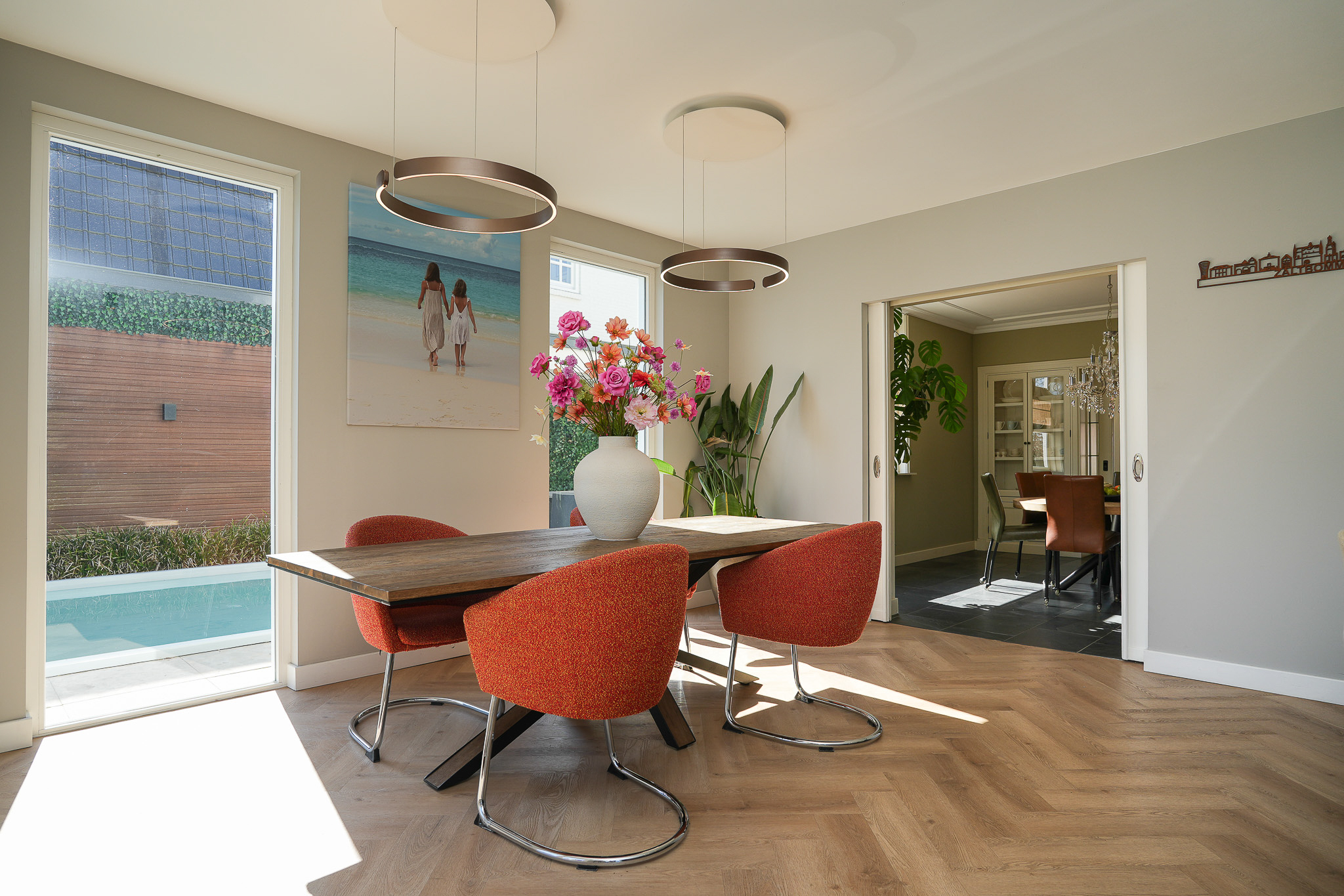 Double en suite doors with stained glass, flanked by built-in cupboards, lead to the rear room, which connects directly to the kitchen-diner. This kitchen-diner is located in the extension completed in 2021/2022 and is fully oriented towards the garden. It forms the heart of the home, with views of the garden and direct access outside.