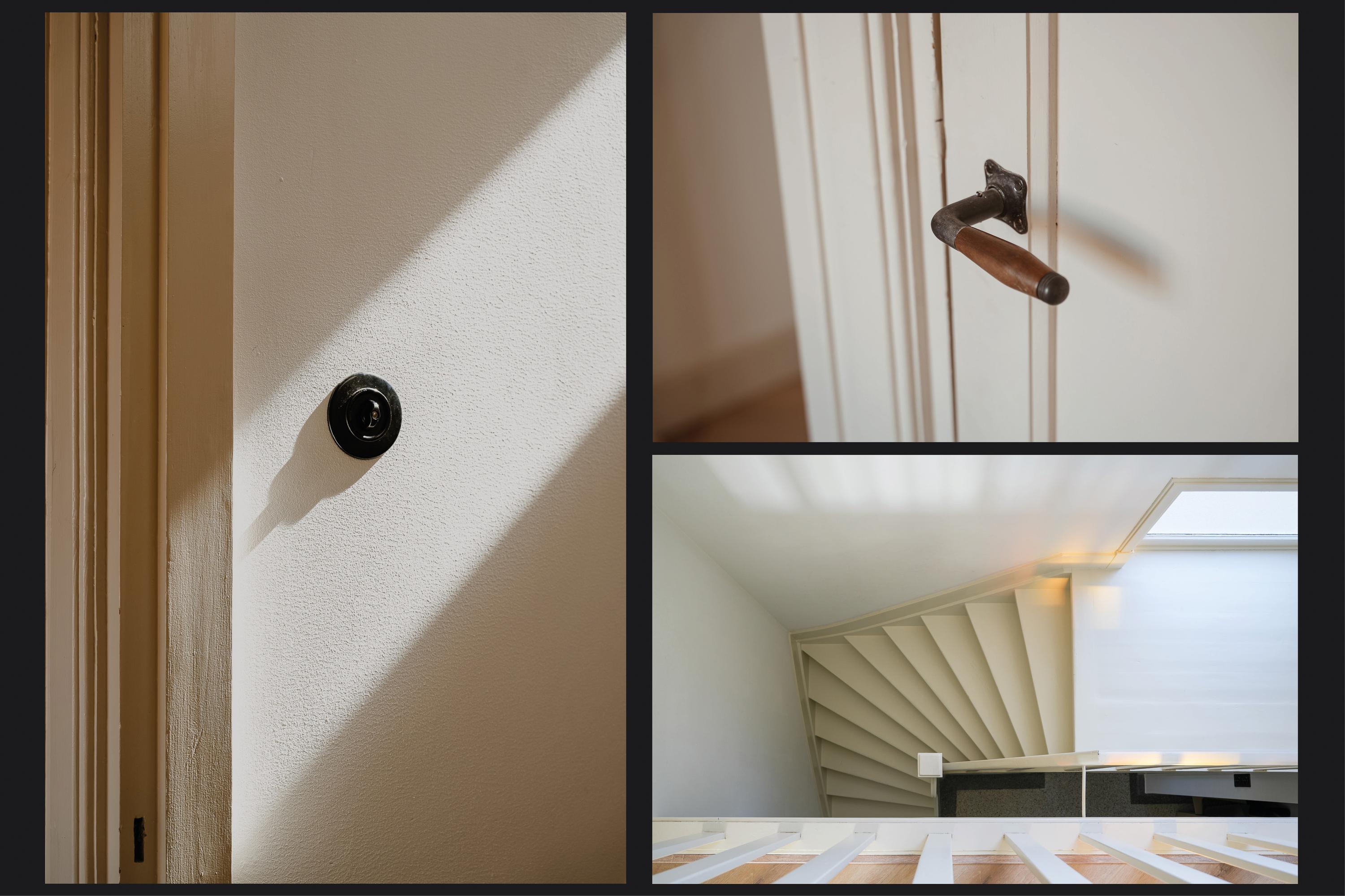 The landing reflects the care and attention given to the renovation. The new extension blends seamlessly with the original architecture. There is also a separate toilet on this level. In the rear extension is a bedroom with balcony, a luxurious open bathroom and a walk-in closet. The bathroom is fitted with a semi-freestanding bathtub, a spacious walk-in shower with rainfall shower and a stylish vanity unit. The wall behind the vanity is finished with hexagonal mosaic tiles, while the shower and bath areas feature concrete ciré finishes. Thanks to its east-facing position, the morning sun enters here, and the balcony is directly accessible from the bedroom.