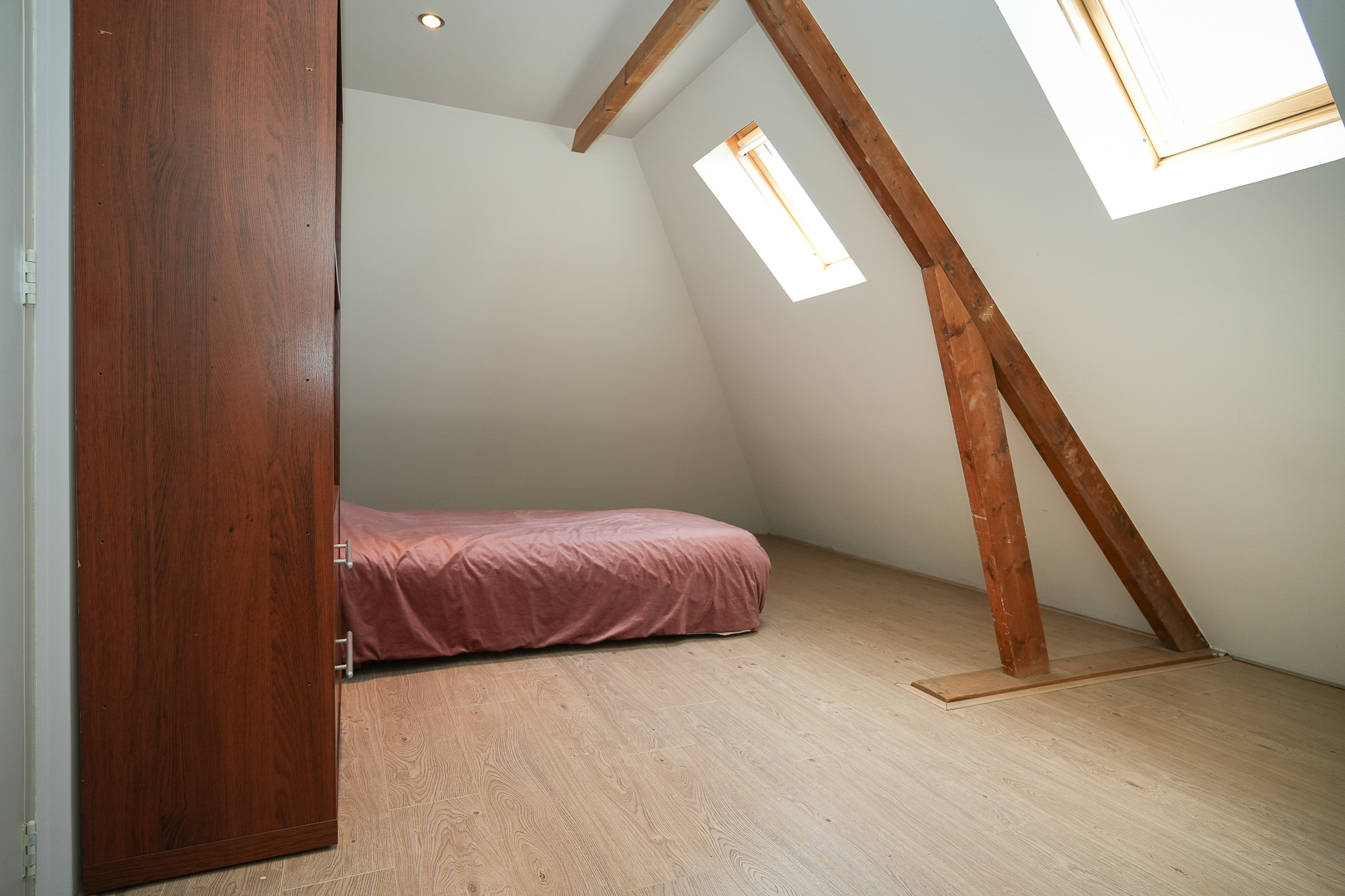 This floor offers two additional bedrooms, both located beneath the insulated roof and finished with smooth plasterwork. The front bedroom features a wide dormer window, while the rear bedroom is fitted with two roof windows. The floor is finished with PVC.