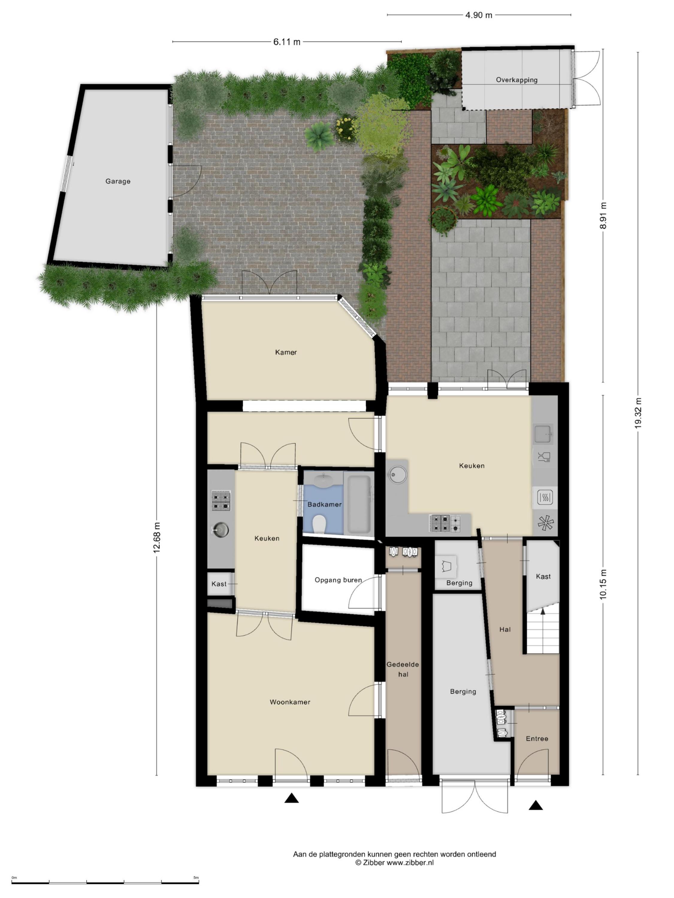 Entree met meterkast. Hal met wasmachineopstelling, trap naar de 1e etage en binnendoor naar de berging en de keuken. Ruime woonkeuken met inbouwapparatuur en openslaande deuren naar de tuin. Doorgang binnendoor naar nr. 10.