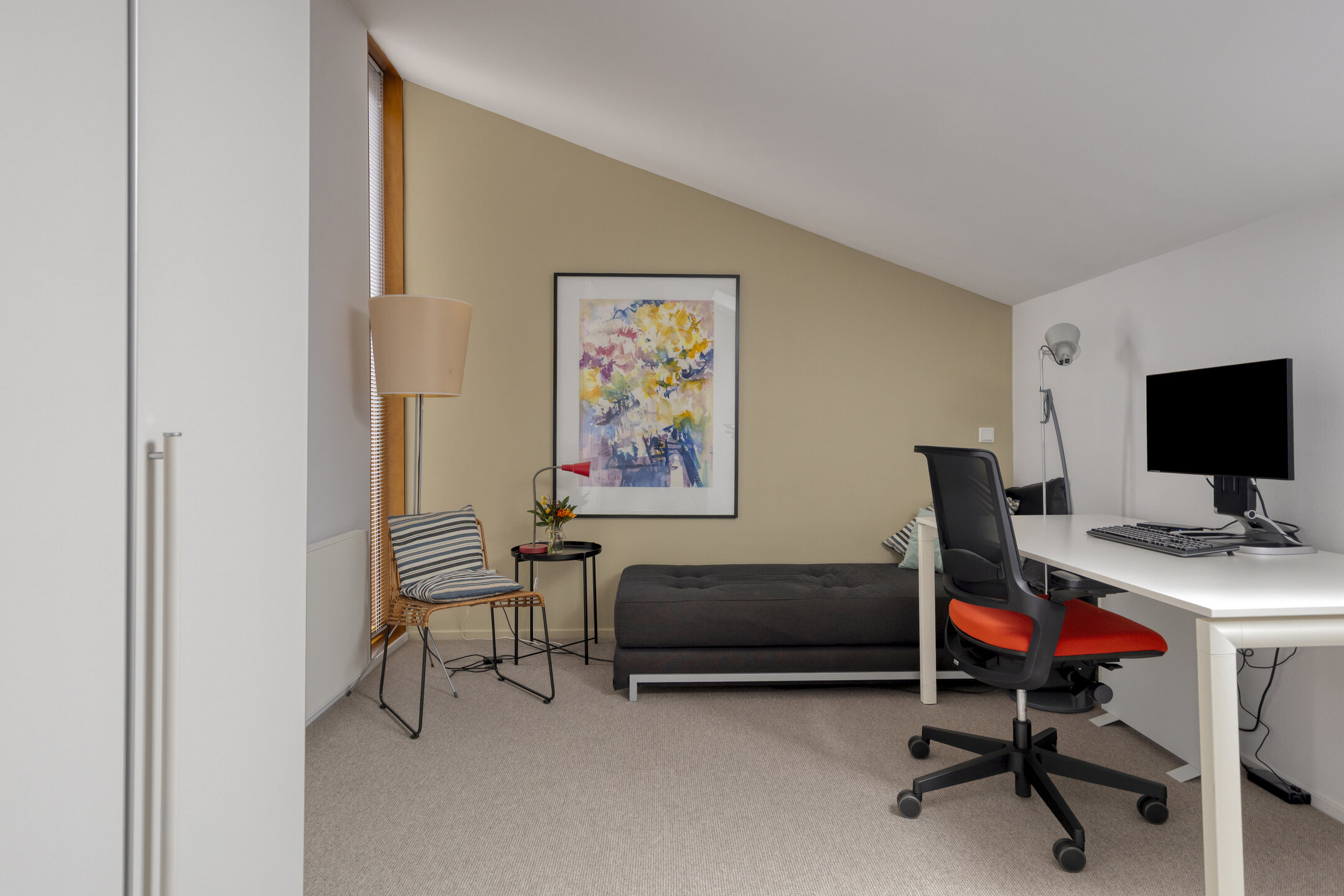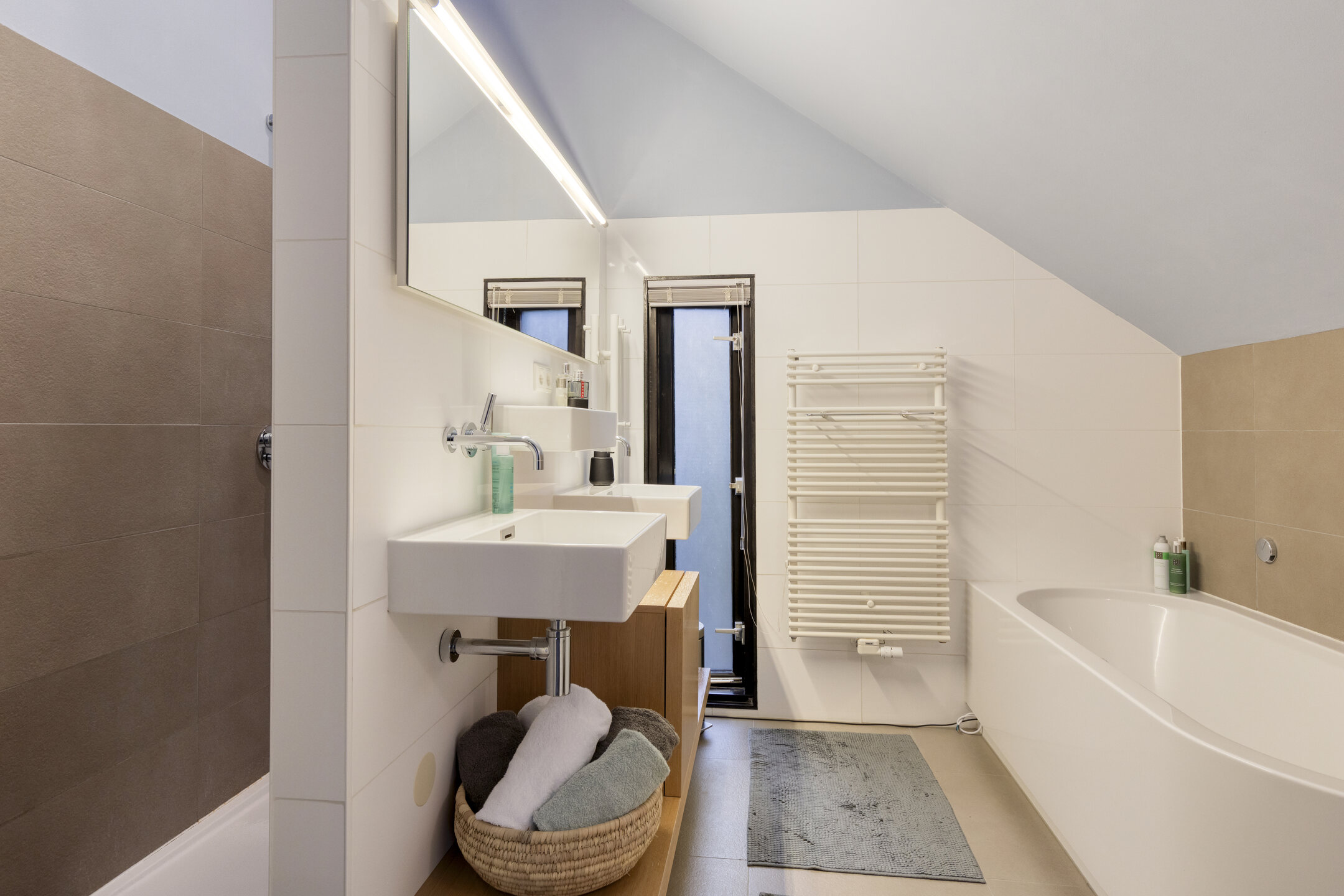 En la planta superior, la suite principal cuenta con baño privado con bañera y ducha a ras de suelo, mientras los dormitorios secundarios mantienen la sensación de amplitud y luz. Entre los equipamientos técnicos destacan la ventilación mecánica, calefacción por suelo radiante y conexión de fibra óptica, reflejando la completa modernización y excelente estado de conservación.