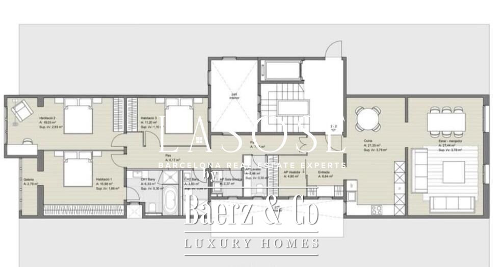 Le cœur de l’appartement s’articule autour de la cuisine ouverte et de l’espace repas, équipés d’appareils modernes, qui donnent naturellement sur un vaste salon baigné de lumière et une grande salle à manger. De larges fenêtres laissent entrer la lumière de Barcelone, instaurant une atmosphère paisible, à l’écart de l’effervescence urbaine. Chauffage central, climatisation et buanderie offrent un confort optimal, rehaussés par des placards intégrés, un ascenseur et un balcon ouvrant de belles vues et une perspective unique sur la ville.