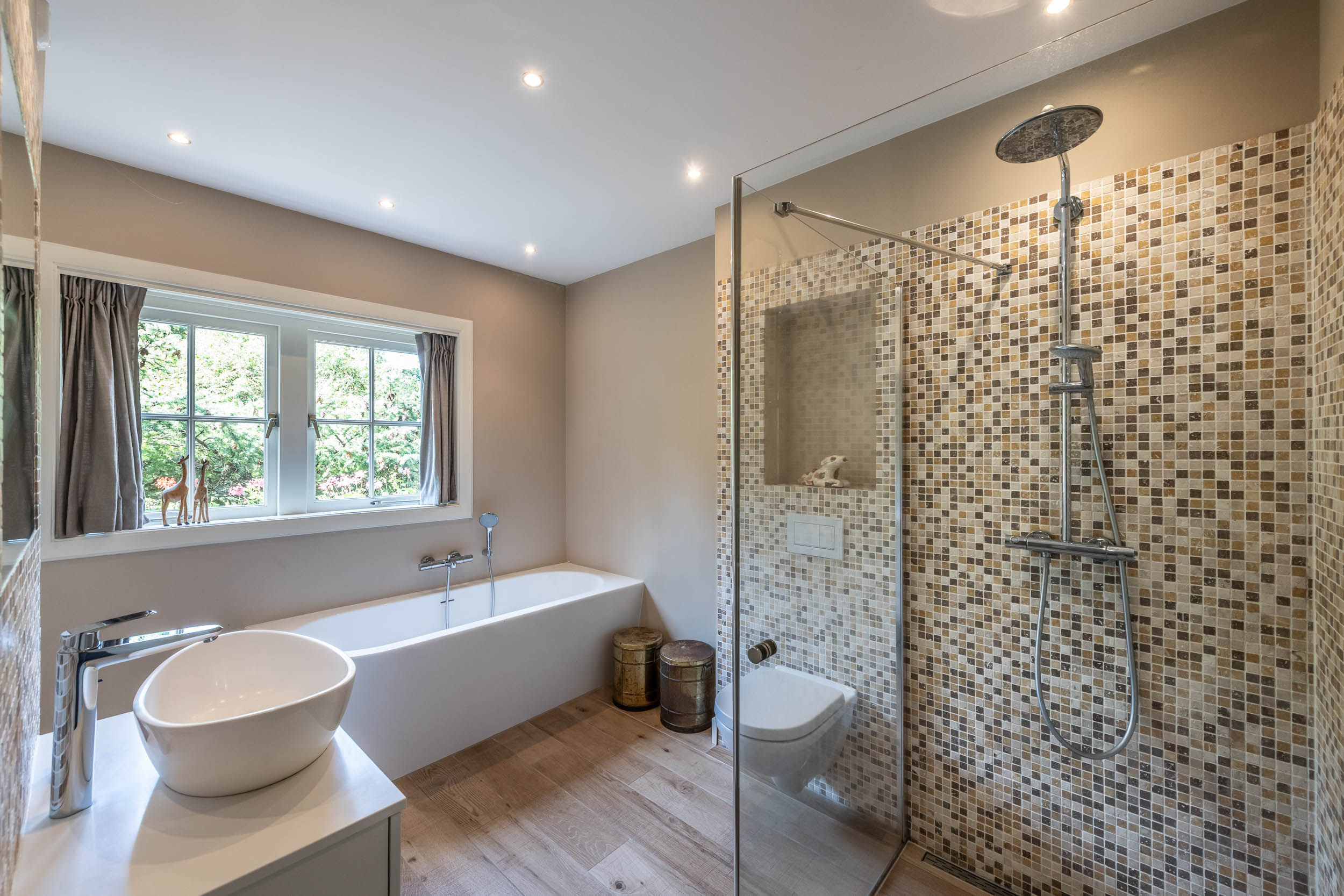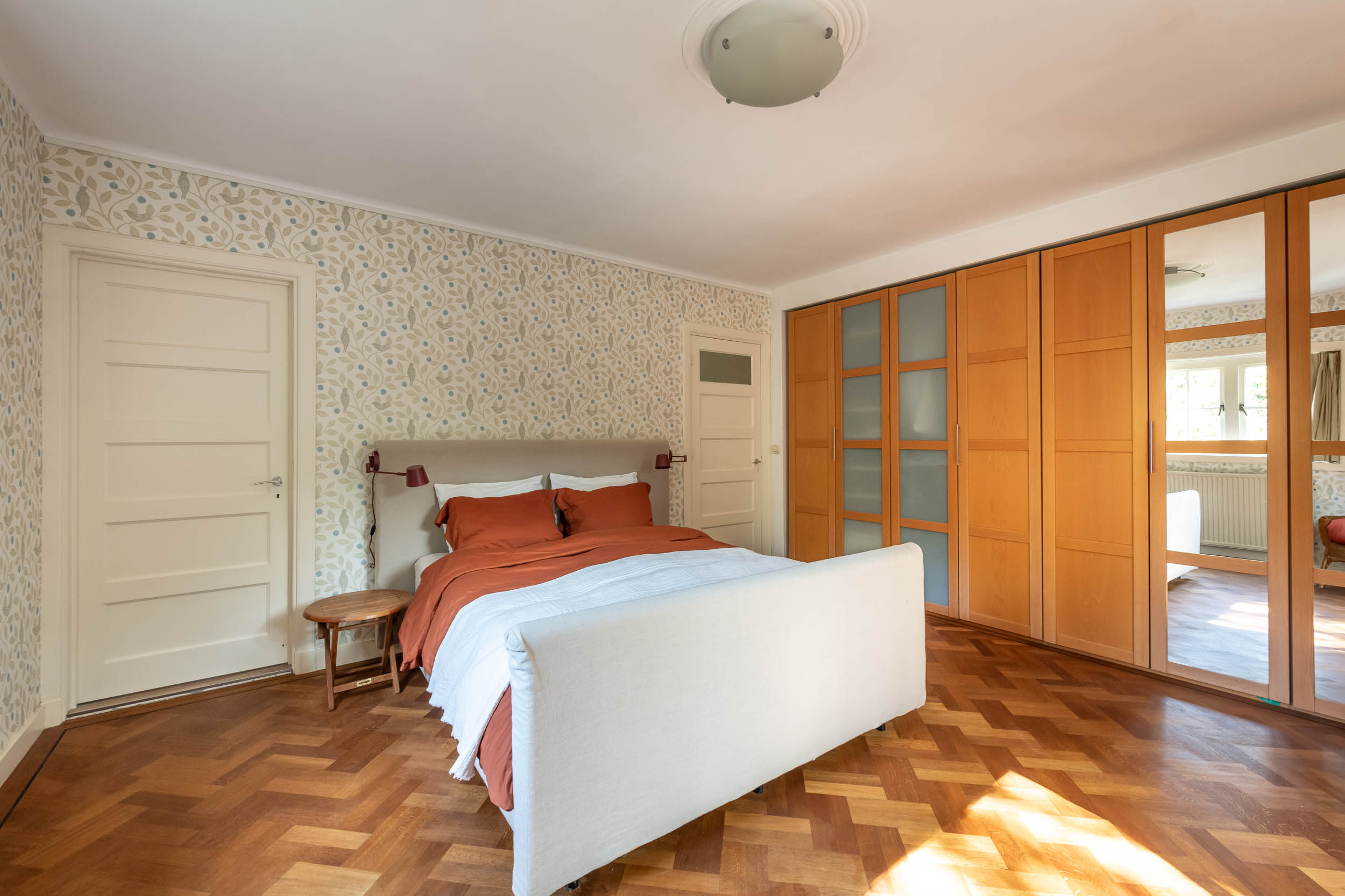 Overloop, aan achterzijde de masterbedroom met kastenwand over de gehele breedte, balkon en toegang tot de badkamer, aan voorzijde een grote slaapkamer met toegang tot het dakterras, derde slaapkamer aan voorzijde. Badkamer met inloopdouche, wc, wastafelmeubel en fraai vrijstaand ligbad.