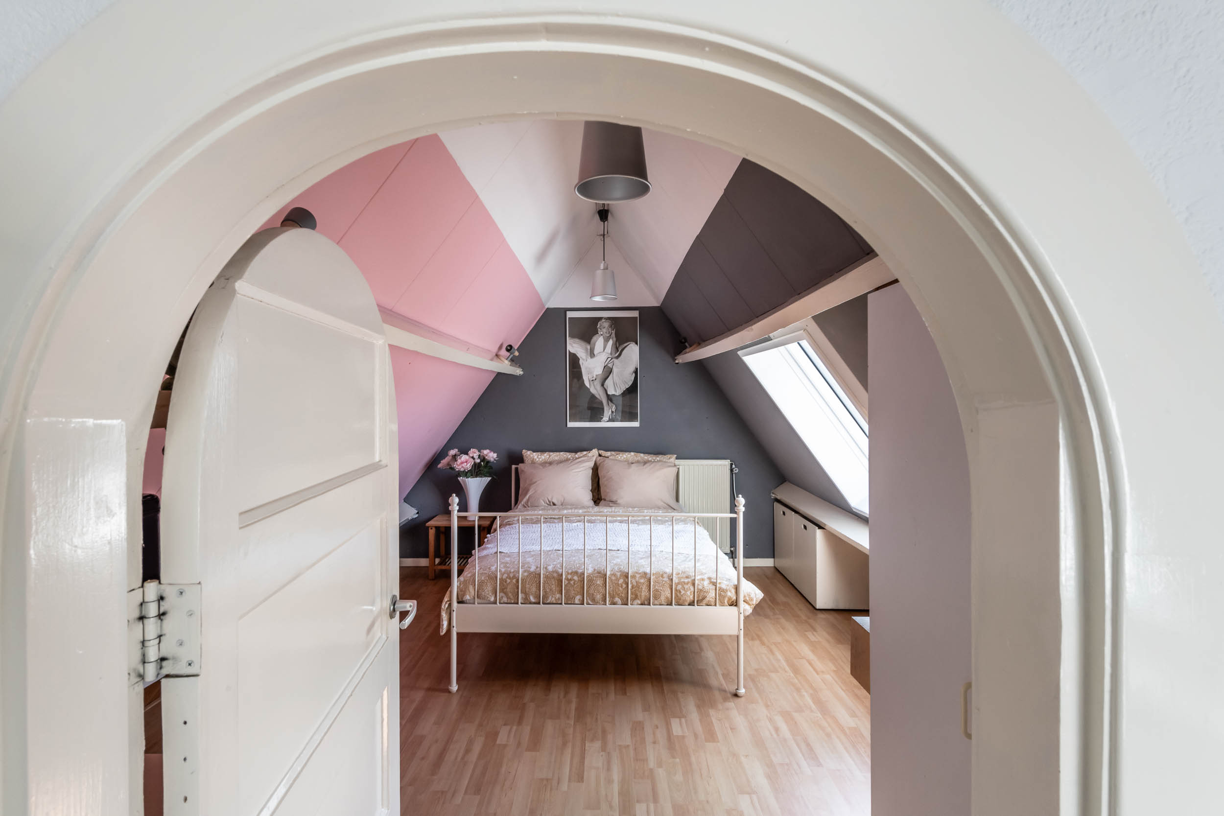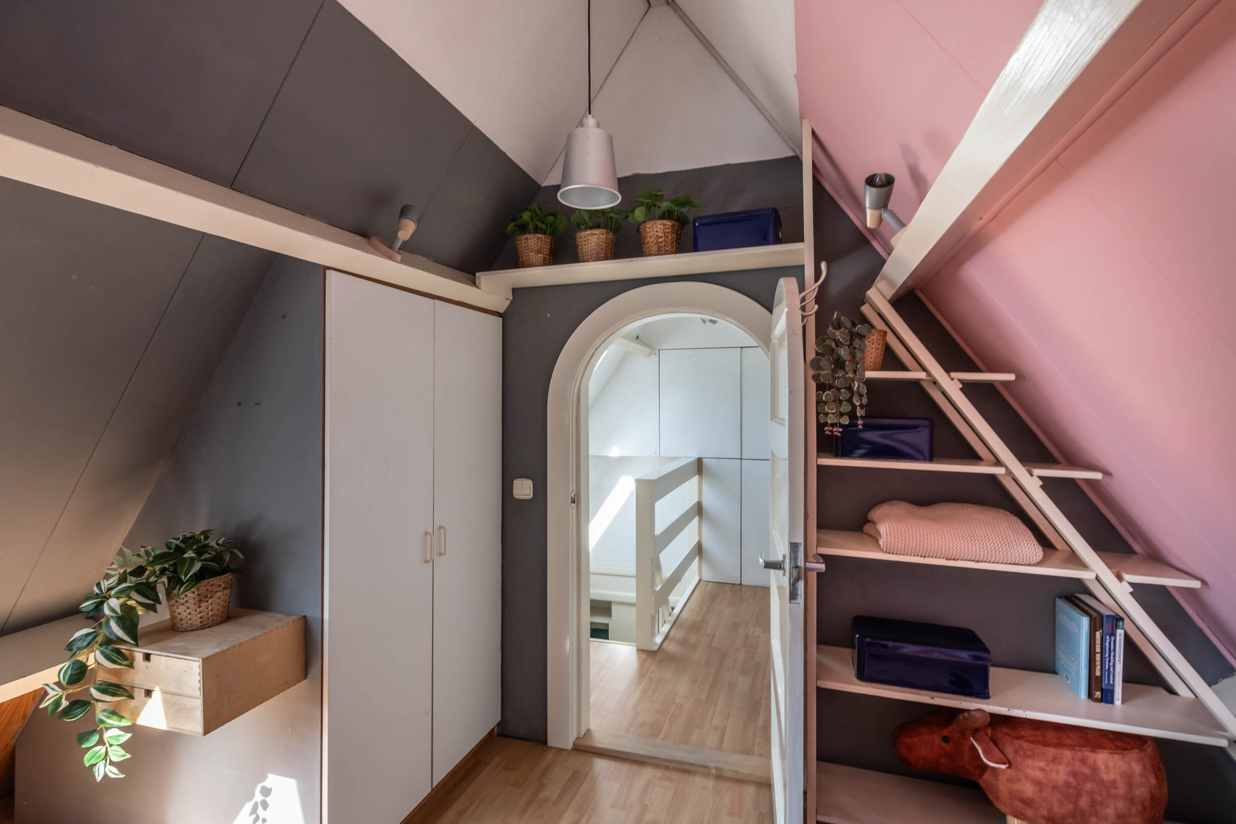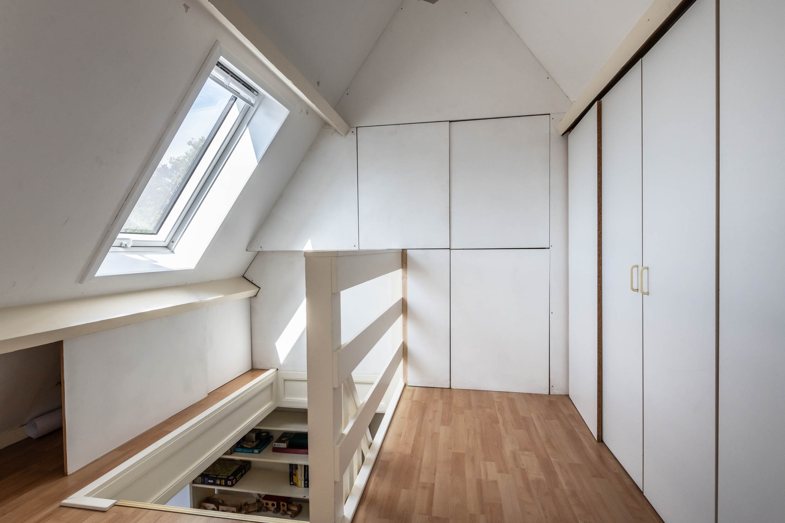 Overloop met kastruimte en CV-ketel (2025), grote, nok-hoge slaapkamer met Veluxraam