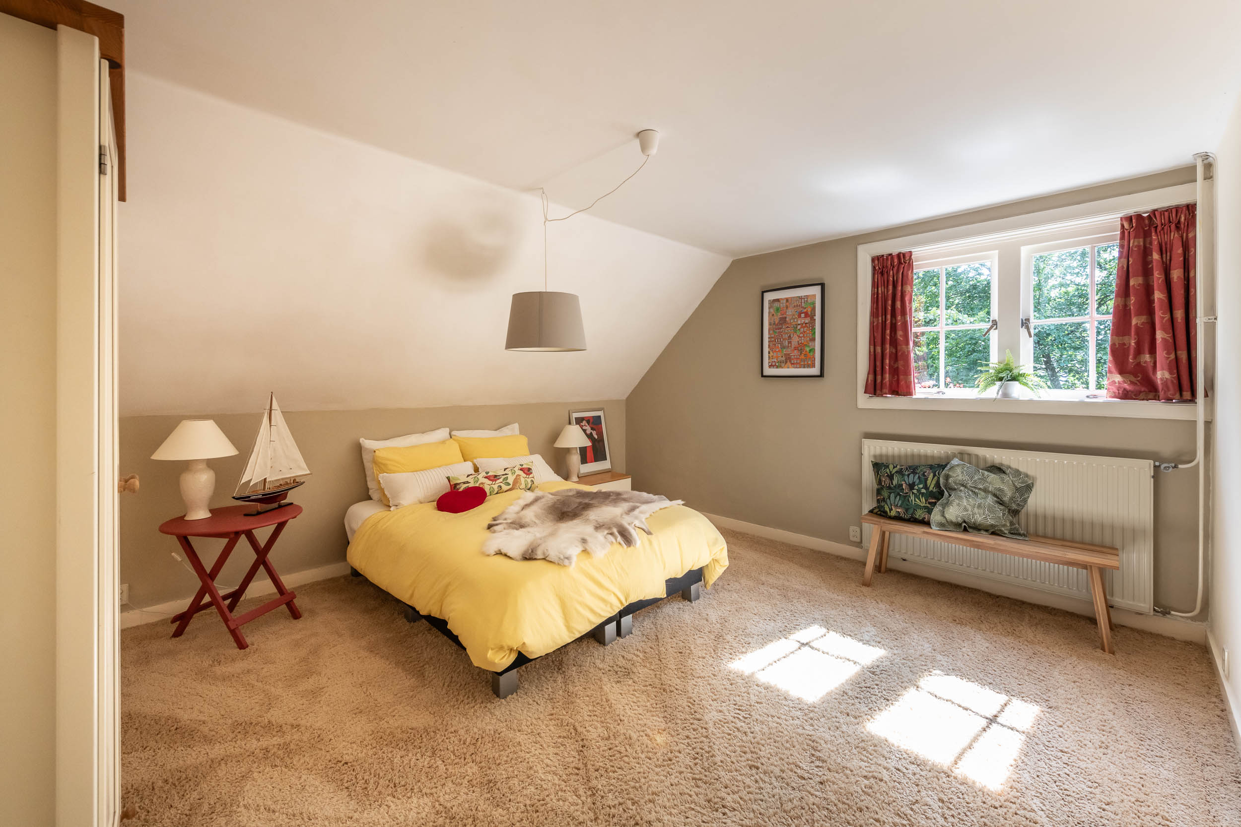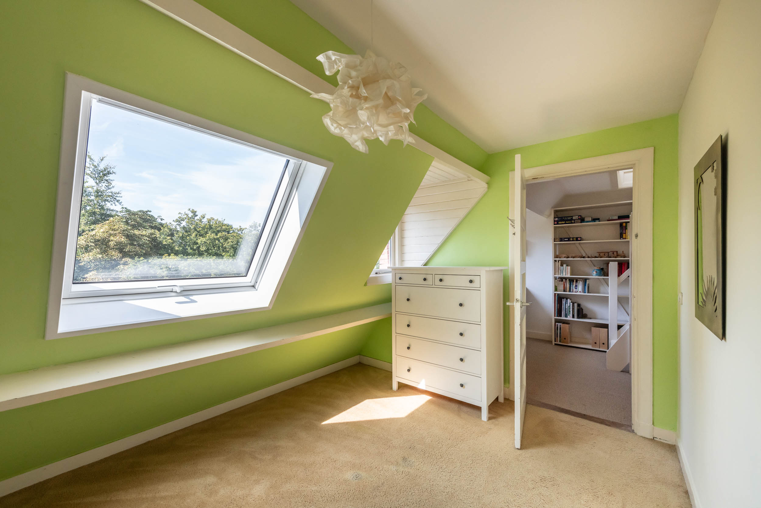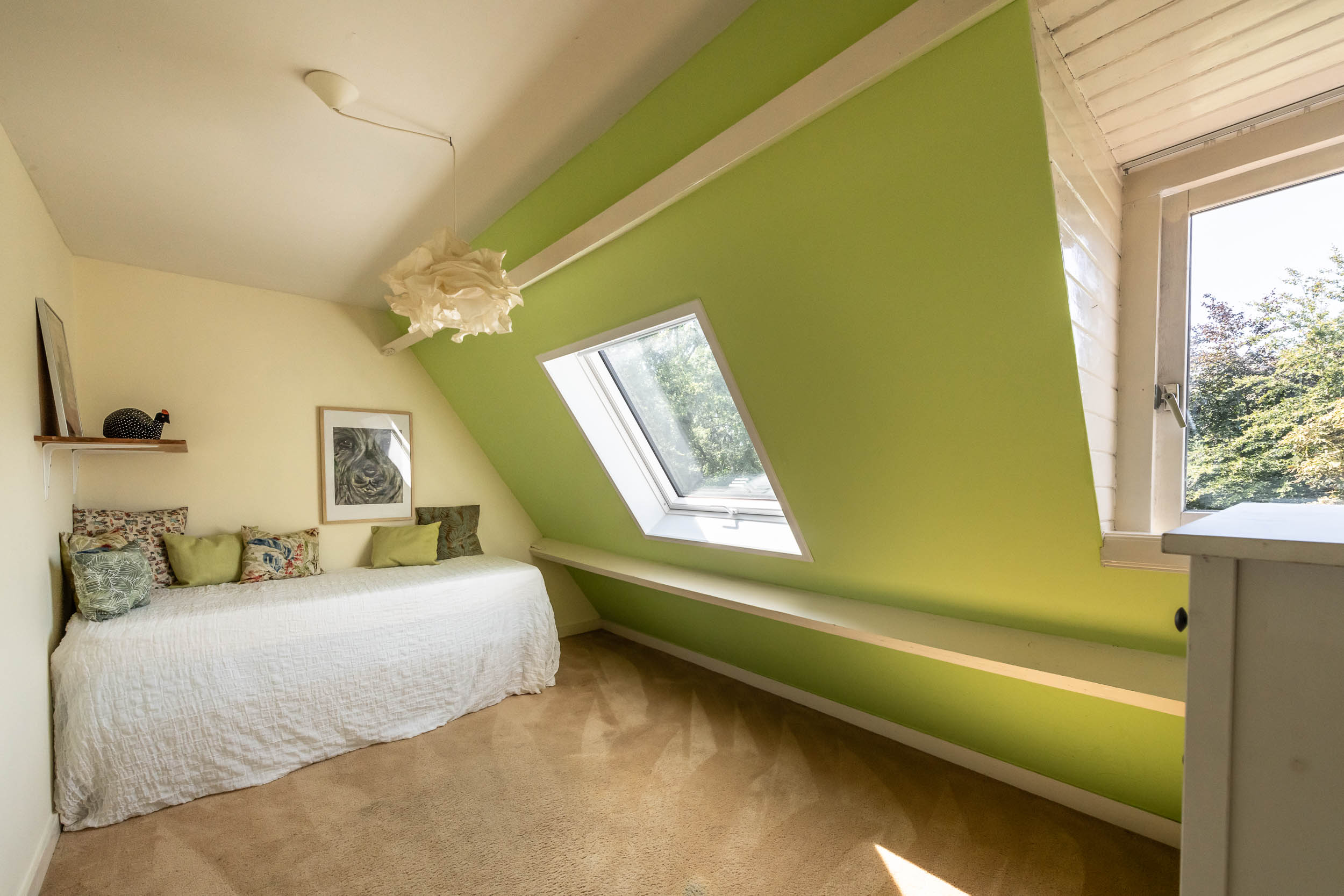 Overloop met kastruimte en CV-ketel (2025), grote, nok-hoge slaapkamer met Veluxraam