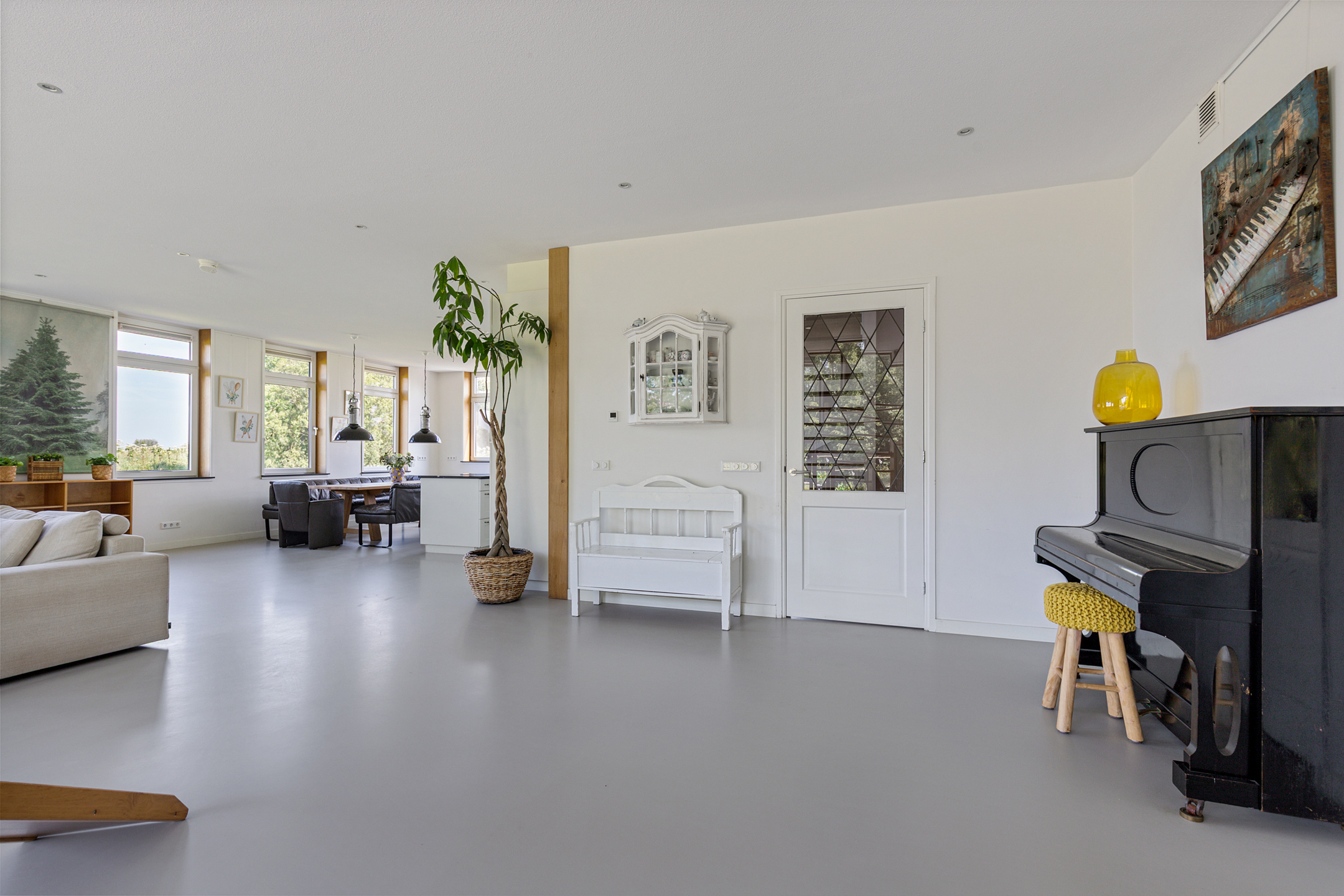 De living is een oase van licht, ruimte en uitzicht. Hoge schuifpuien zorgen voor een naadloze overgang naar terras en tuin, met directe zichtlijnen op het water en de groene omgeving. De open keuken met spoeleiland en veel kastruimte vormt het hart van de woning: hier dineert u met vrienden en familie terwijl u uitkijkt op een wisselend schouwspel van zeilboten en sloepen.