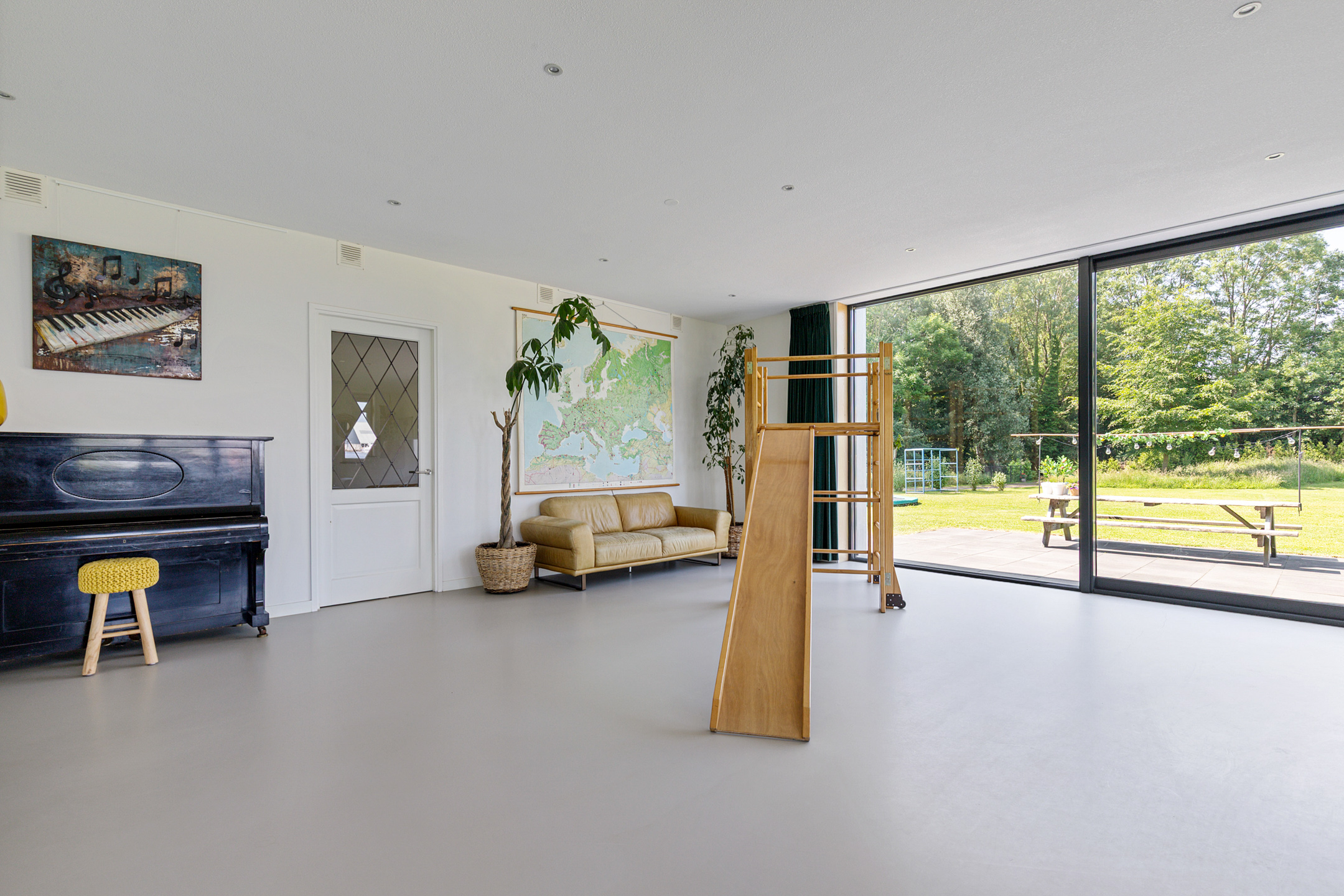 Grenzend aan de woonkamer bevindt zich een kantoor- of speelkamer met zicht op de tuin. De ruime bijkeuken is praktisch ingedeeld en voorzien van witgoedaansluitingen.