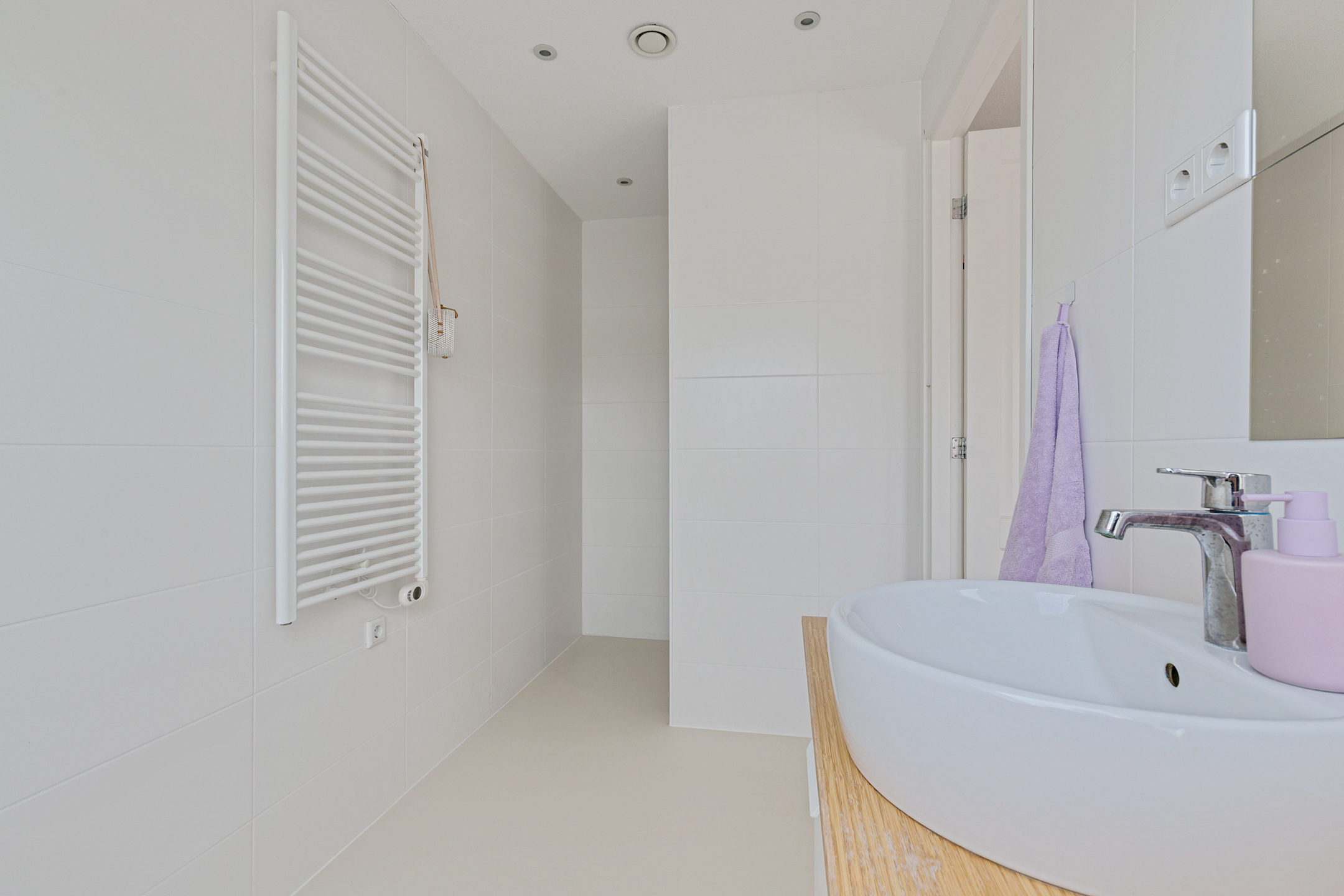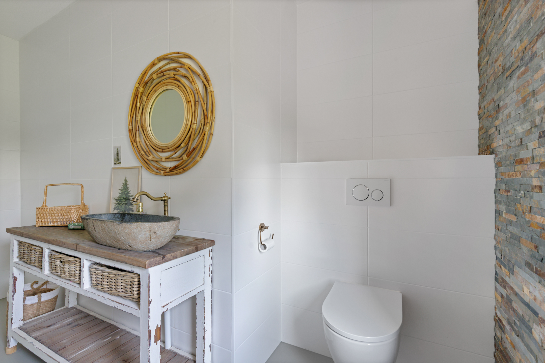 Twee slaapkamers beschikken over een eigen en-suite badkamer; twee andere slaapkamers delen een badkamer. De badkamers zijn modern en stijlvol ingericht met inloopdouche, wastafelmeubel en toilet.