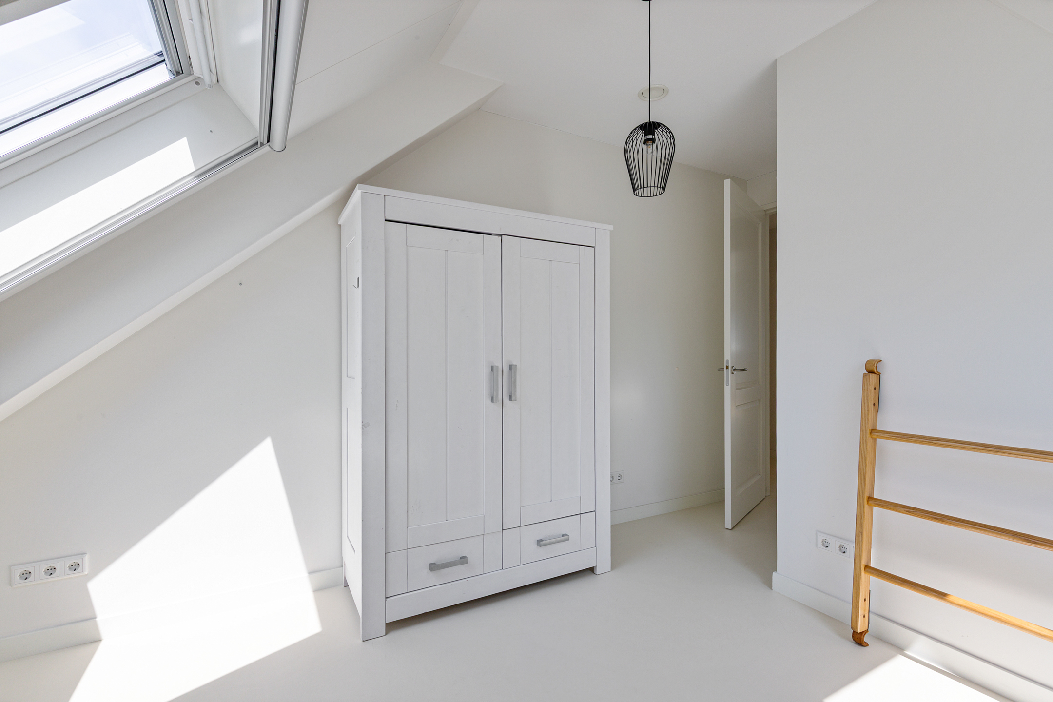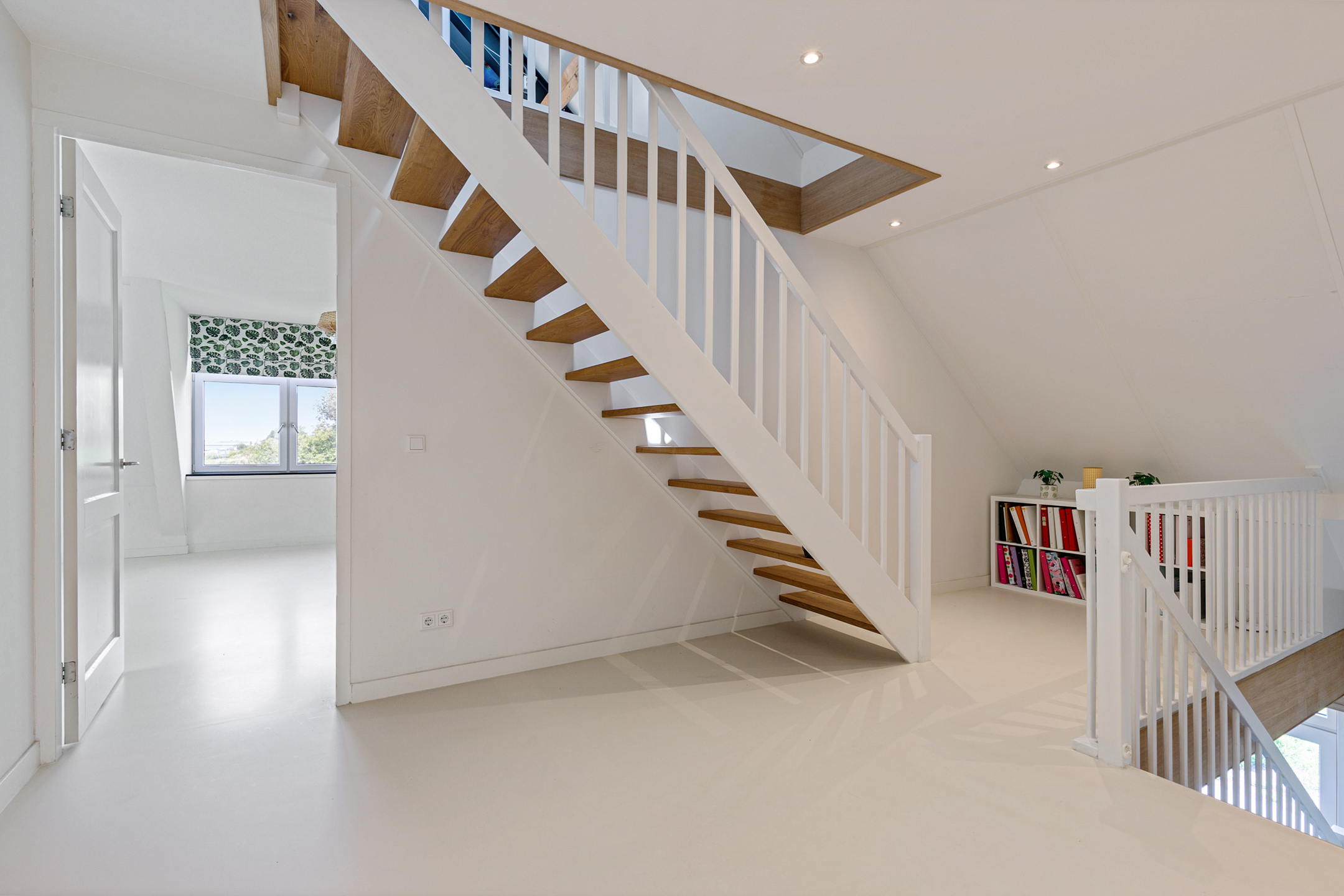 Via een vaste trap bereikt u de volledig geïsoleerde zolderverdieping met stahoogte over de volle lengte van de woning. Stoere stalen spanten en rustieke houten balken geven deze ruimte karakter. Met drie Velux dakramen is het hier licht en ruim. Ideaal als bergruimte of voor het creëren van extra woon- of werkvertrekken.