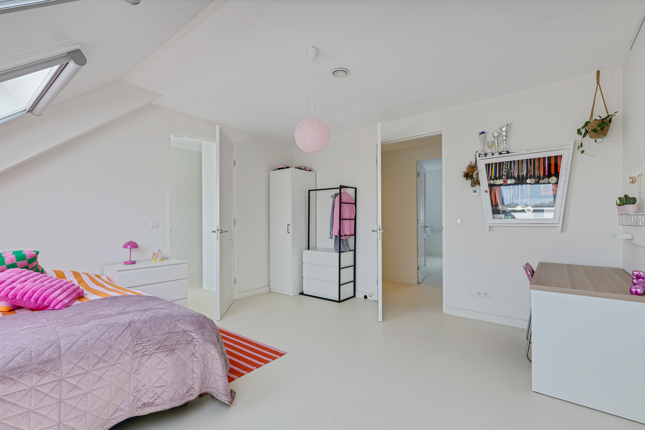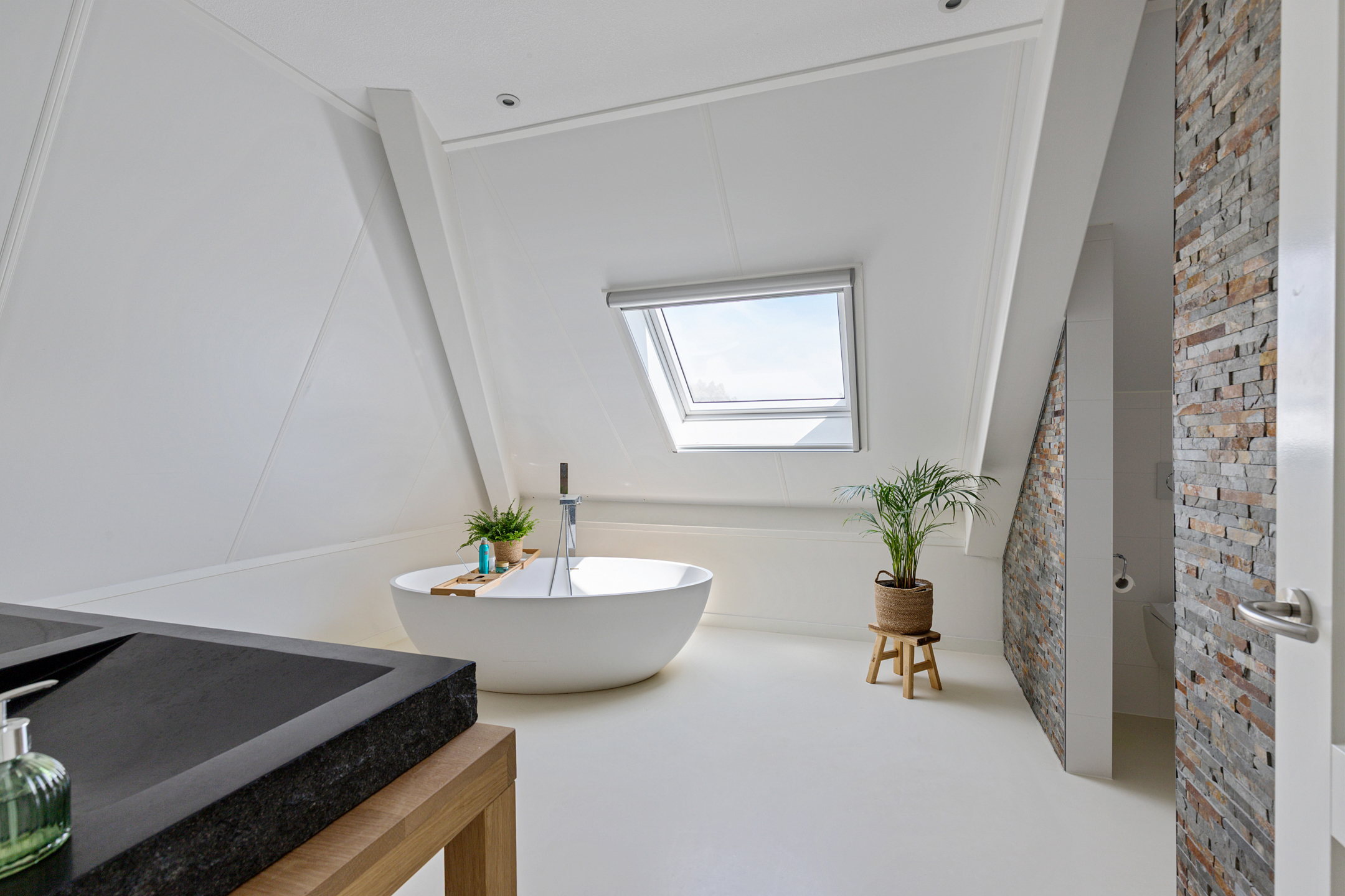 De master bedroom is een ware privésuite (46m2) met panoramisch uitzicht op het water via kamerhoge ramen in het zinken risaliet. Een extra dakkapel biedt zicht op het naastgelegen natuureiland. De luxe en-suite badkamer is voorzien van een vrijstaand ligbad, dubbele wastafel, toilet en inloopdouche. Hier wakker worden geeft elke dag energie.