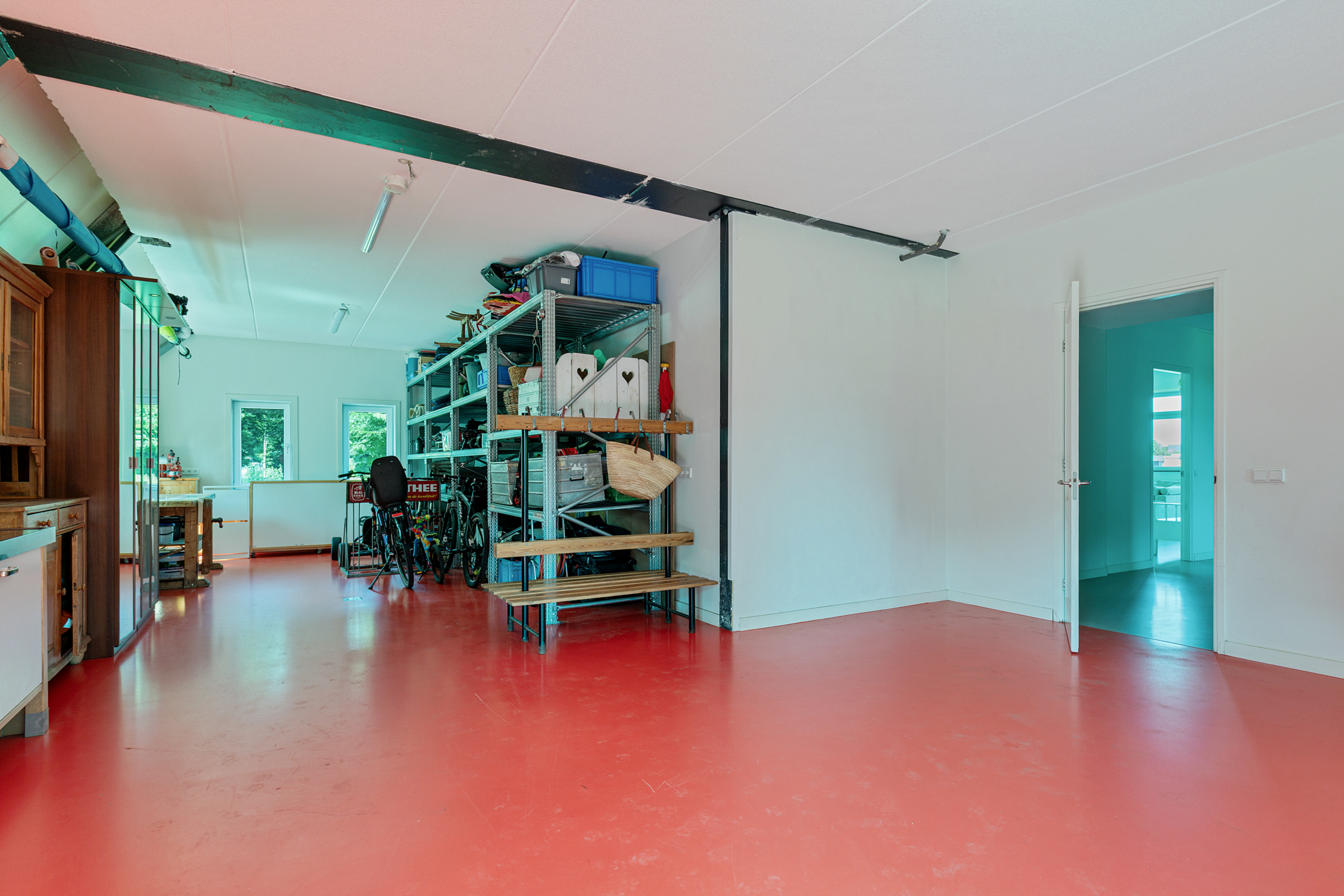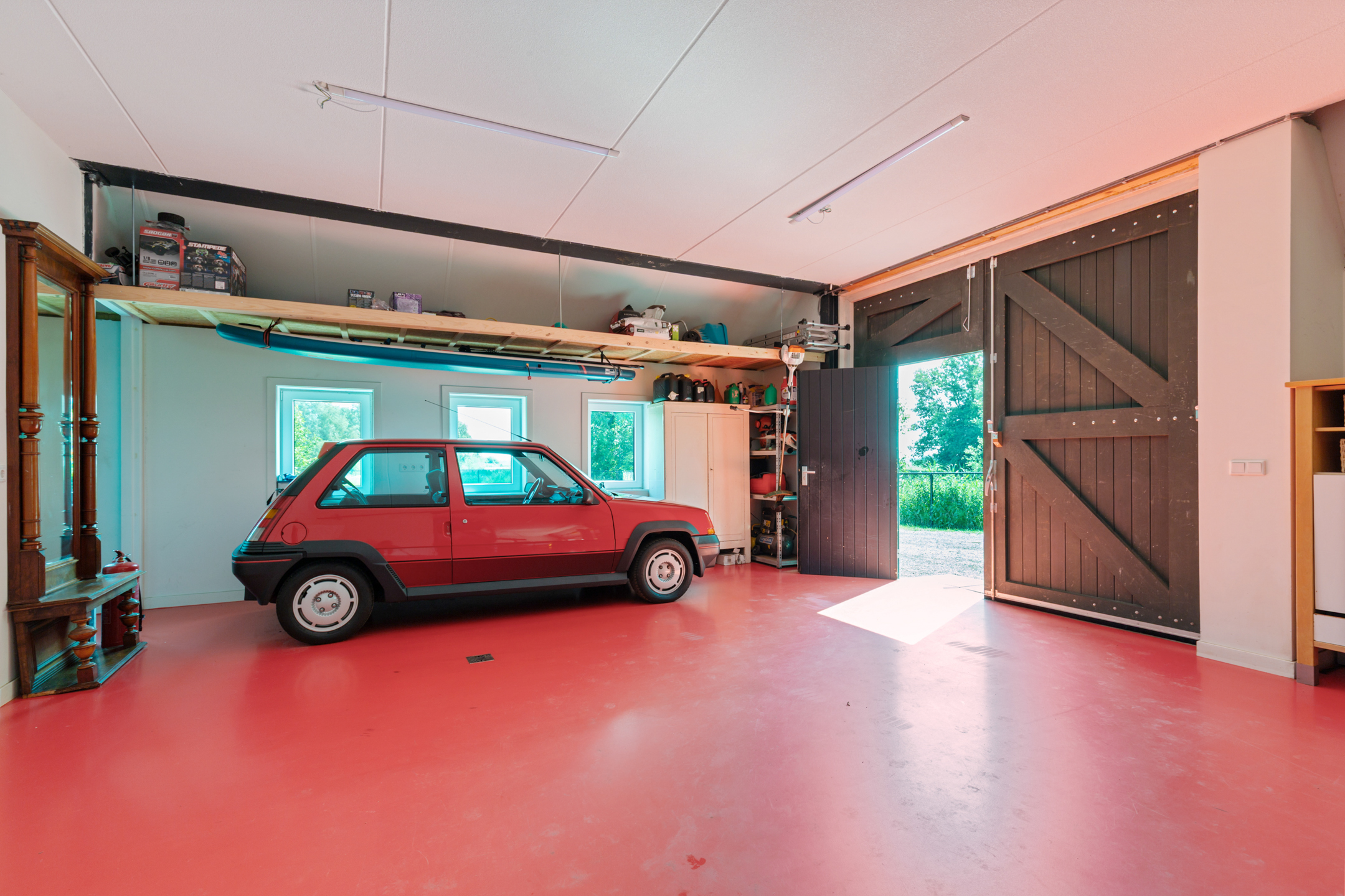 De inpandige deel, bereikbaar via de hal, is volledig geïsoleerd, voorzien van een betonvloer met vloerverwarming en vele raampartijen. Hoge dubbele staldeuren maken deze ruimte uitermate geschikt voor het stallen van meerdere auto’s of een camper. Tevens is hier de technische ruimte ondergebracht. Indien gewenst kan de deel eenvoudig worden getransformeerd tot extra woon- of werkruimte.