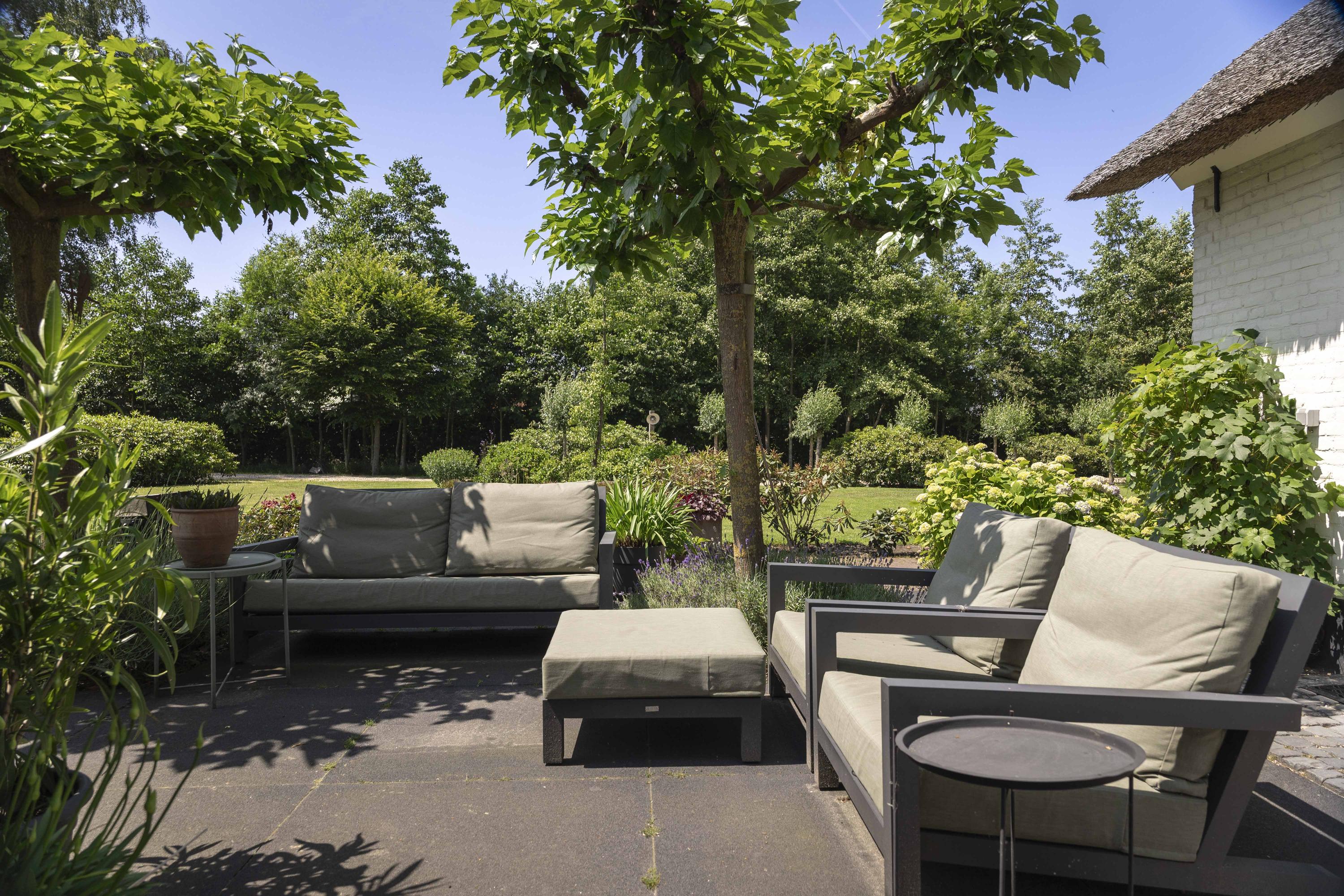 De bezonning is ideaal; de achtertuin ligt perfect op het zuiden gericht. Achter het huis, toegankelijk vanuit de woonkamer, keuken en bijkeuken, het heerlijke zonneterras. Onder de overkapping is een loungehoek ingericht met een leemkachel.
