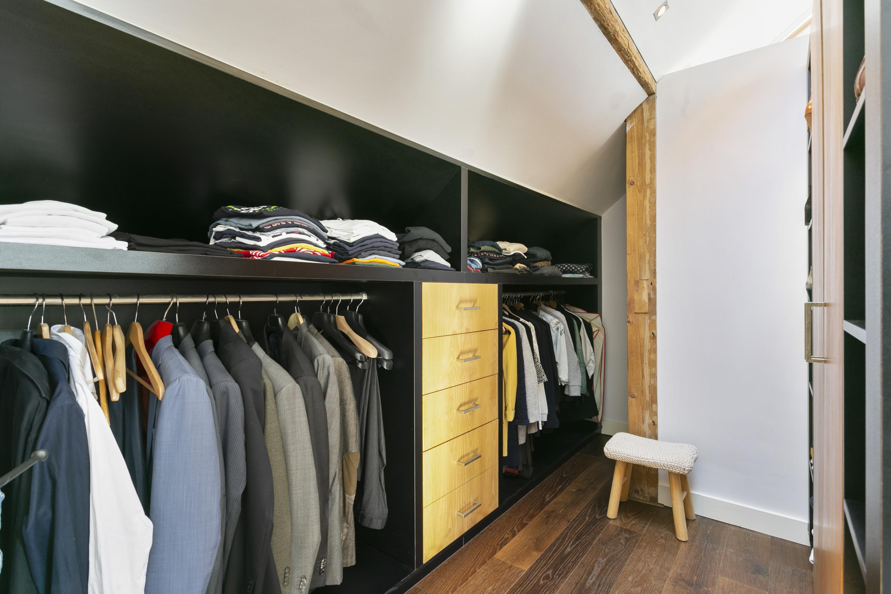 Rechts de ouderslaapkamer (50 m²), met een ruime inloopkast en een prachtige badkamer met ligbad, WC, 2 wastafels en inloopdouche. Aan beide zijden veel extra bergruimte.