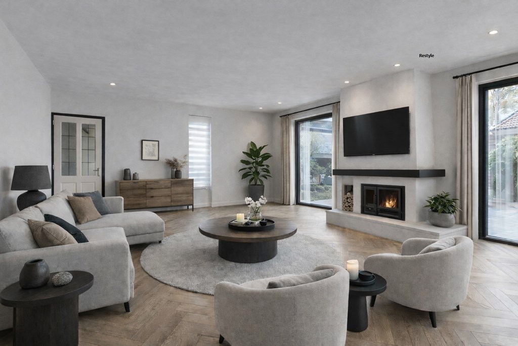 De woonkamer aan de voorzijde van de woning heeft een open indeling, wordt van veel daglicht voorzien en biedt veel mogelijkheden om een ruime zit- en eethoek te creeren. De karakteristieke elektrische haard maakt de kamer sfeervol.