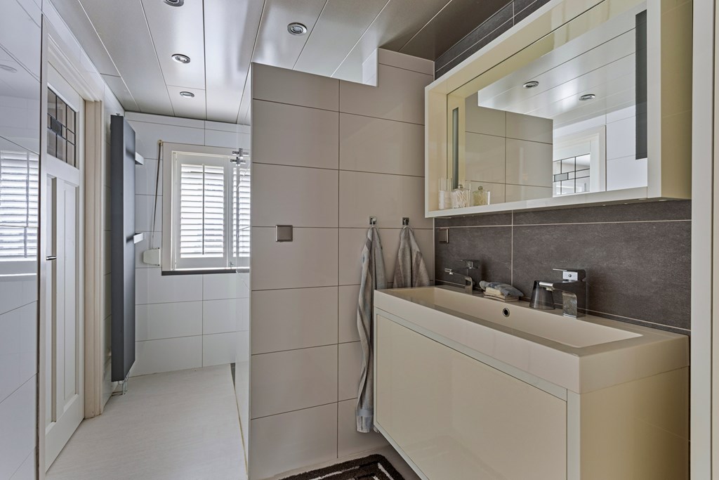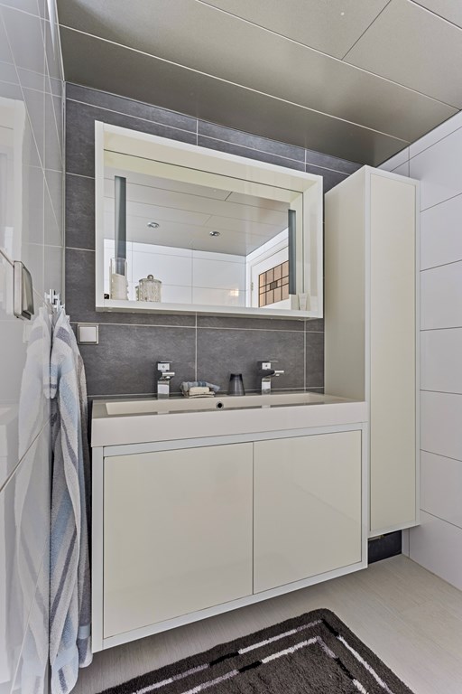 De badkamer grenst aan de hal is volledig betegeld en goed onderhouden. De moderne badkamer beschikt over een ligbad met douche, een dubbele wastafel en opbergmeubel.