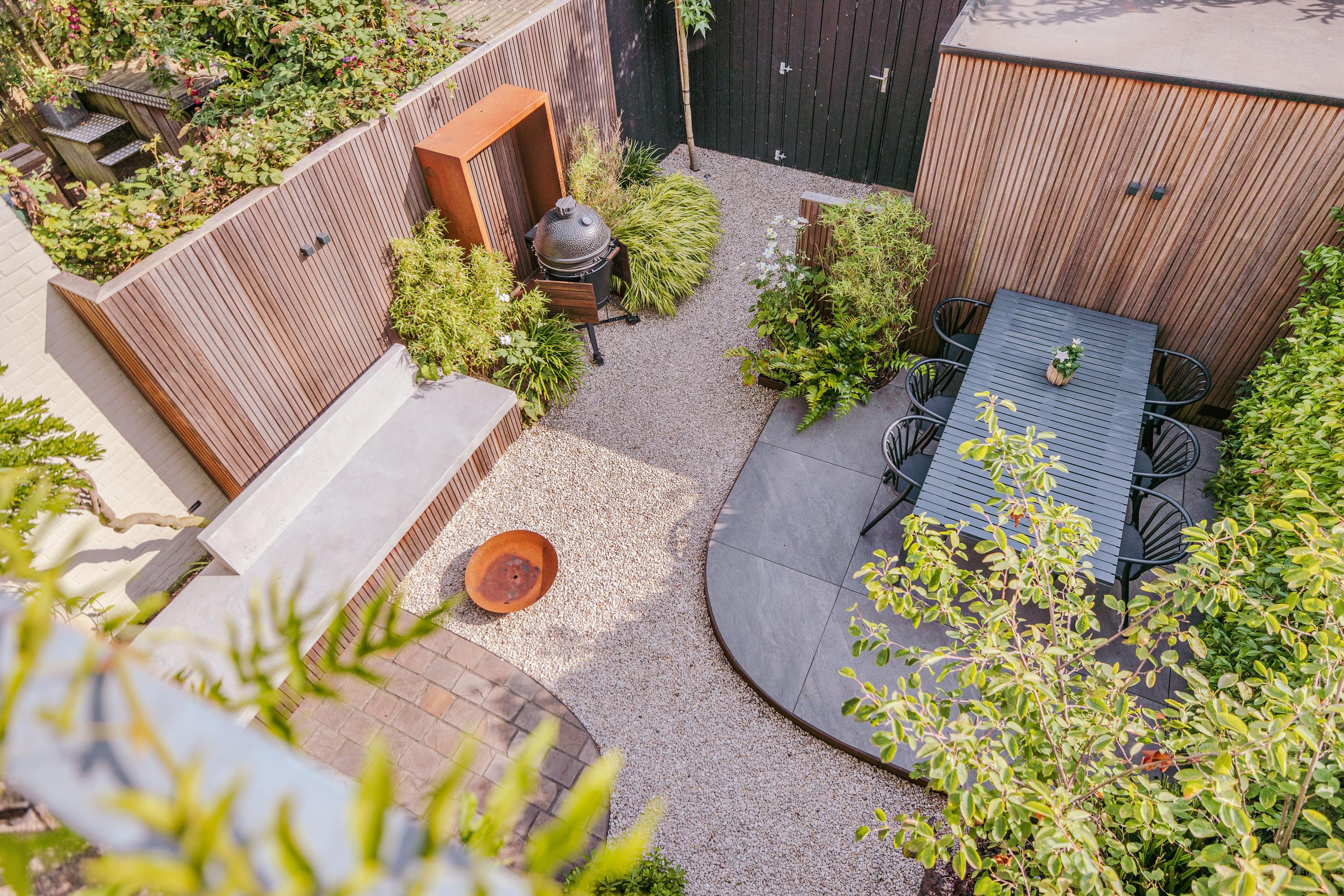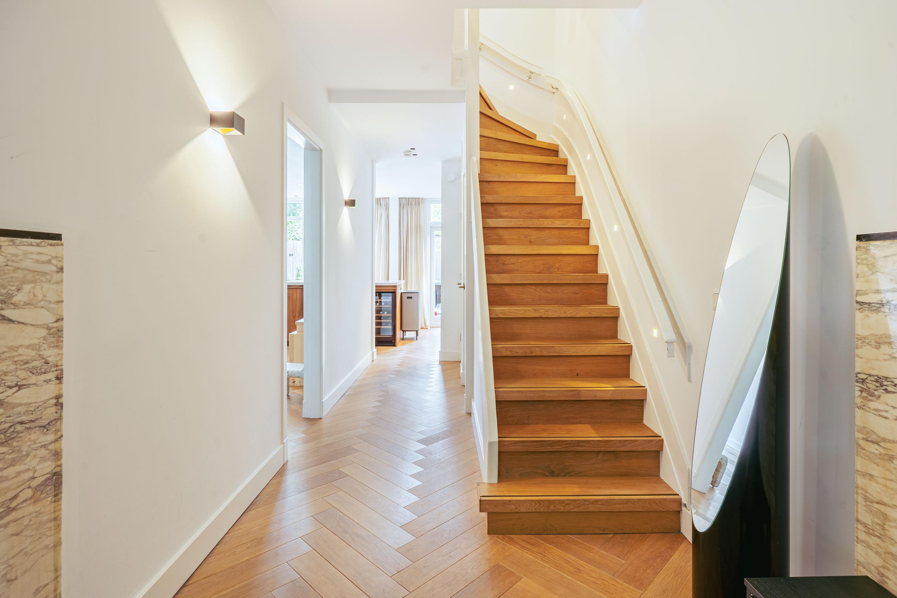 Middels de verzorgde voortuin bereikt u de entree van de woning. De hal beschikt over een praktische trapkast en een apart toilet met fontein. Vanuit hier heeft u toegang tot de lichte woonkamer en de royale leefkeuken aan de achterzijde. De woning is in 2021 volledig gerenoveerd en voorzien van een eikenhouten visgraatvloer met vloerverwarming. De luxe keuken is uitgevoerd met een centraal kookeiland en hoogwaardige inbouwapparatuur, waaronder een Bora inductiekookplaat met afzuiging, Quooker, spoelbak, klimaatkast, twee combi-ovens(waarvan een met stoomfunctie), koelkast, vriezer en vaatwasser. Het natuurstenen werkblad van Taj Mahal kwartsiet geeft de keuken een hoogwaardige uitstraling. Dankzij de grote raampartijen en de glazen deur naar de tuin profiteert deze verdieping van veel daglicht. De achtertuin (41m² op het zuiden) is in 2022 ontworpen en aangelegd door een professionele tuinarchitect, voorzien van verlichting en irrigatie, en beschikt over een vrijstaande berging (ca. 6 m²) met elektra.