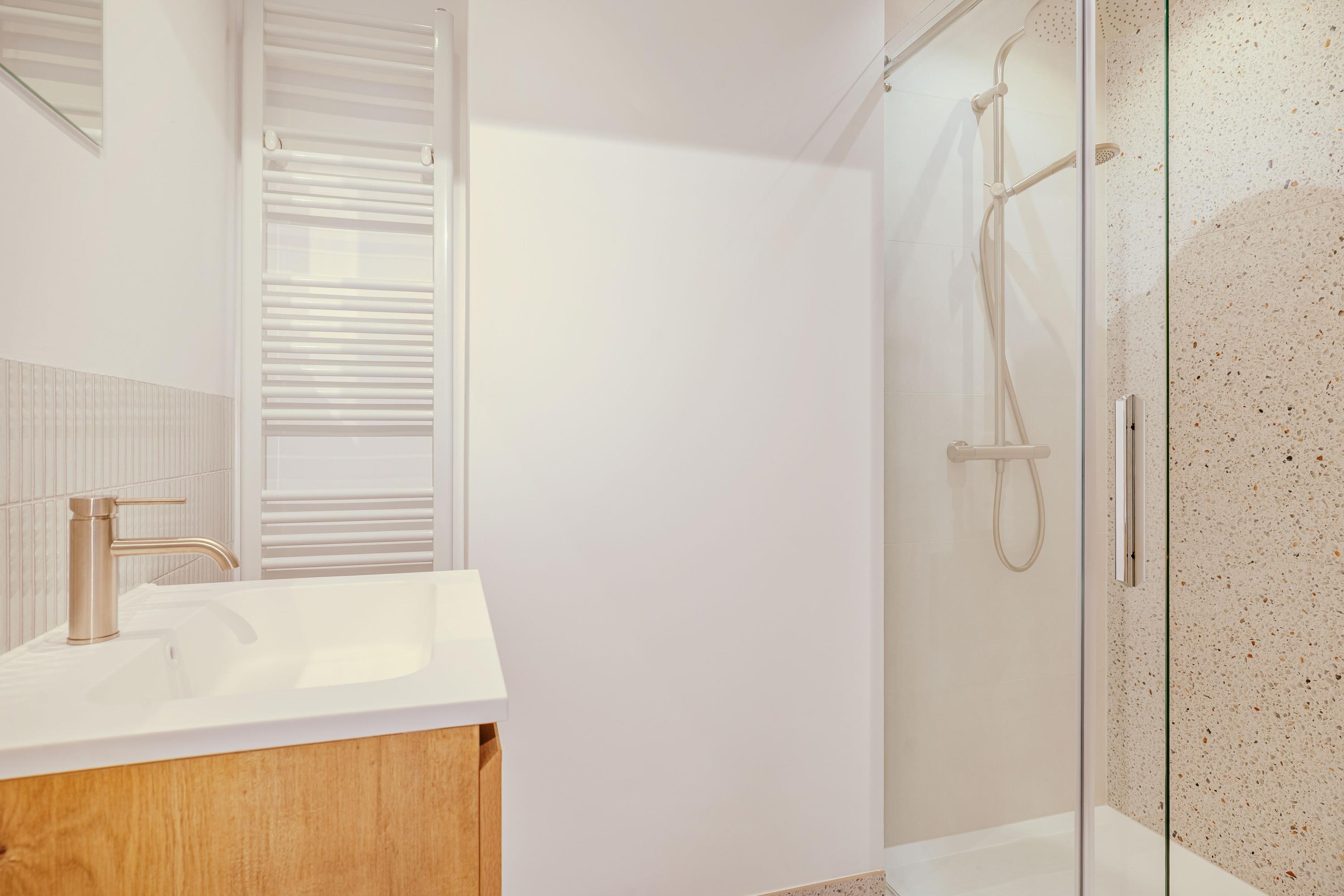 De overloop geeft toegang tot drie slaapkamers, een ruime badkamer en een separaat toilet. De master bedroom ligt aan de voorzijde en biedt voldoende ruimte voor een groot bed en kastenwand. Direct ernaast bevindt zich een extra kamer die eenvoudig als inloopkast kan worden ingericht. Aan de achterzijde liggen nog twee slaapkamers, waarvan één met toegang tot het balkon en één voorzien van een elektrisch rolluik op zonne-energie. De moderne badkamer is uitgerust met een ligbad, dubbele wastafel met meubel, vloerverwarming en een verwarmde spiegel.