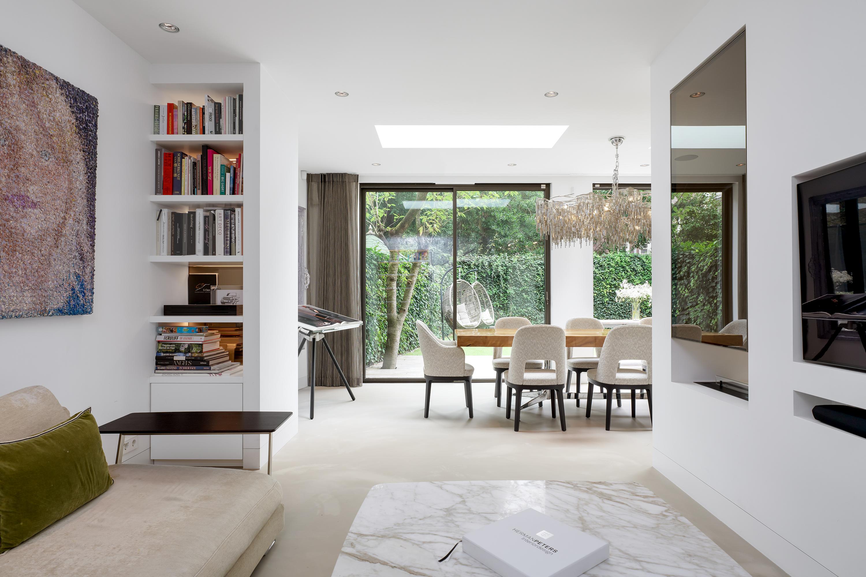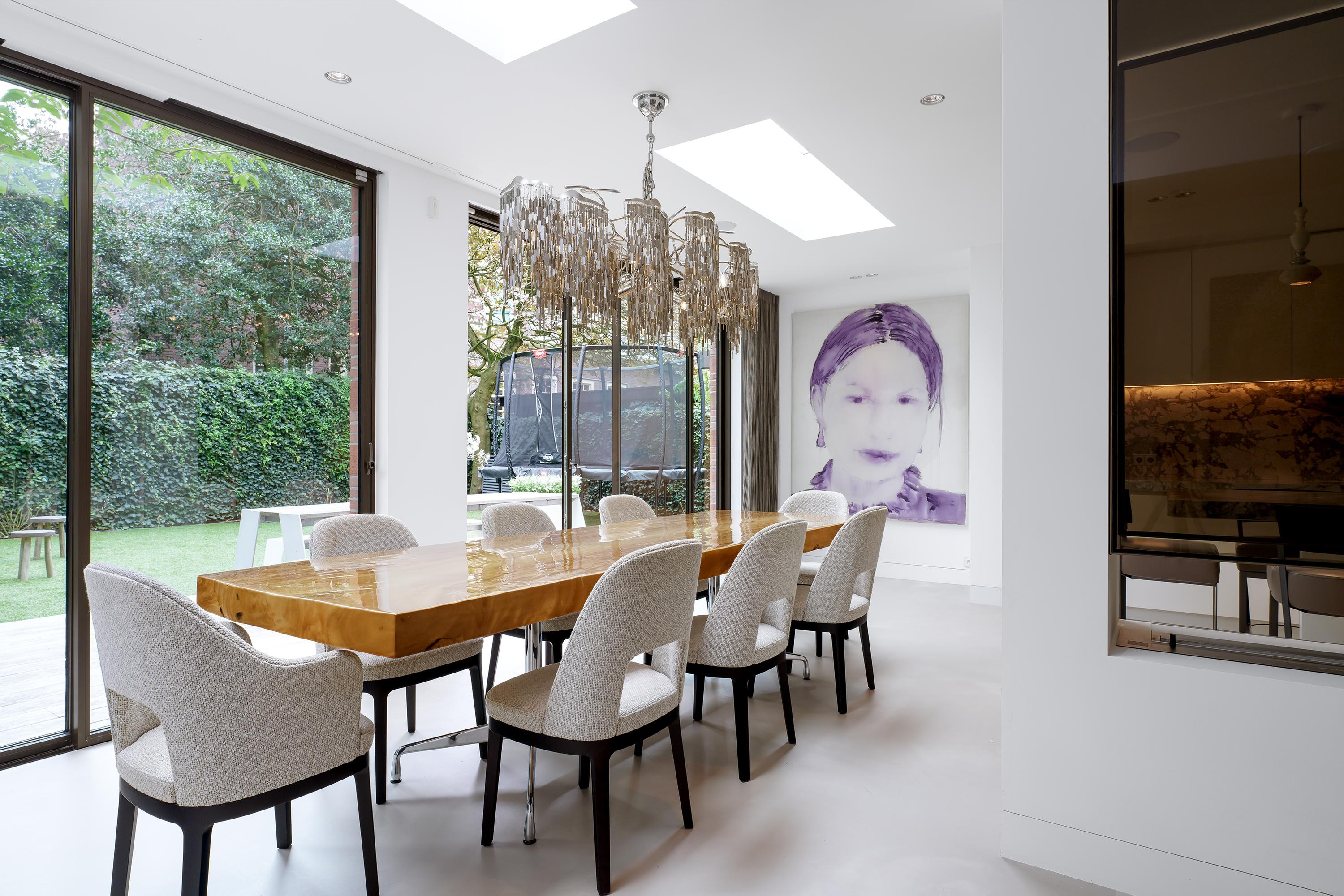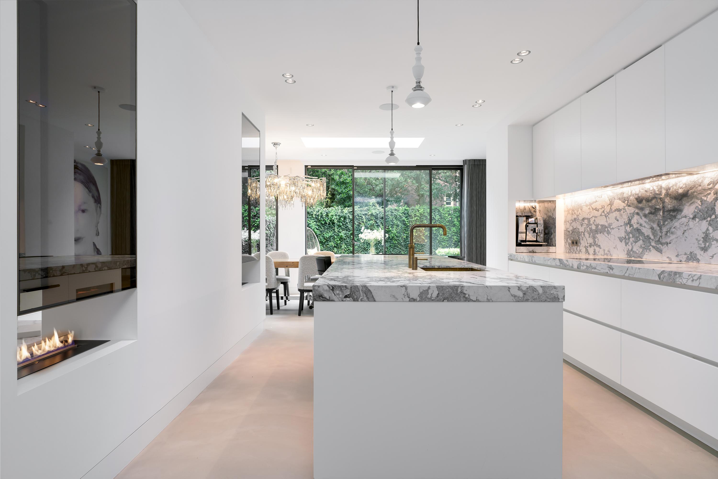 Aan de achterzijde van de woning, de ruime living met prachtige woonkeuken. Deze luxe uitgevoerde keuken is werkelijk van alle gemakken voorzien: een spoeleiland uitgerust met een Quooker kraan en een klimaatkast, een oven, combi stoomoven, warmhoudplaat, koelkast, vriezer, vaatwasser, inductiekookplaat en een ingebouwde afzuigunit. Alle inbouwapparatuur in deze keuken is van het merk Gaggenau. De ware eyecatcher is de speciale nis met uittrekbare unit voor de koffiemachine. Twee sfeervolle ethanol haarden dienen als scheiding tussen de keuken en het woonkamer gedeelte. De living is voorzien van meerdere inbouwkasten. Het eetkamergedeelte, gelegen in de uitbouw, grenst aan de keuken en het woonkamergedeelte en is voorzien van elektrische gordijnen. Lichtkoepels voorzien deze ruimte van bijzonder veel lichtinval. Middels de schuifpui heeft u toegang tot de riante achtertuin, gelegen op het zuid oosten.