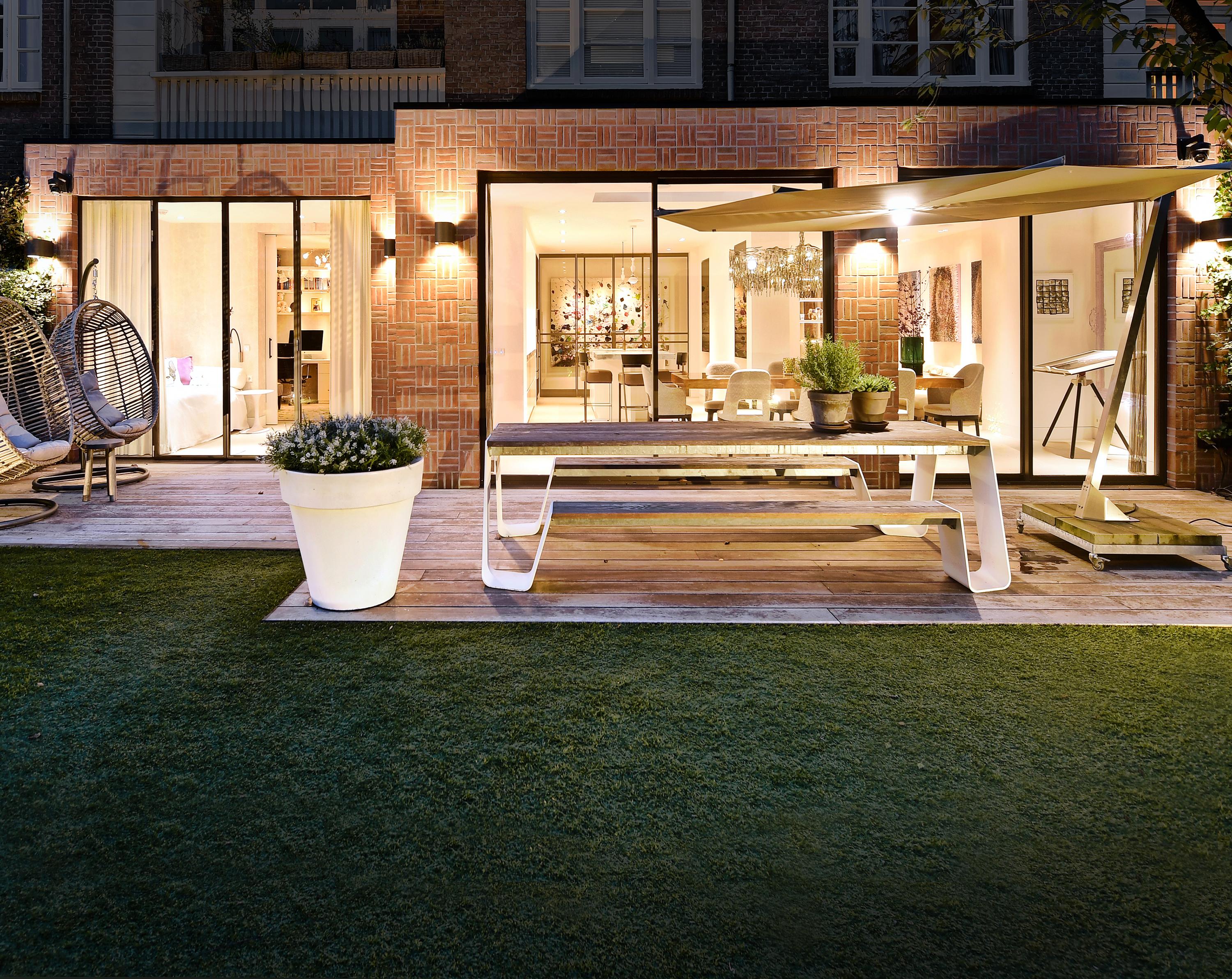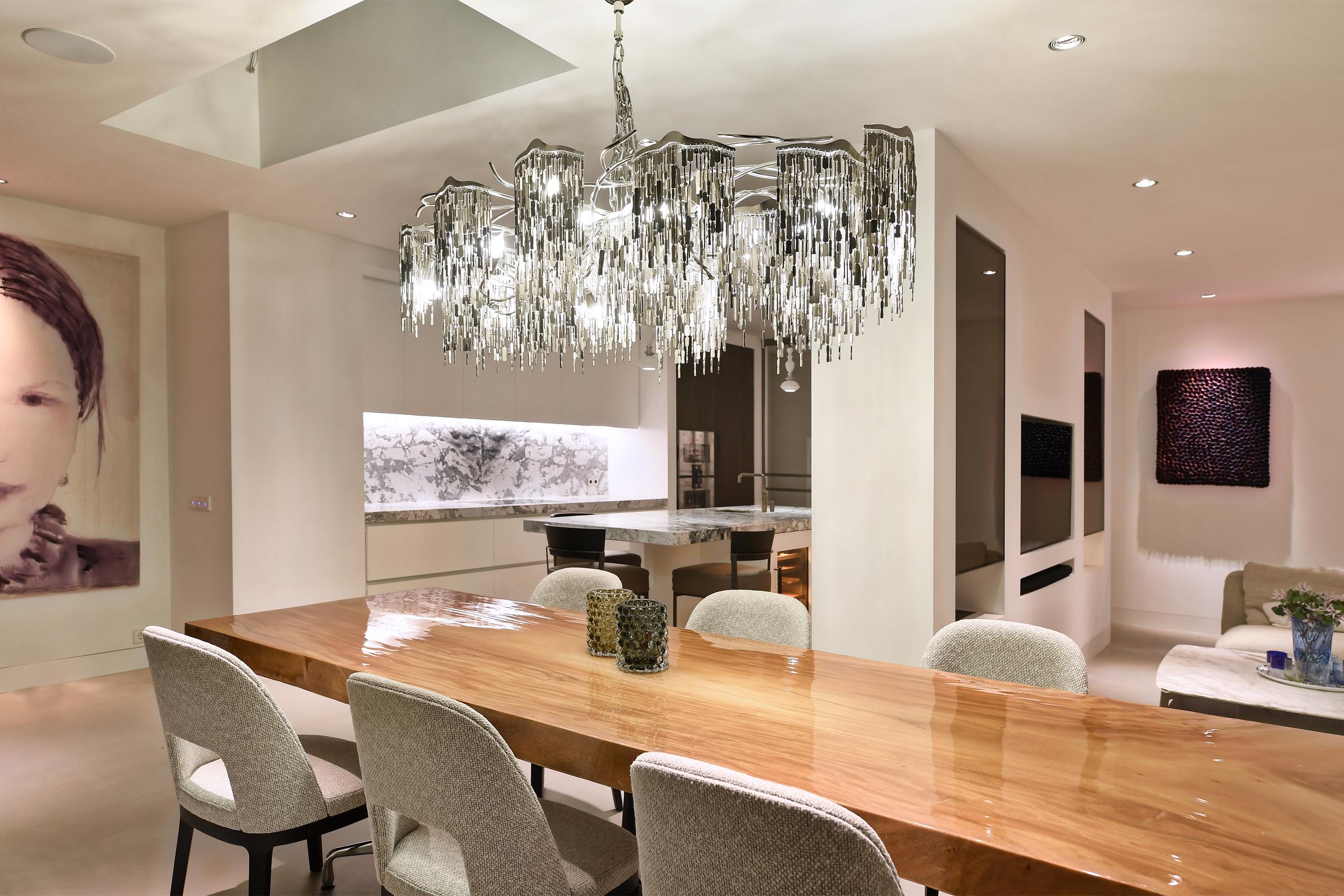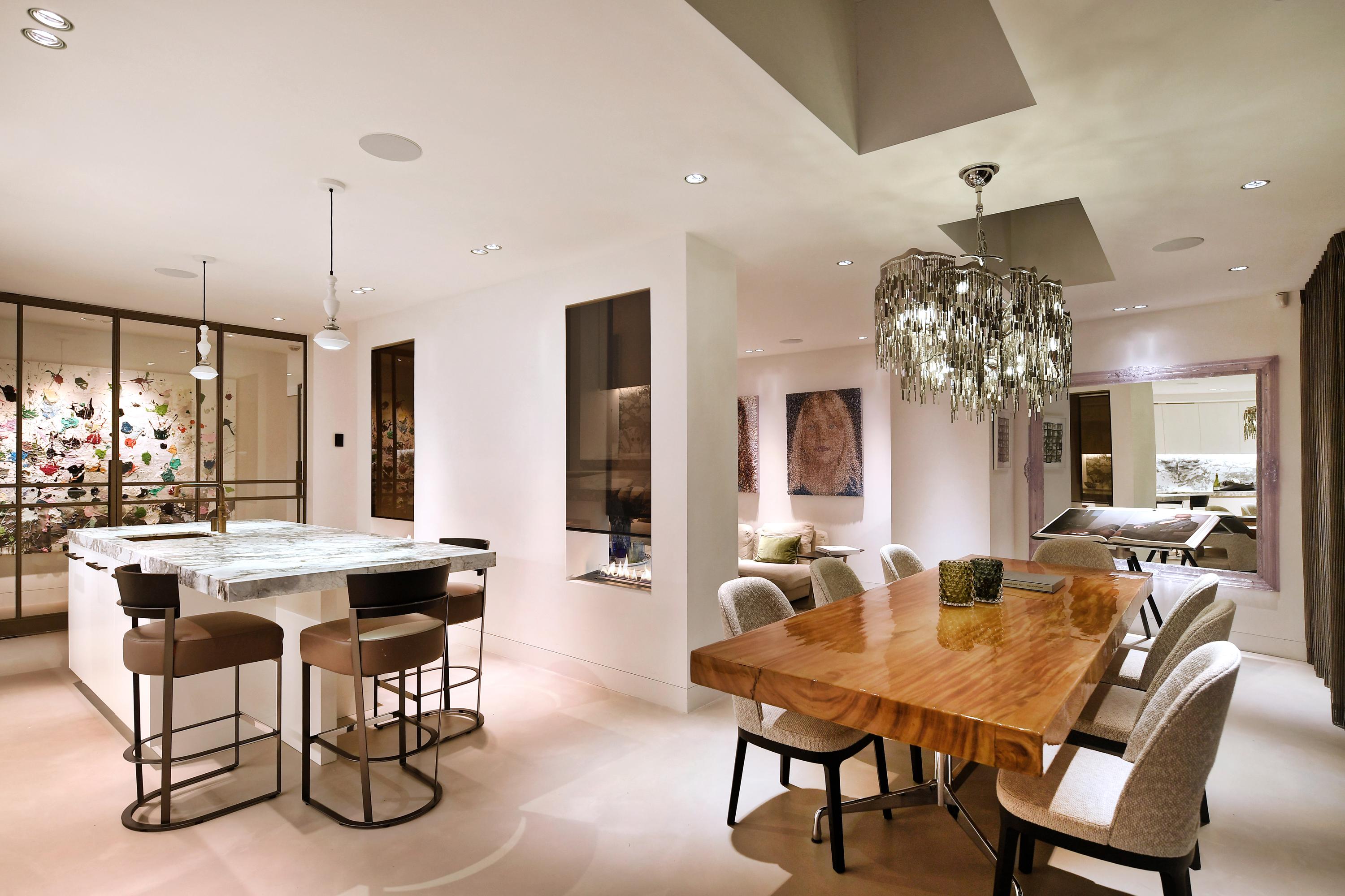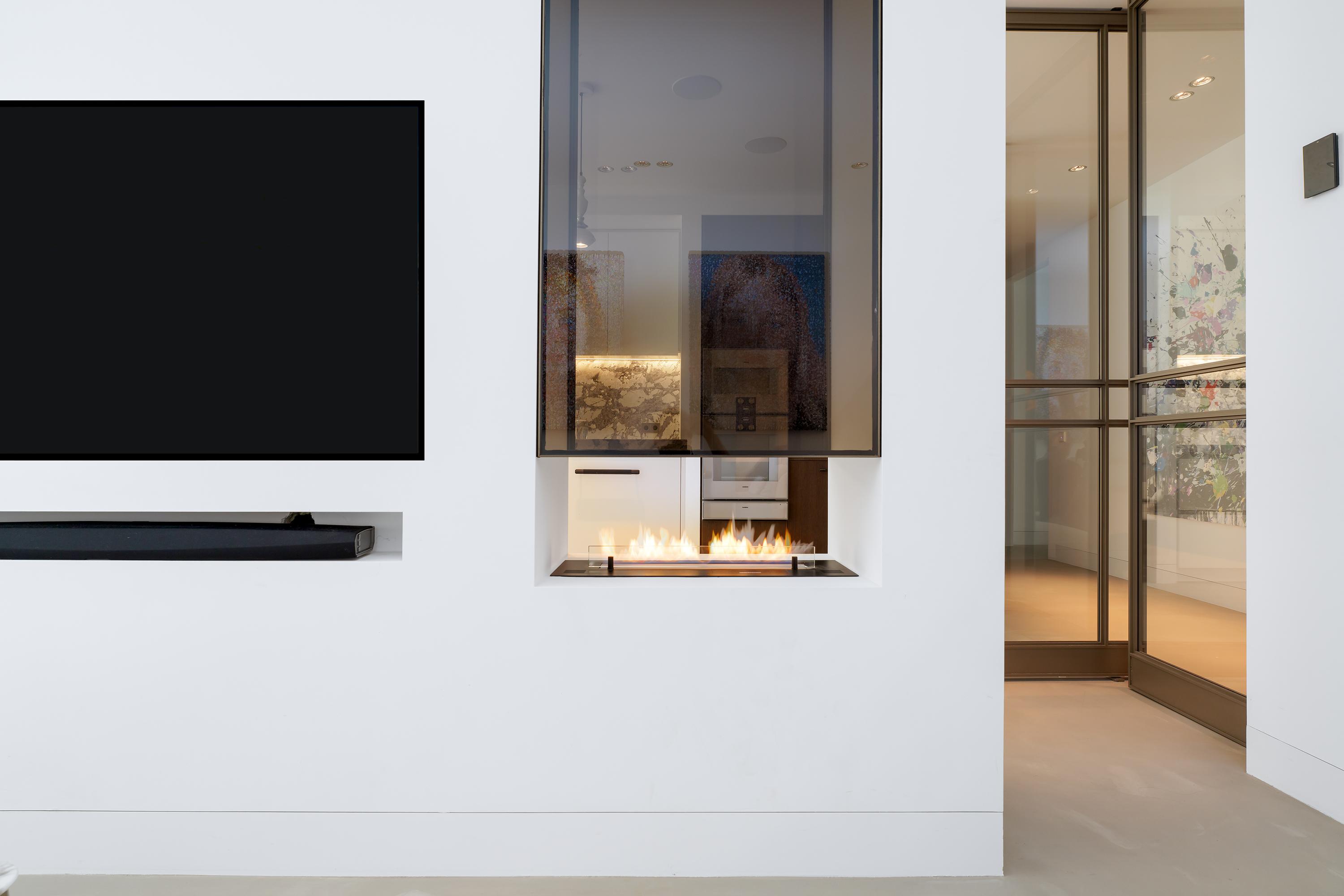 Aan de achterzijde van de woning, de ruime living met prachtige woonkeuken. Deze luxe uitgevoerde keuken is werkelijk van alle gemakken voorzien: een spoeleiland uitgerust met een Quooker kraan en een klimaatkast, een oven, combi stoomoven, warmhoudplaat, koelkast, vriezer, vaatwasser, inductiekookplaat en een ingebouwde afzuigunit. Alle inbouwapparatuur in deze keuken is van het merk Gaggenau. De ware eyecatcher is de speciale nis met uittrekbare unit voor de koffiemachine. Twee sfeervolle ethanol haarden dienen als scheiding tussen de keuken en het woonkamer gedeelte. De living is voorzien van meerdere inbouwkasten. Het eetkamergedeelte, gelegen in de uitbouw, grenst aan de keuken en het woonkamergedeelte en is voorzien van elektrische gordijnen. Lichtkoepels voorzien deze ruimte van bijzonder veel lichtinval. Middels de schuifpui heeft u toegang tot de riante achtertuin, gelegen op het zuid oosten.