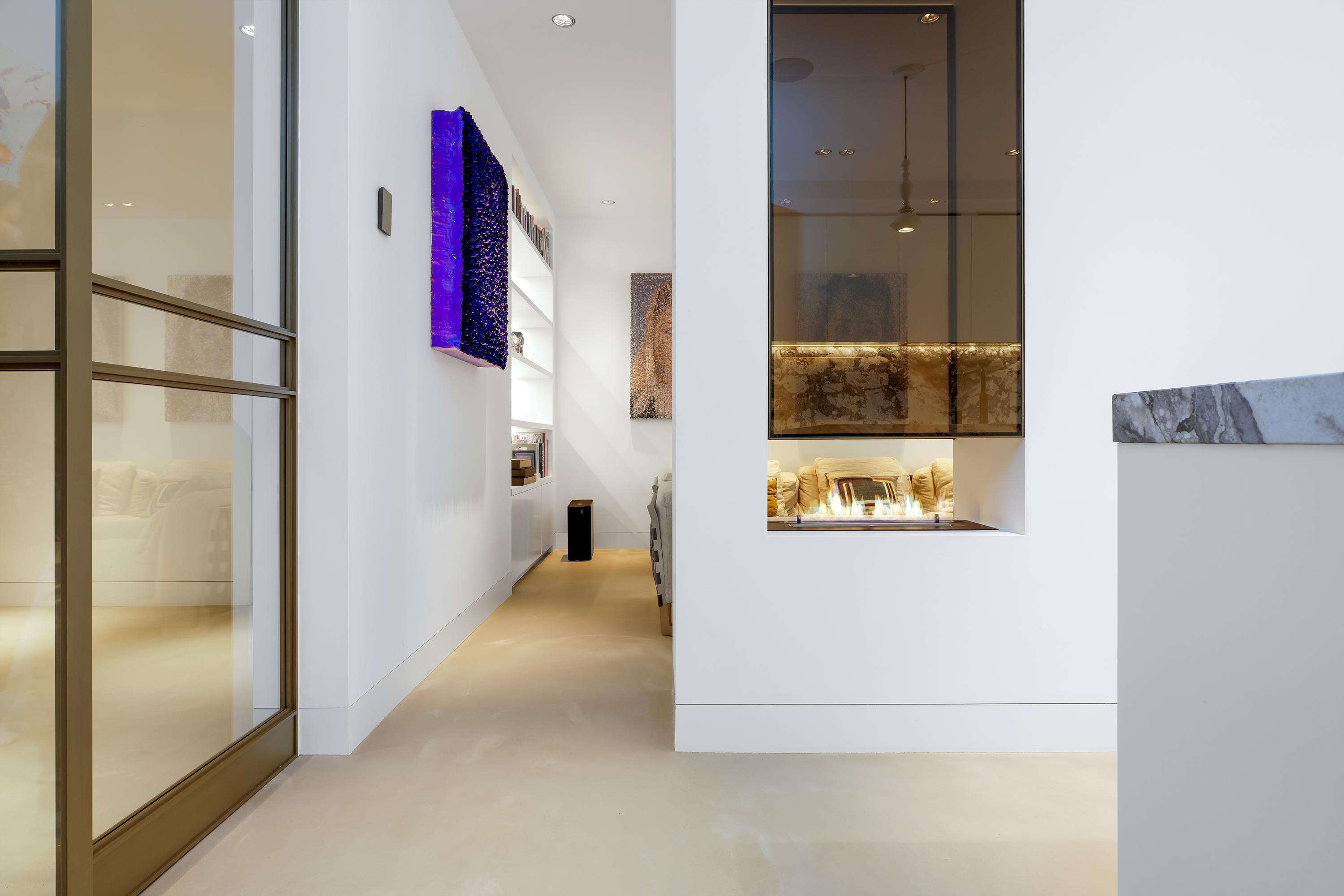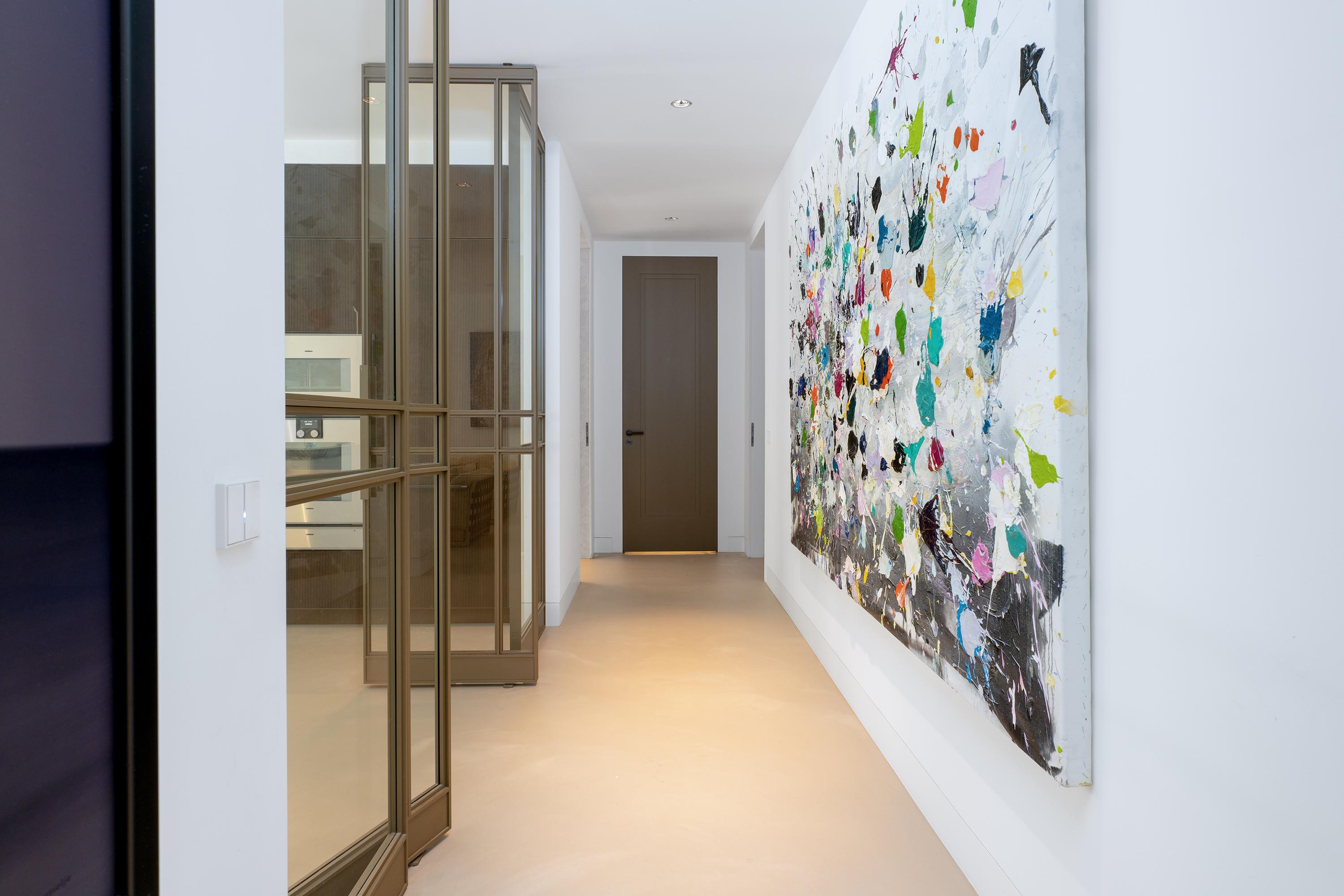 Riant entree met een prachtige marmeren vloer en ingebouwde kasten. Middels openslaande stalen taatsdeuren bereikt u de hal met toegang tot alle vertrekken en separaat toilet.