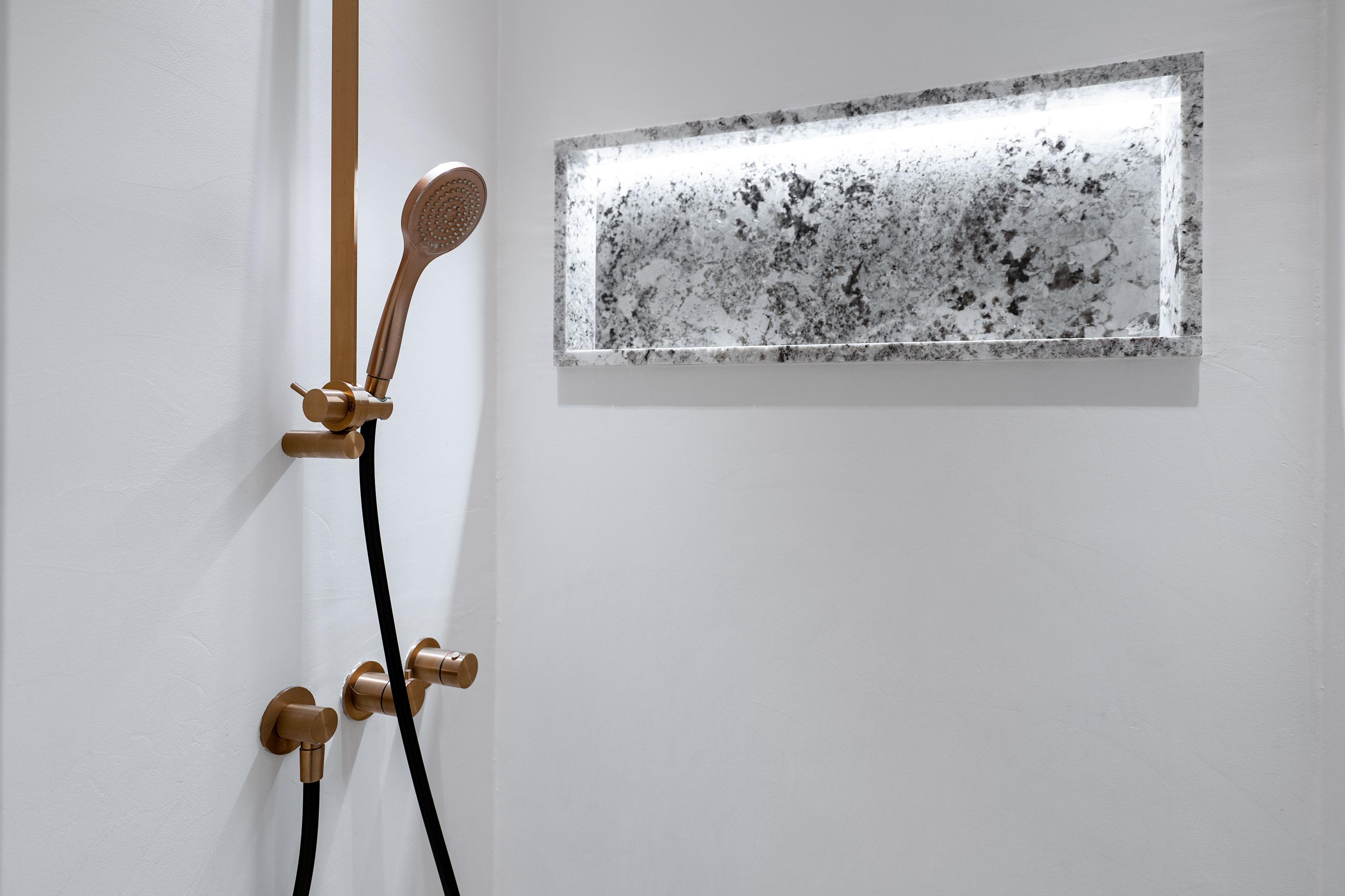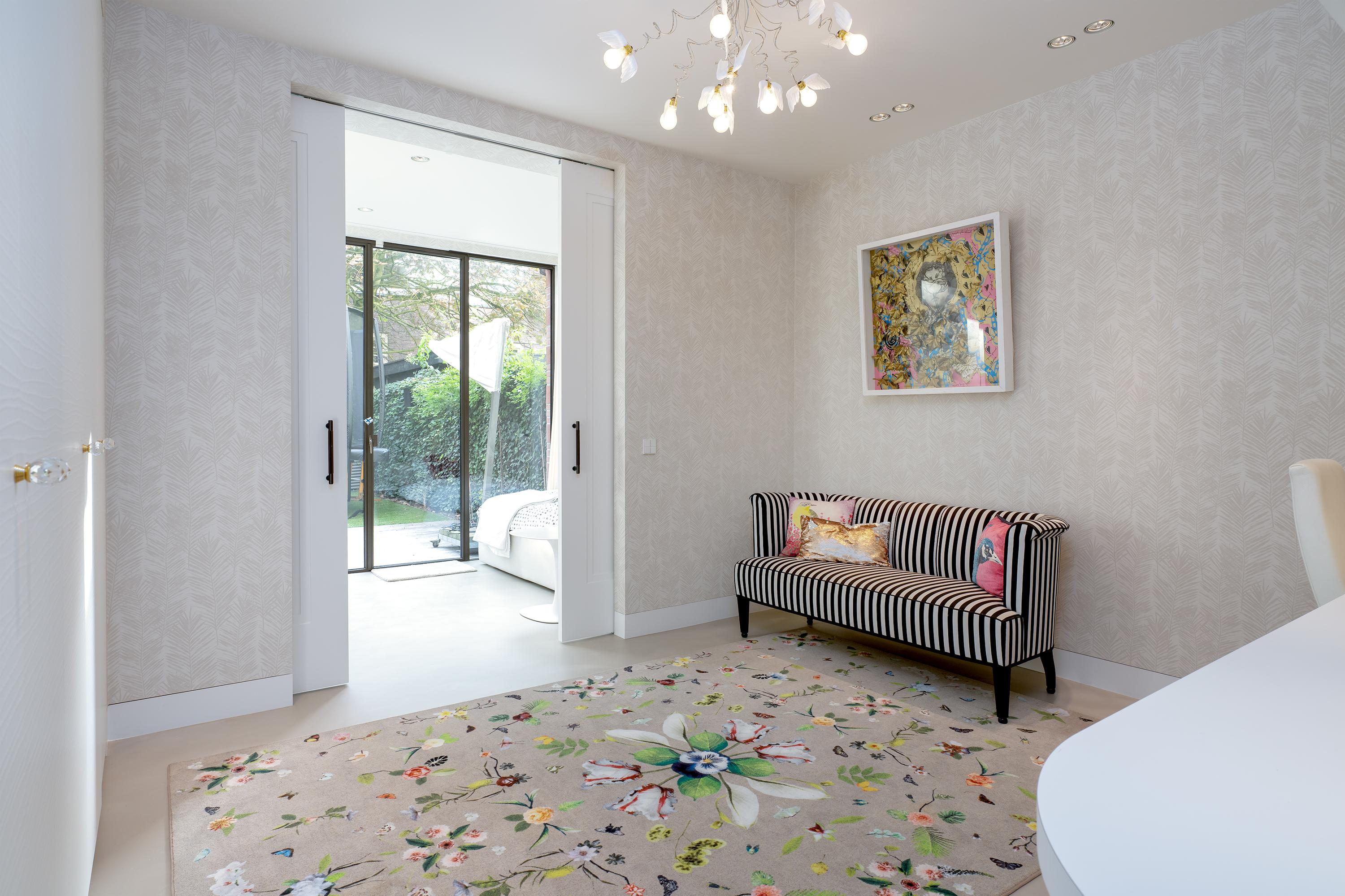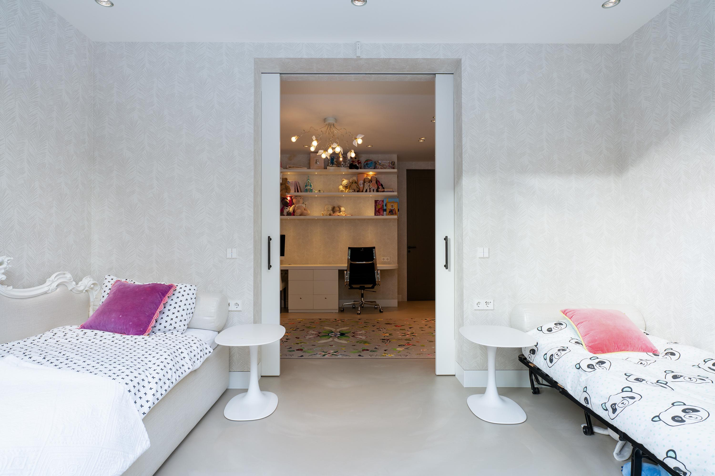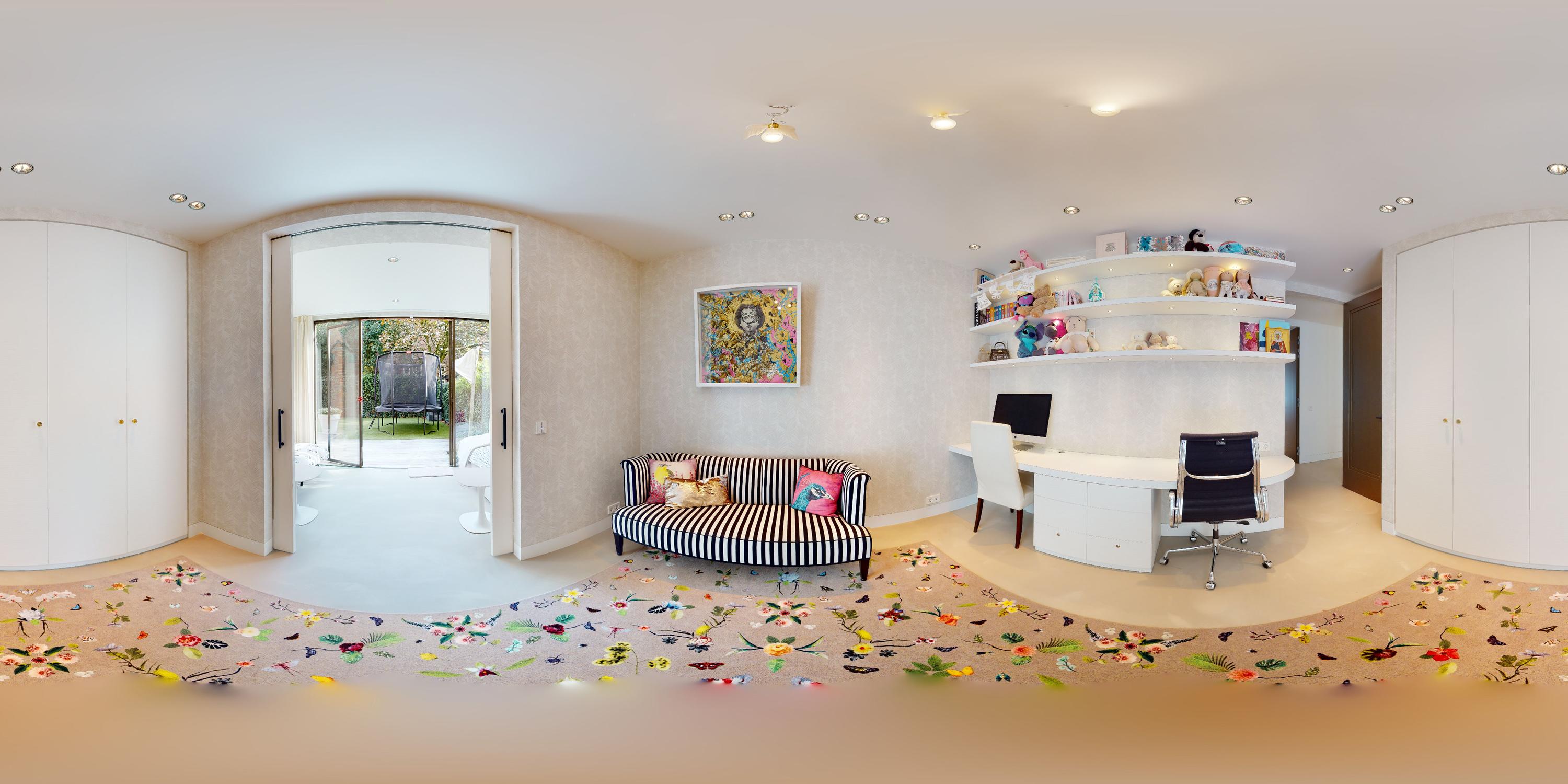 Aan de achterzijde is tevens een slaapkamer gesitueerd, deels in de uitbouw, welke ook toegang biedt tot de achtertuin middels openslaande deuren. Deze ruime slaapkamer is voorzien van een ingebouwd bureau, ingebouwde kastenwand en schuifdeuren. De luxe badkamer is te bereiken vanuit de hal en is uitgerust met een dubbele wastafel van natuursteen met meubel, toilet en een ruime douche.