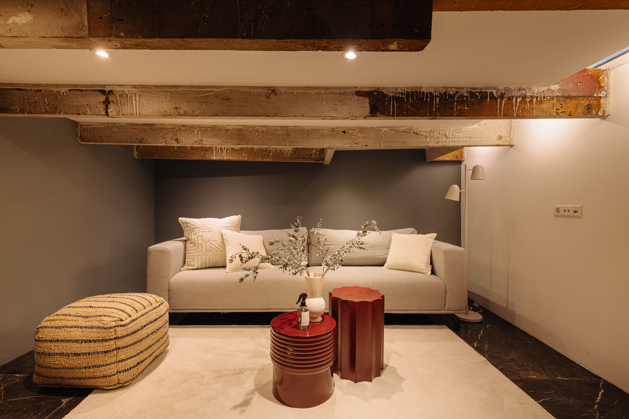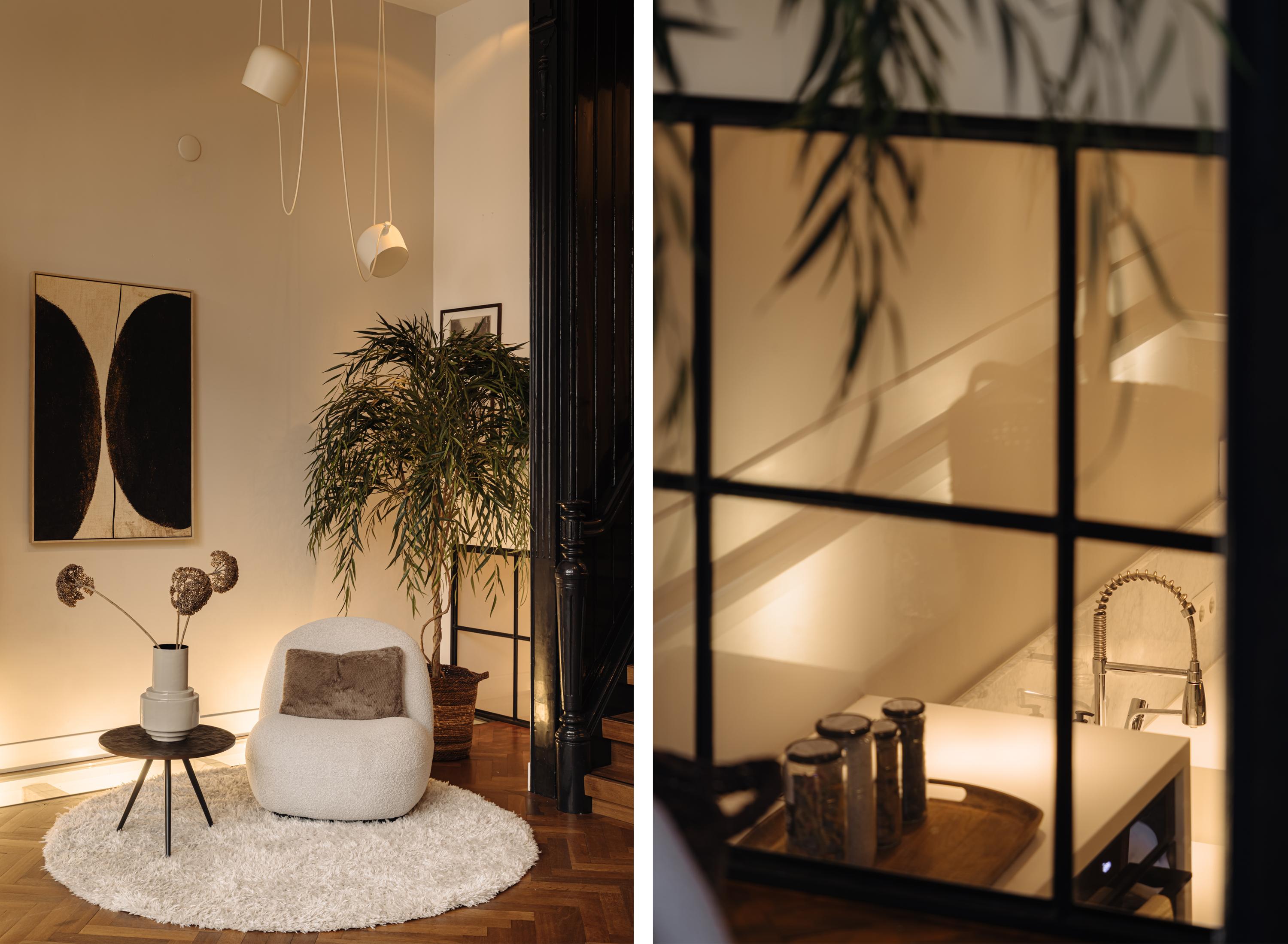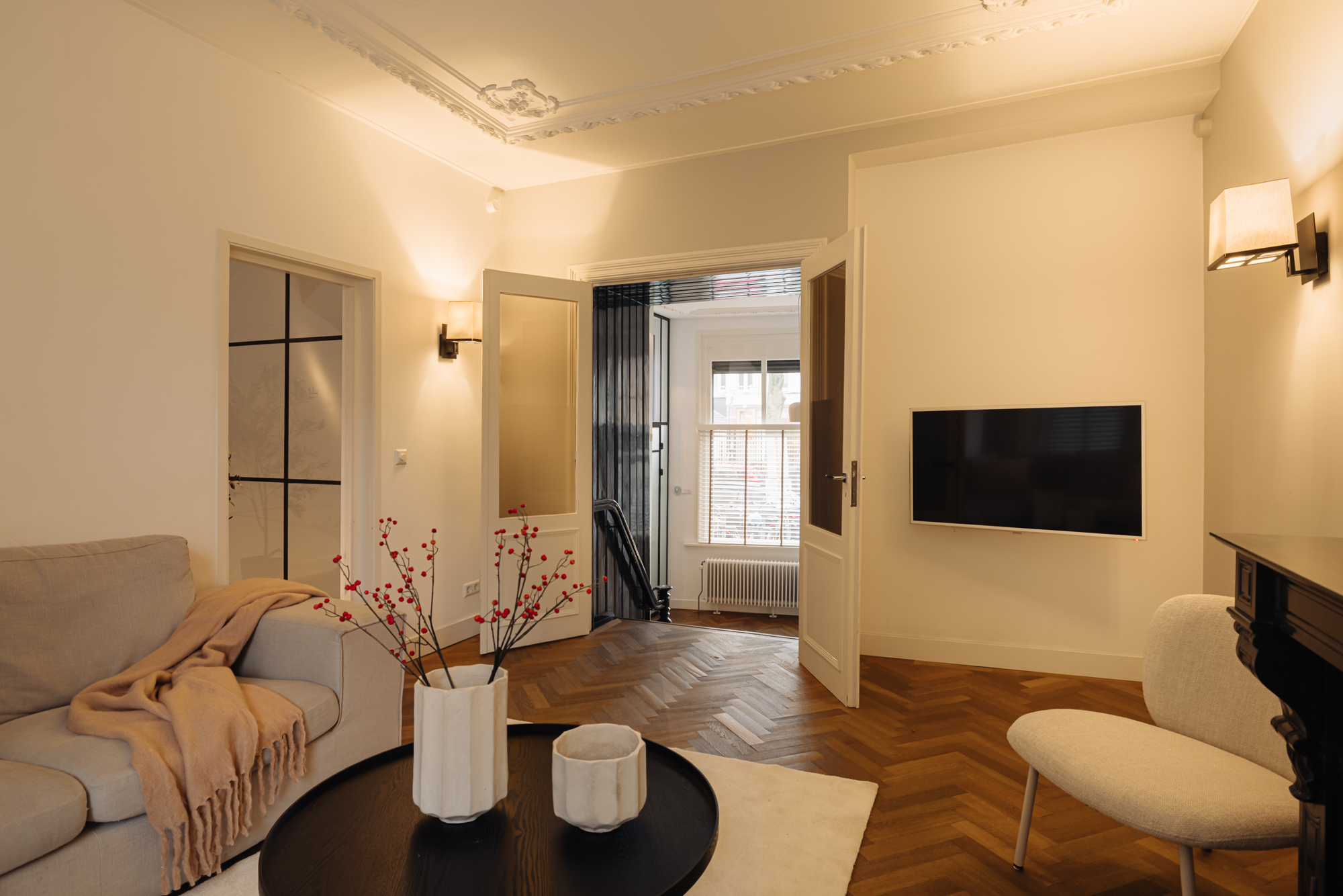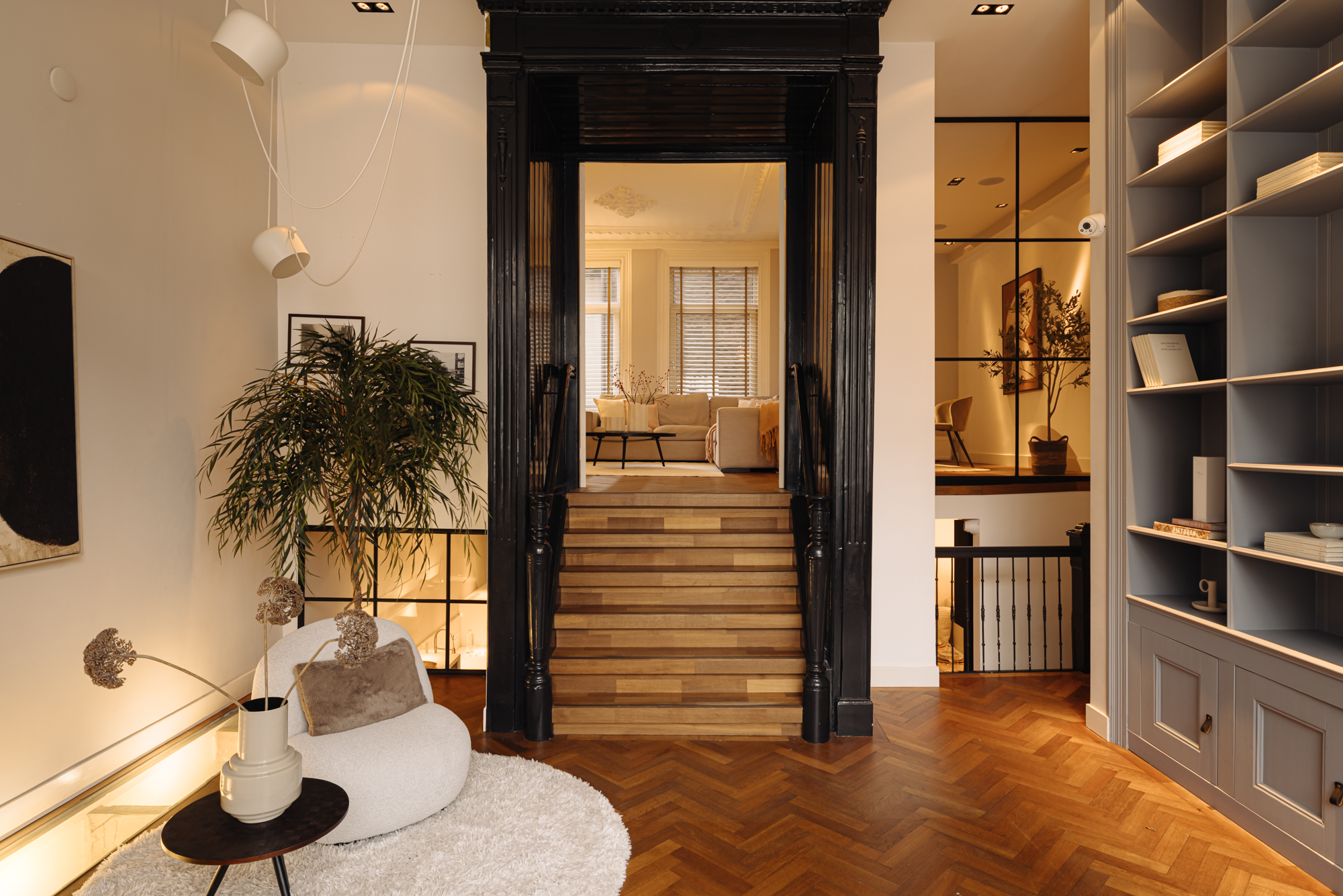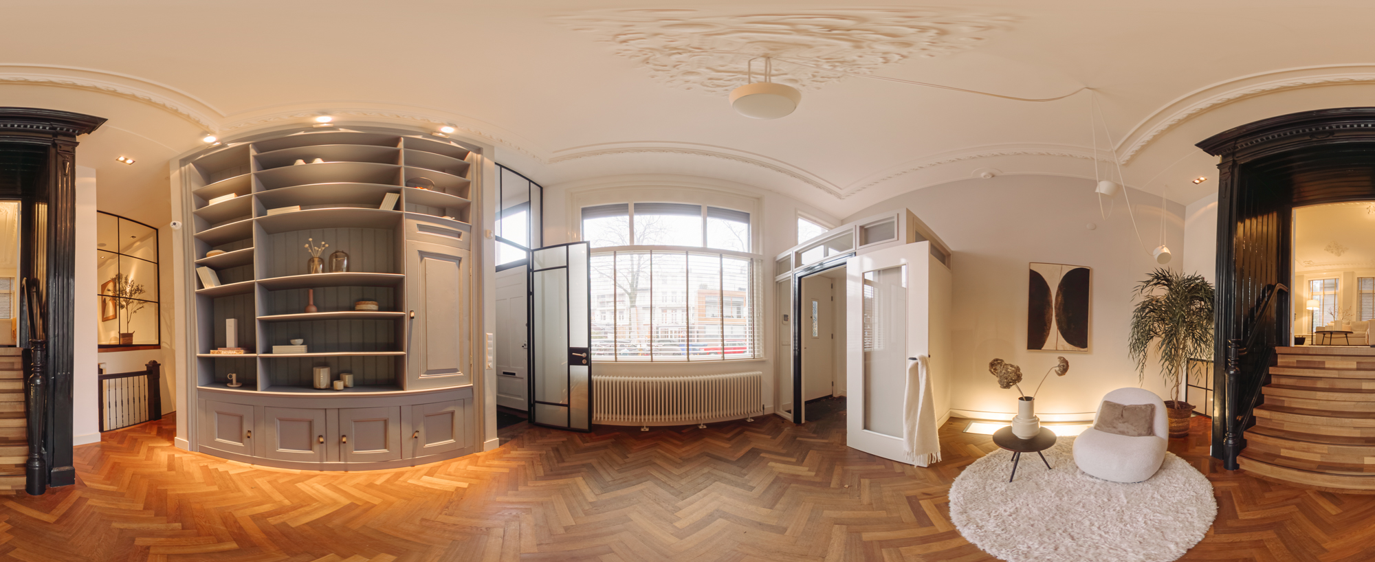 De entree bevindt zich op de begane grond. Bij binnenkomst staat u meteen in een prachtig vormgegeven hal waar het karakter en de verfijnde stijl van de woning direct zichtbaar worden. De hoge plafonds, warme kleuren, zorgvuldige verlichting, plafondornamenten en klassieke details creëren een welkom dat u bijna doet vergeten dat u zich midden in de stad bevindt.