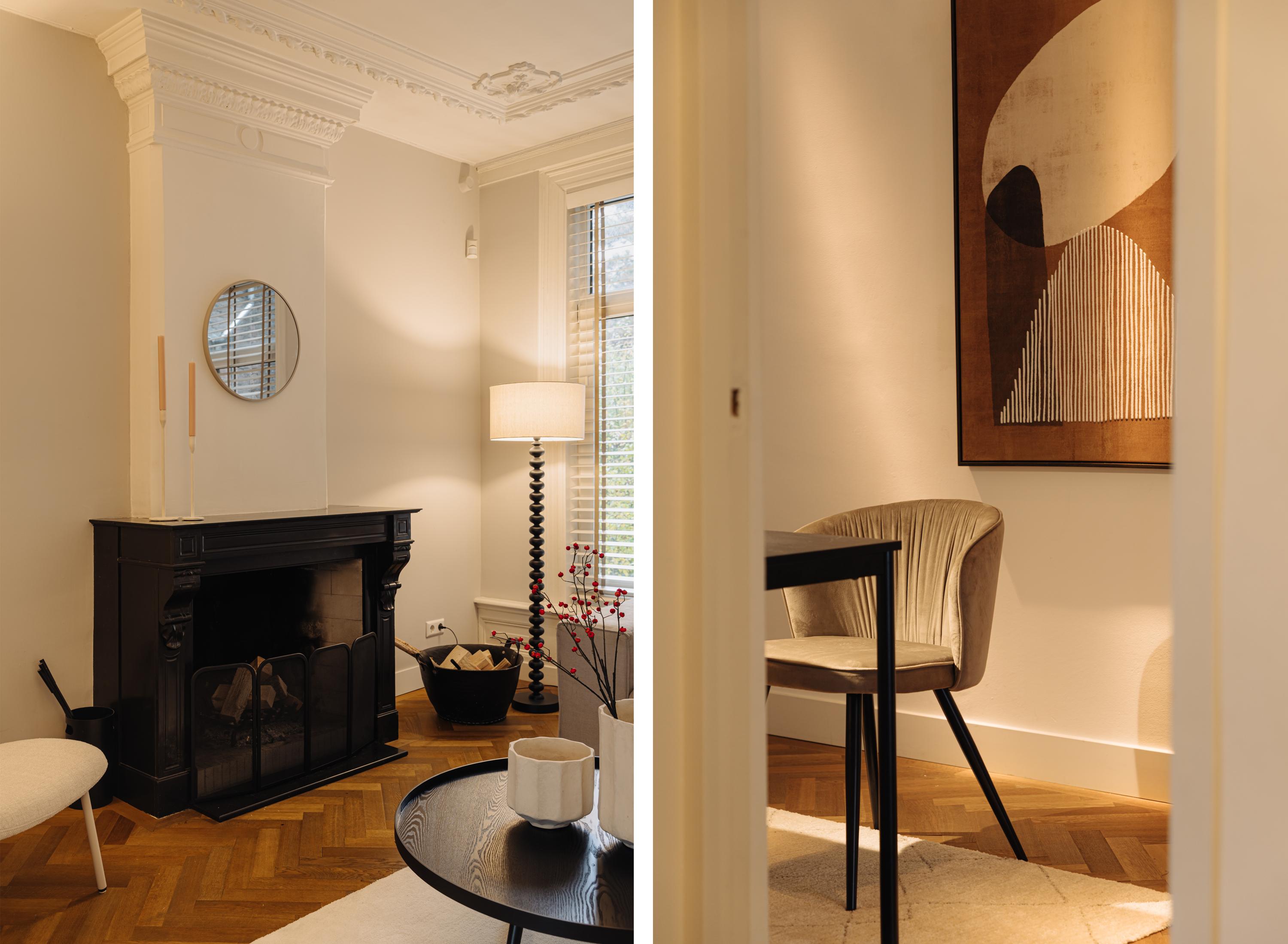 Op de eerste verdieping bevinden zich twee ruime en sfeervolle slaapkamers en een royale badkamer. De slaapkamer aan de achterzijde straalt rust uit dankzij de hoge plafonds, de visgraatvloer, warme kleuren en een klassieke schouw. Aangrenzend ligt een prachtige inloopkast met op maat gemaakte kasten, open schappen en geïntegreerde verlichting. Een bijzonder comfortabele en luxe plek om de dag te beginnen.