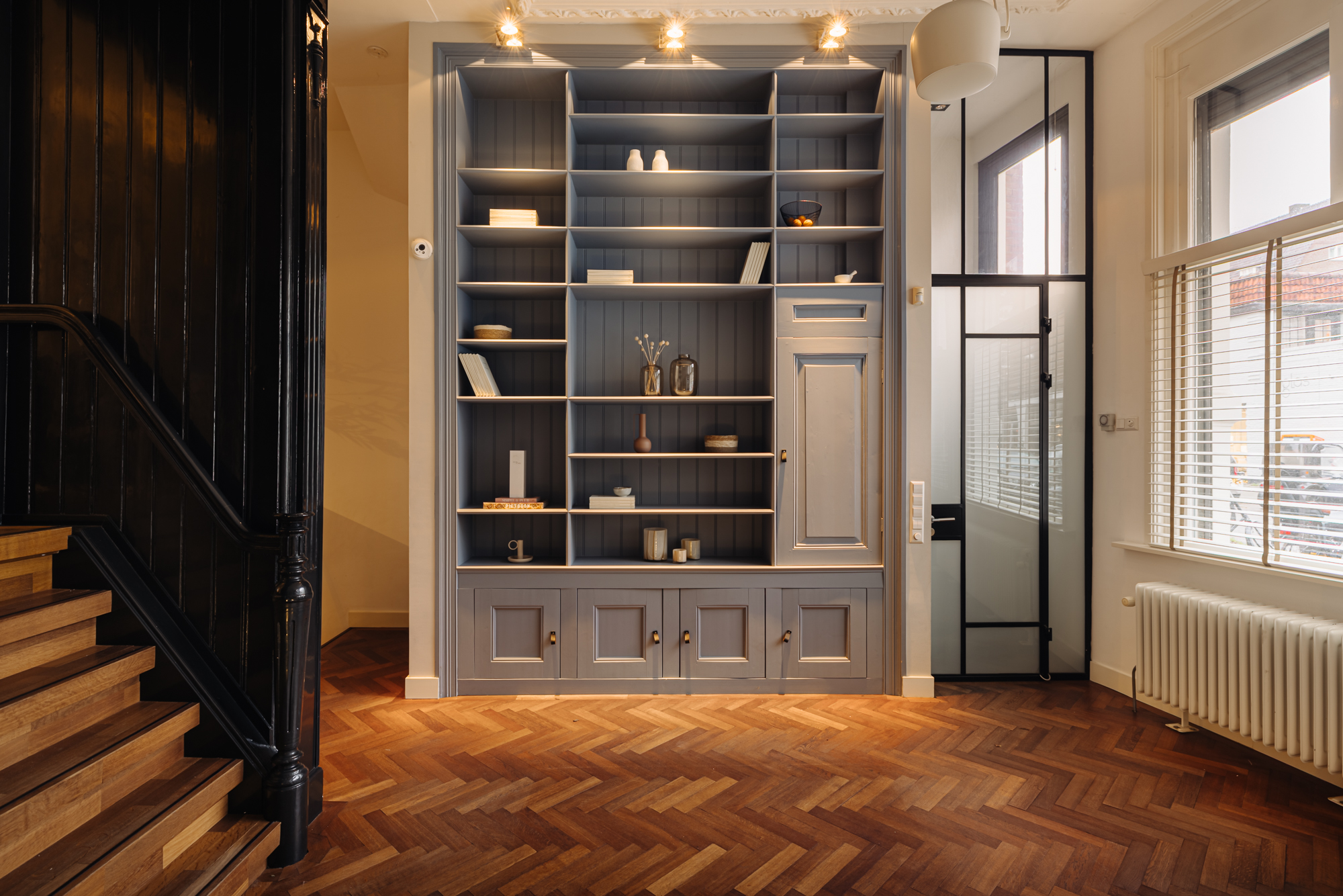 De entreehal is voorzien van een stijlvolle inbouwkast en een fraaie klassieke trap die direct de aandacht trekt. Deze open ruimte leent zich uitstekend als lounge, ontvangst of garderobe. Een half niveau hoger bevindt zich een sfeervolle kamer die perfect in te richten is als salon, waar u onder andere een klassieke schouw aantreft. Aangrenzend ligt nog een separate kamer die ideaal is als studie of bibliotheek.