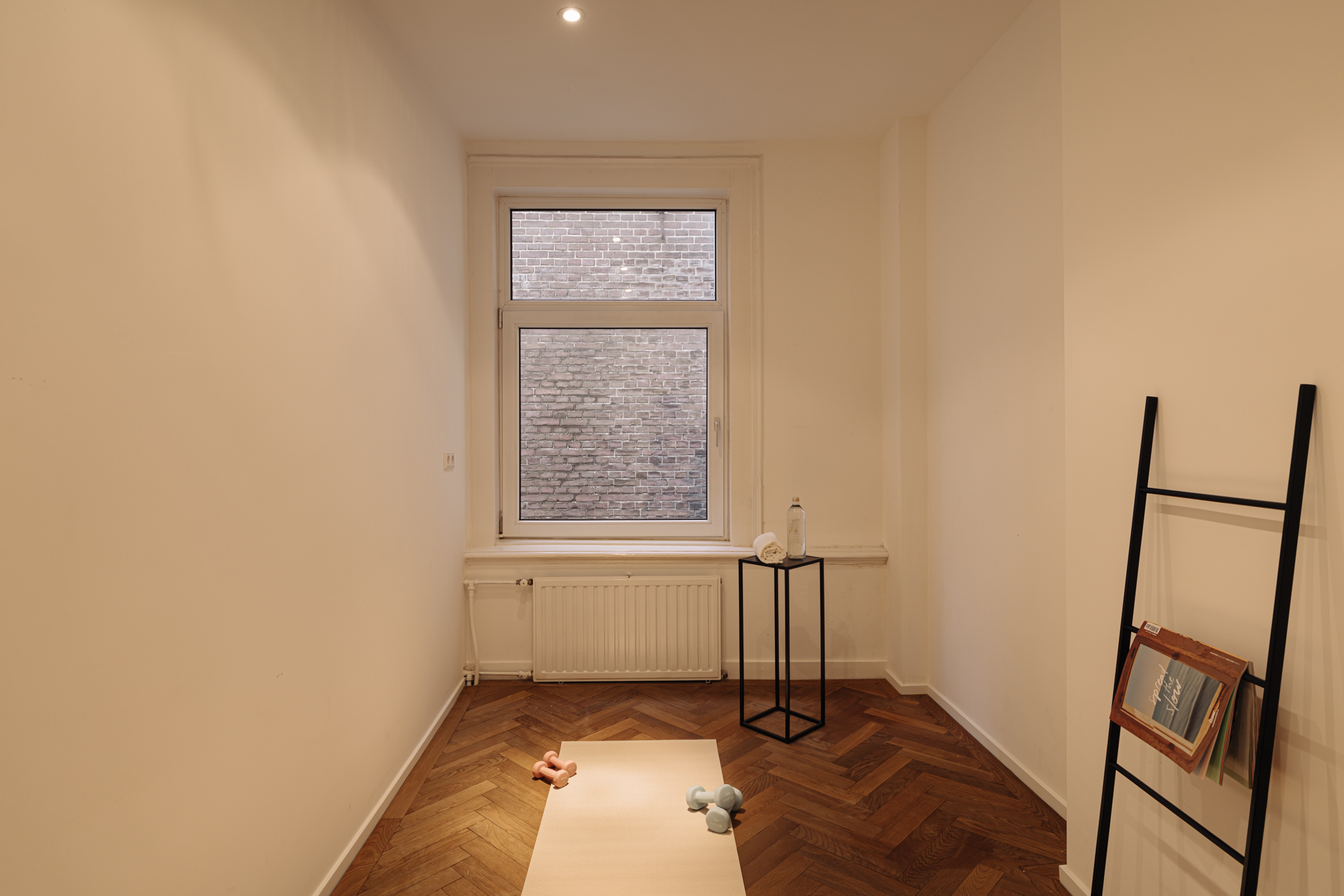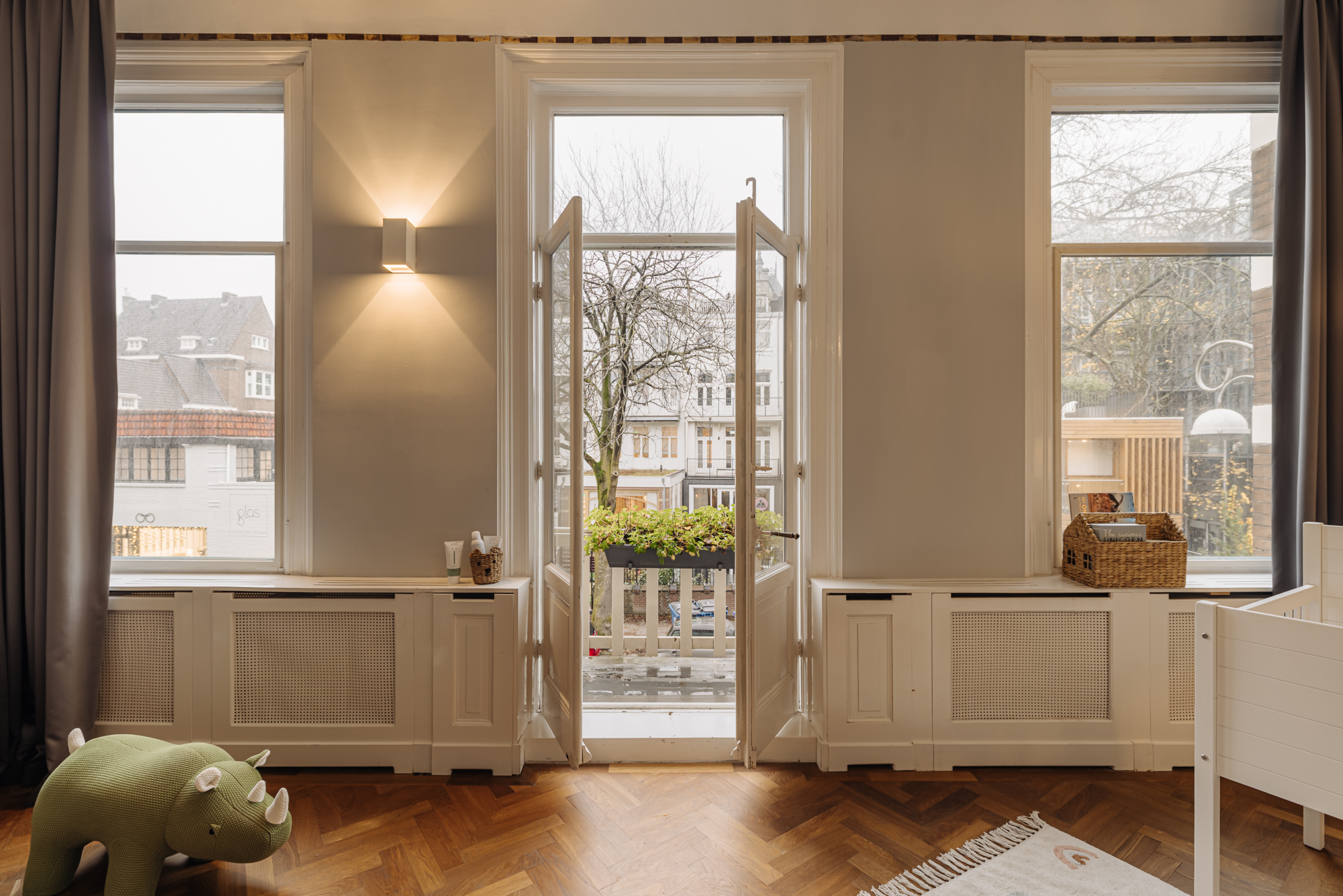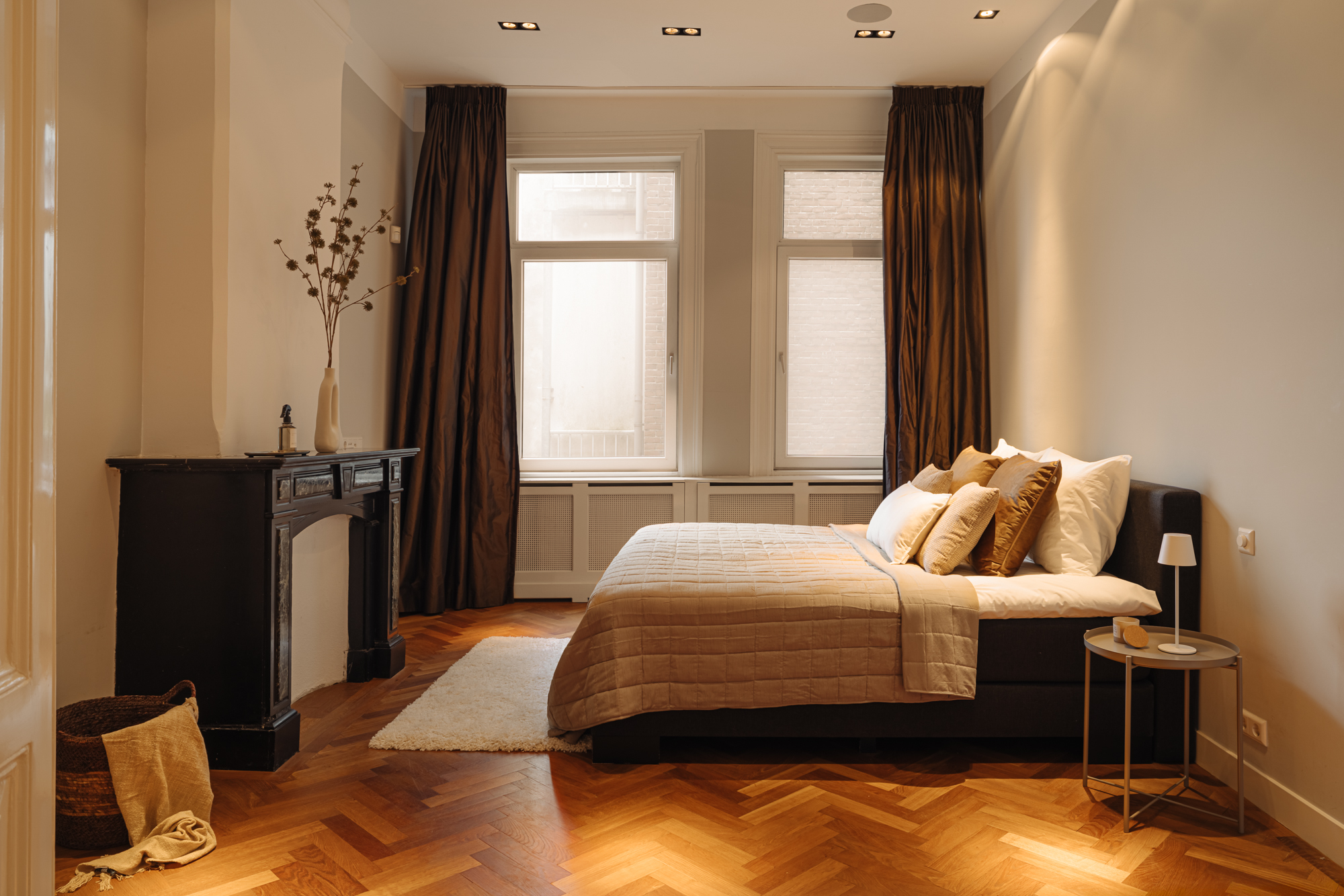 De slaapkamer aan de voorzijde is eveneens ruim en licht, met drie grote ramen en openslaande deuren naar een charmant Frans balkon. Ook hier zorgen de klassieke details en de visgraatvloer voor een elegante uitstraling.