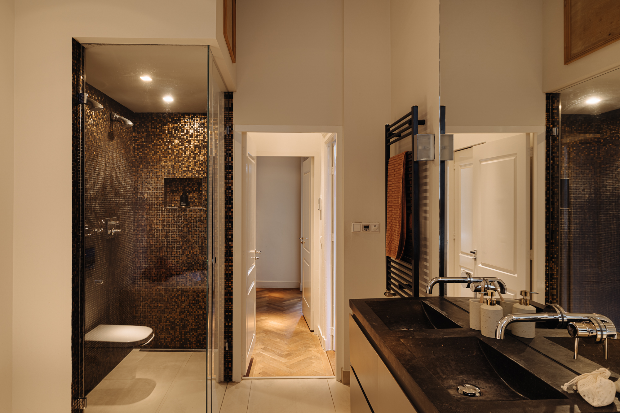 De badkamer op deze verdieping is donker en stijlvol, compleet uitgerust met een dubbel wastafelmeubel, ligbad, dubbele douche en toilet. De combinatie van natuursteen en mozaïektegels creëert een warme, ontspannen sfeer.