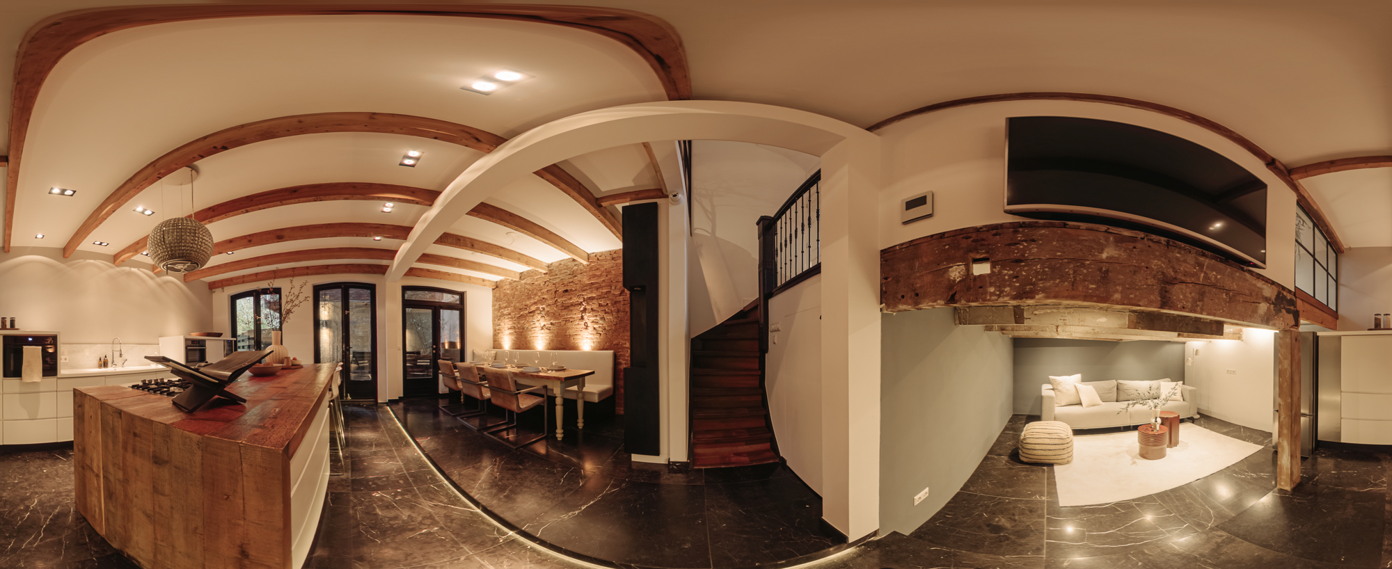 In het eetgedeelte is volop ruimte voor een grote eettafel. De zichtbare houten balken geven deze verdieping zijn warme, authentieke uitstraling. Via openslaande deuren bereikt u de patio een heerlijke plek voor een rustig ontbijt of een kop koffie in de ochtendzon.