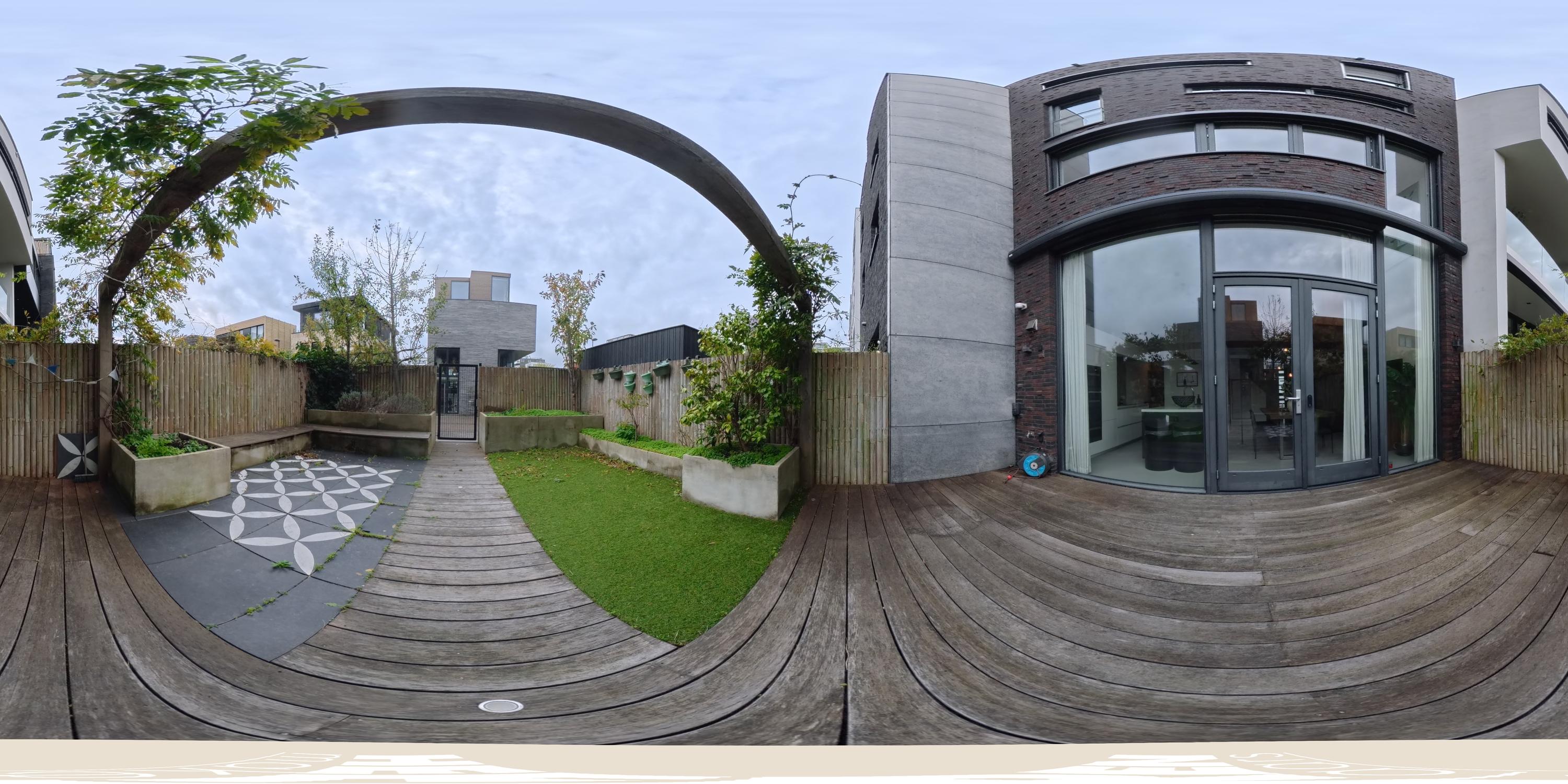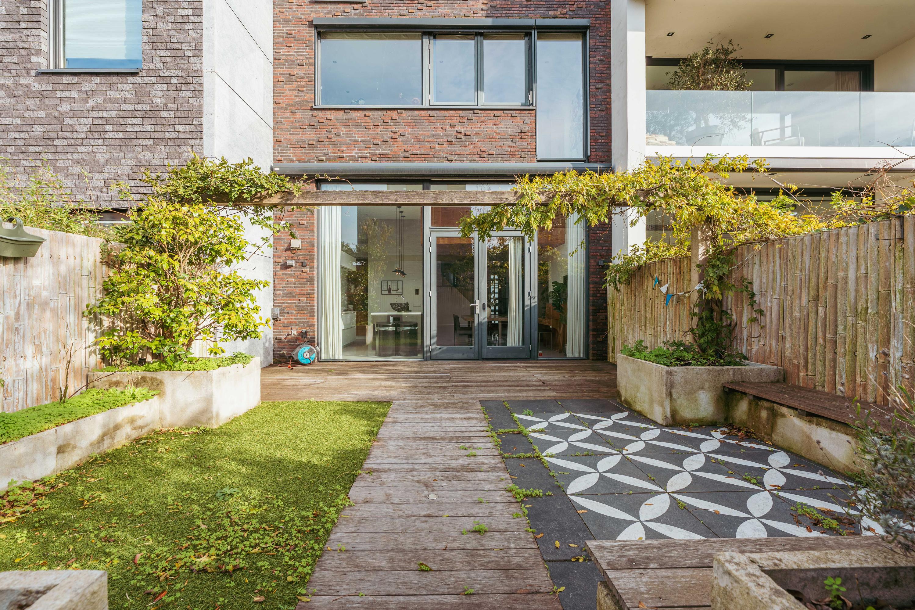 Dubbele openslaande deuren geven toegang tot de onderhoudsvriendelijke achtertuin van circa 54 m². De tuin is fraai aangelegd met houten vlonders, sierbestrating en groen. Achterin bevindt zich een eigen poort naar het achtergelegen terrein met twee privéparkeerplaatsen voorzien van een elektrische laadpaal.