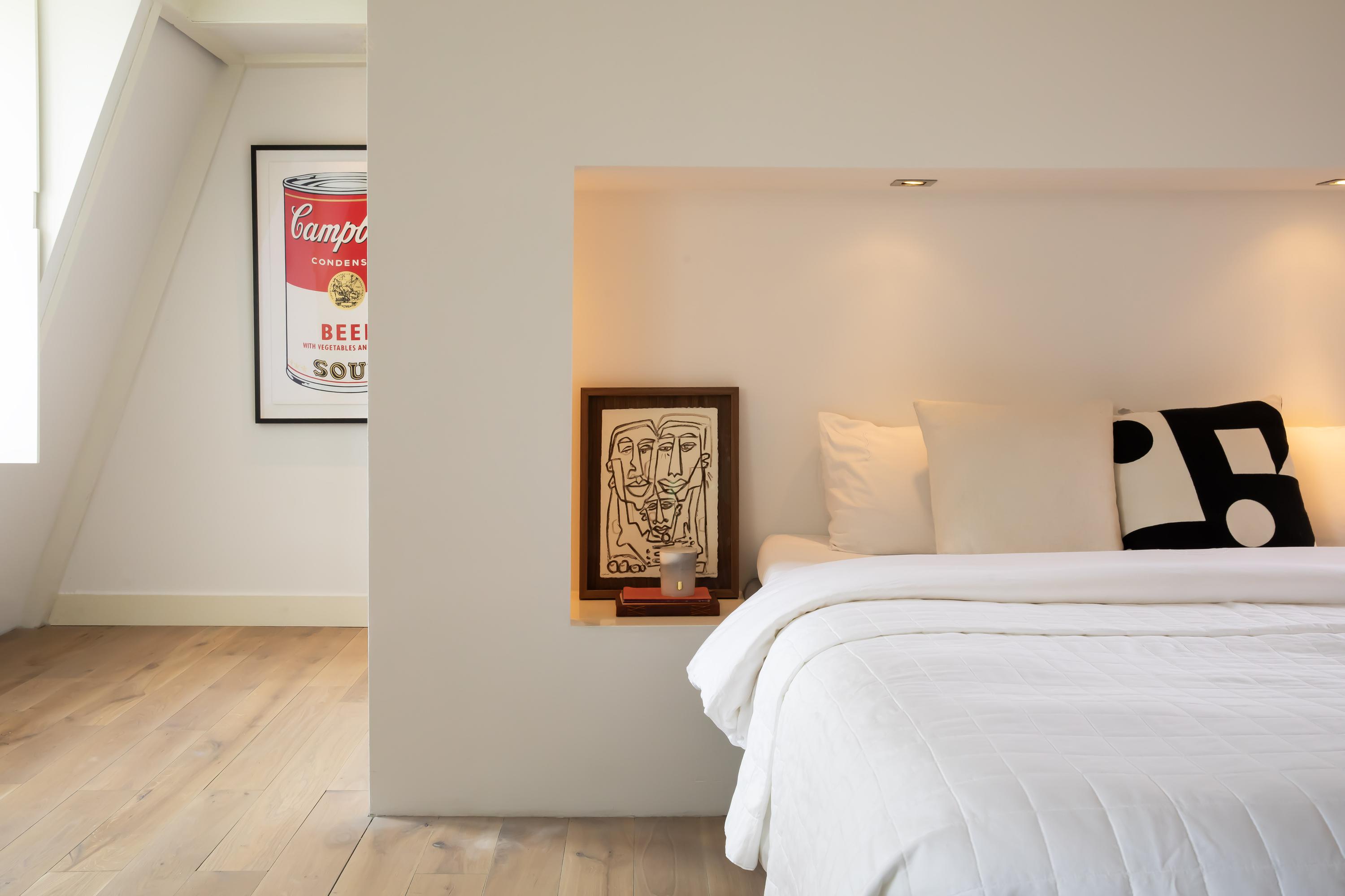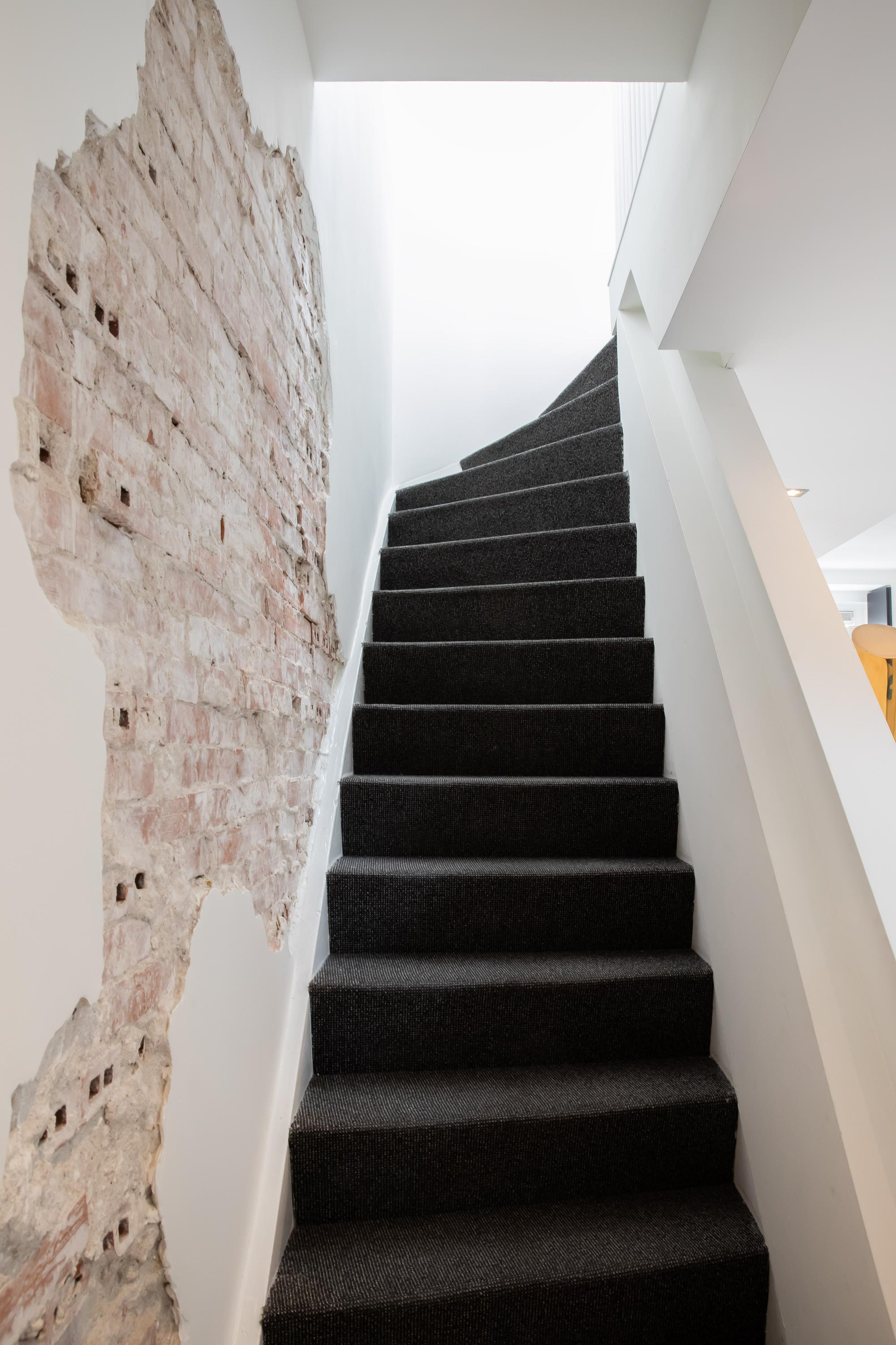 Via de trap bereikt u direct de royale, open woonkamer op de derde verdieping. De ruimte is extra breed en beschikt over maar liefst vier ramen – het dubbele van wat gebruikelijk is in Amsterdam – waardoor er een overvloed aan daglicht binnenvalt. De moderne open keuken is uitgerust met een imposant kookeiland met eetgedeelte en hoogwaardige inbouwapparatuur van onder andere Boretti, waaronder een oven, koel-vriescombinatie, 8-pits gasfornuis met afzuigkap, vaatwasser en wijnklimaatkast. Bovendien is er volop bergruimte aanwezig. Vanuit de keuken heeft u toegang tot het brede, gezellige balkon (circa 4 m²), gelegen op het oosten. Daarnaast bevindt zich op deze verdieping een separaat toilet met fonteintje en een handige berging. Een elegante trap met deels transparante brick-wall leidt u naar de vierde verdieping.