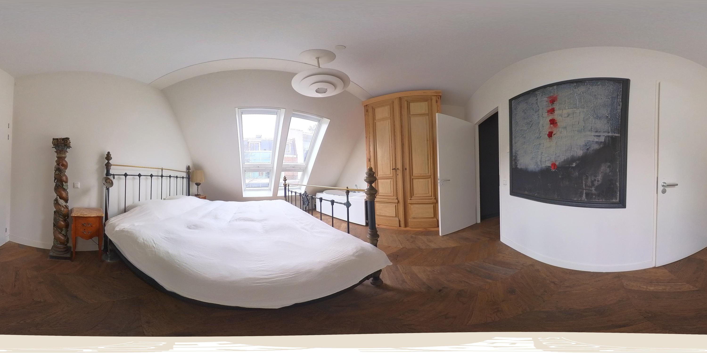 De slaapkamer aan de achterzijde is bijzonder royaal en beschikt over grote raampartijen met Frans balkon, waardoor er veel natuurlijk licht naar binnen valt. De kamer biedt ruim plaats aan een groot bed en kastruimte. Aangrenzend bevindt zich de en-suite badkamer, voorzien van een douche, wastafel en toilet.