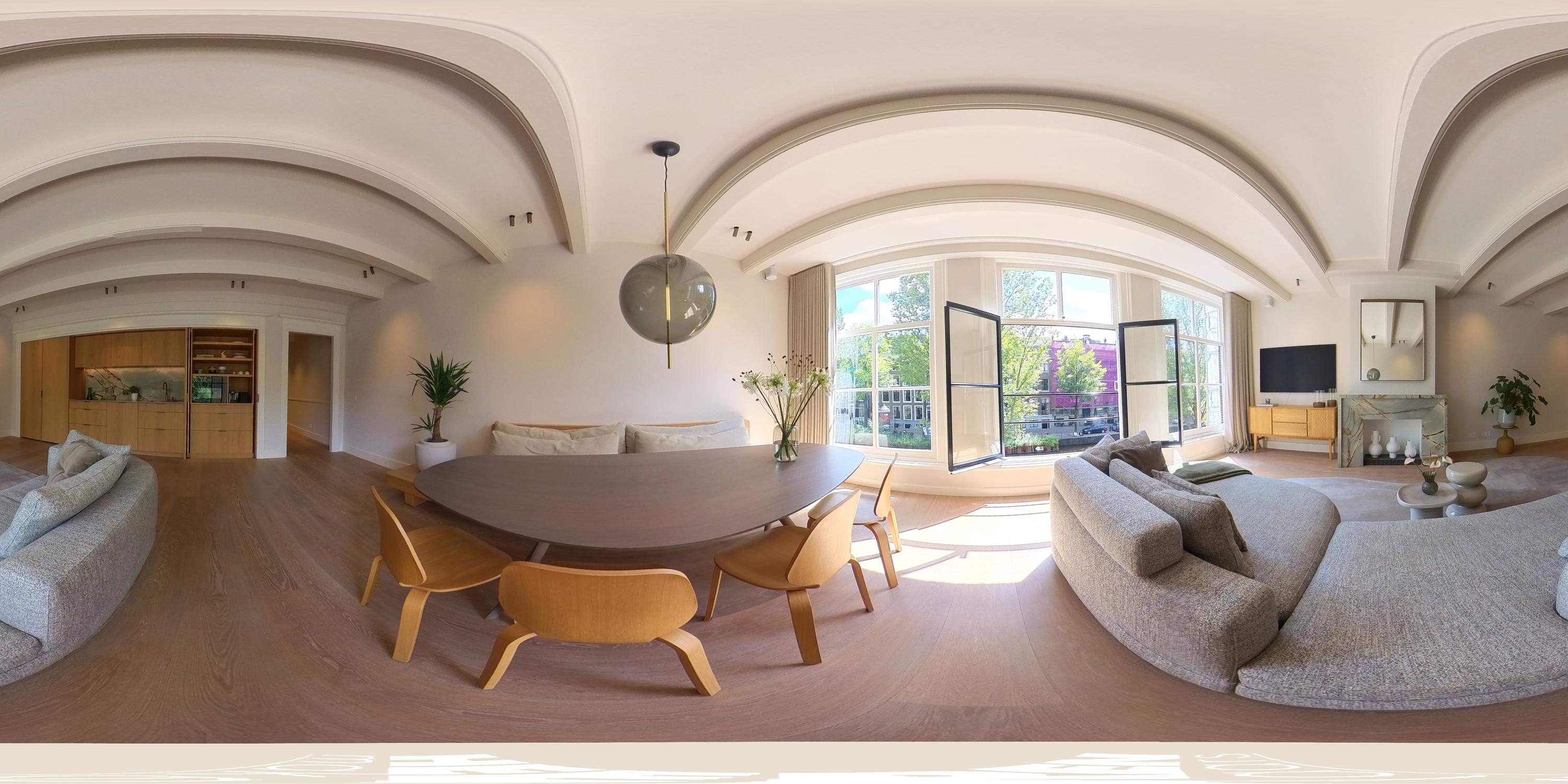 Aan de voorzijde bevindt zich de prachtige en breed opgezette woonkamer met grote raampartijen en fenomenaal uitzicht over de Herengracht. De ruimte wordt gekenmerkt door veel lichtinval en een bijzonder detail: de schouw en de achterwand in de keuken zijn uitgevoerd in hetzelfde kleurrijke marmer, wat zorgt voor een luxe en stijlvolle uitstraling.