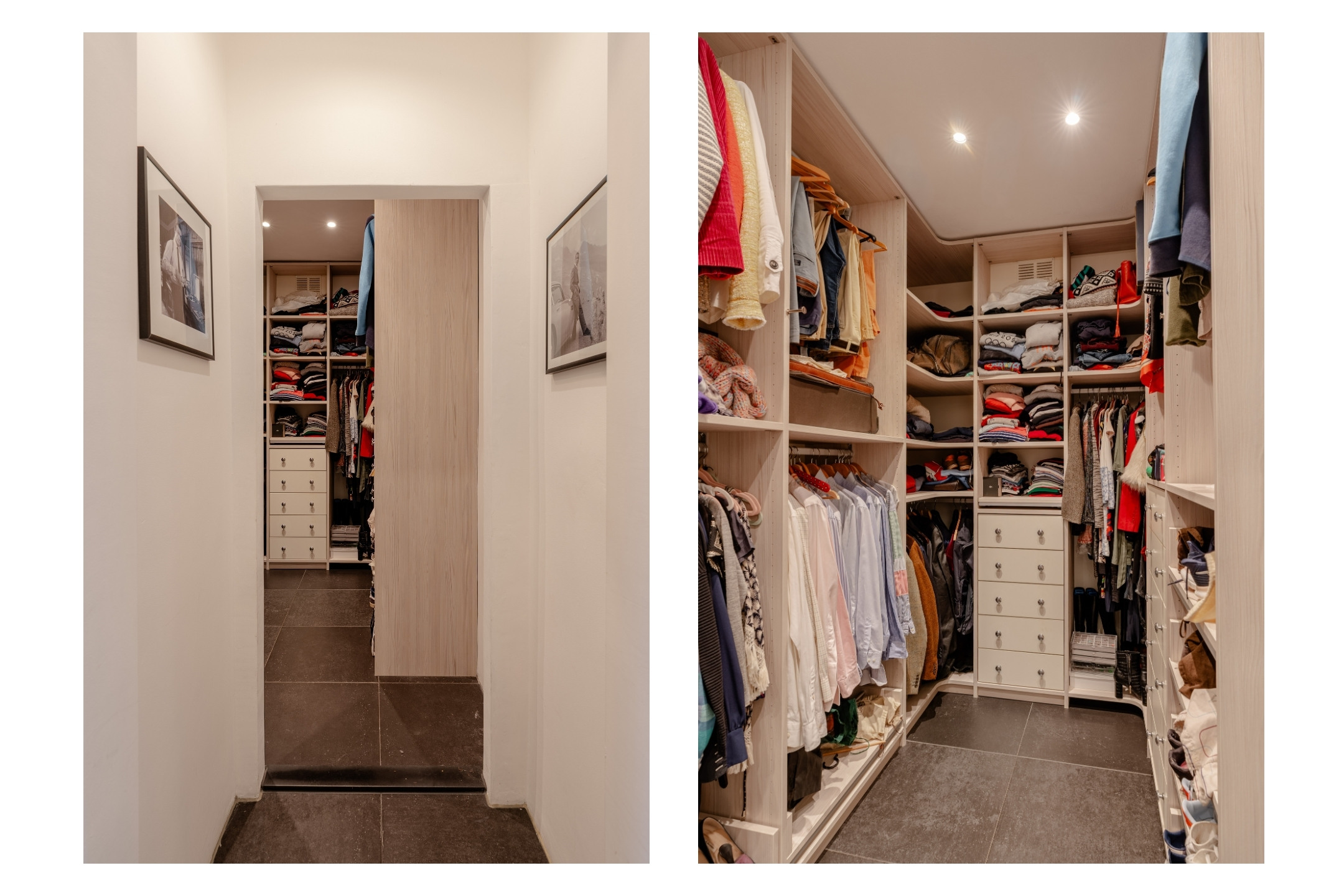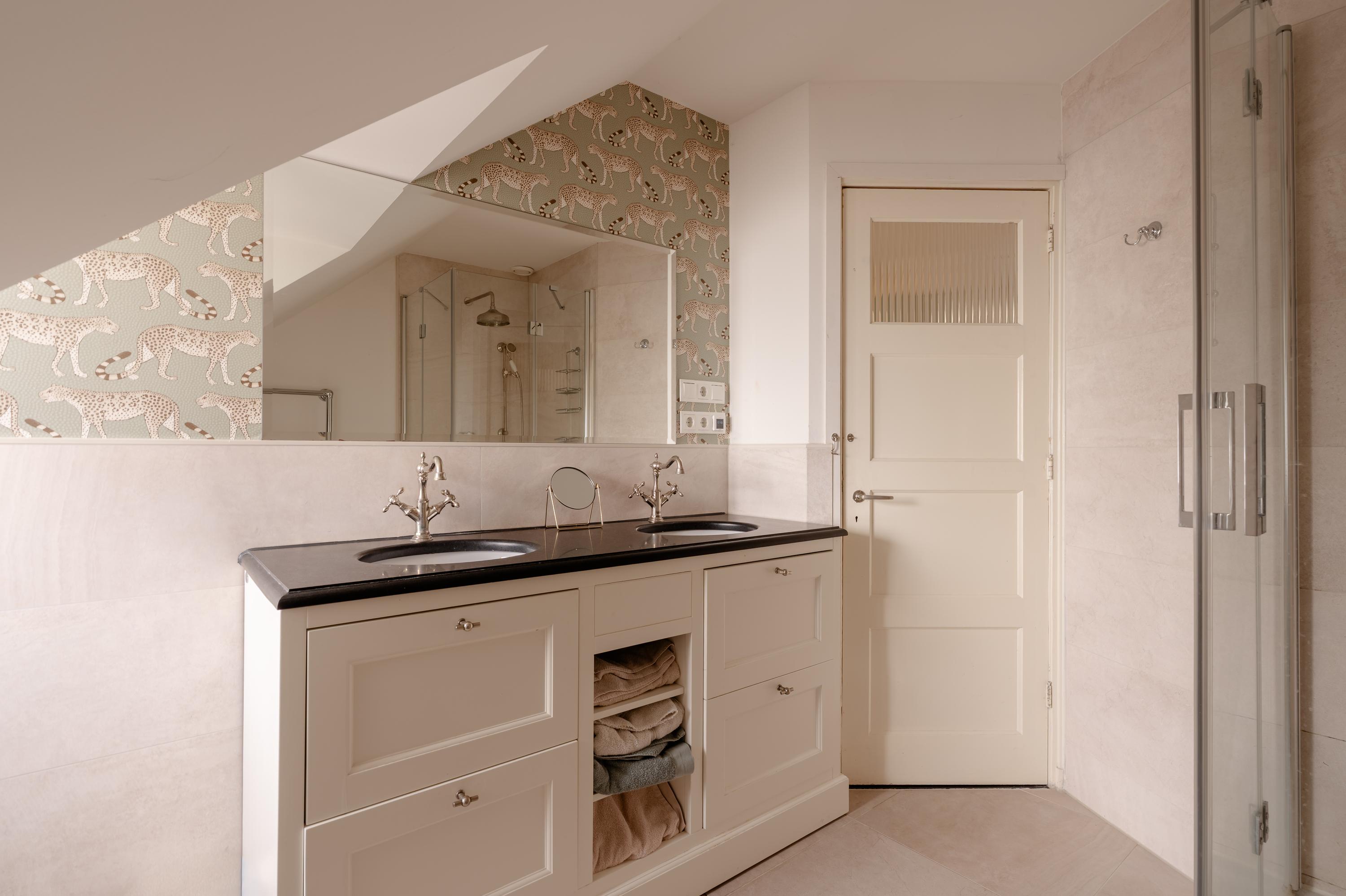 Aan de achterzijde van de woning bevindt zich de ruime master bedroom met toegang tot het balkon. De klassieke badkamer, uitgevoerd in beton ciré, beschikt over een douche, dubbele wastafel, handdoekradiator en een vrijstaand ligbad. Via de openslaande deuren in de badkamer heeft u eveneens toegang tot het balkon.