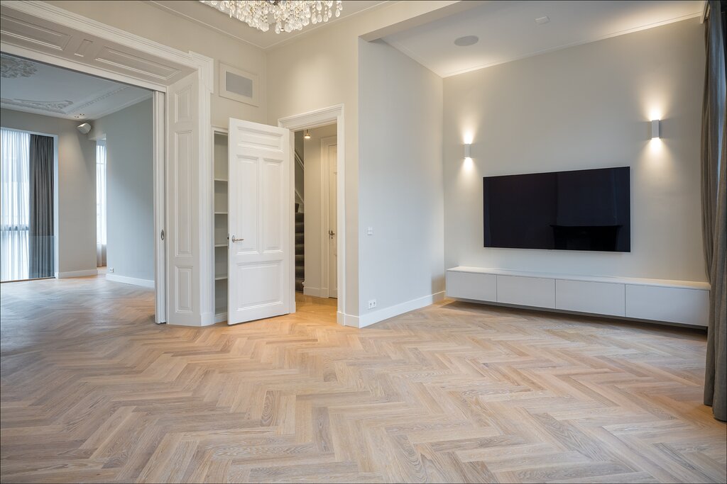 De woonkamer op de eerste verdieping is bereikbaar via zowel trap als met de lift. Een stijlvolle en suite kamer met hoge gedecoreerde plafonds. De voorzijde is ingericht als televisiekamer met een gashaard en is tevens al voorzien van een televisie. Aan de achterzijde bevindt zich de zitkamer met nóg een openhaard en bibliotheek. Door de vide is hierbij een prettige verbinding met de keuken op de begane grond.