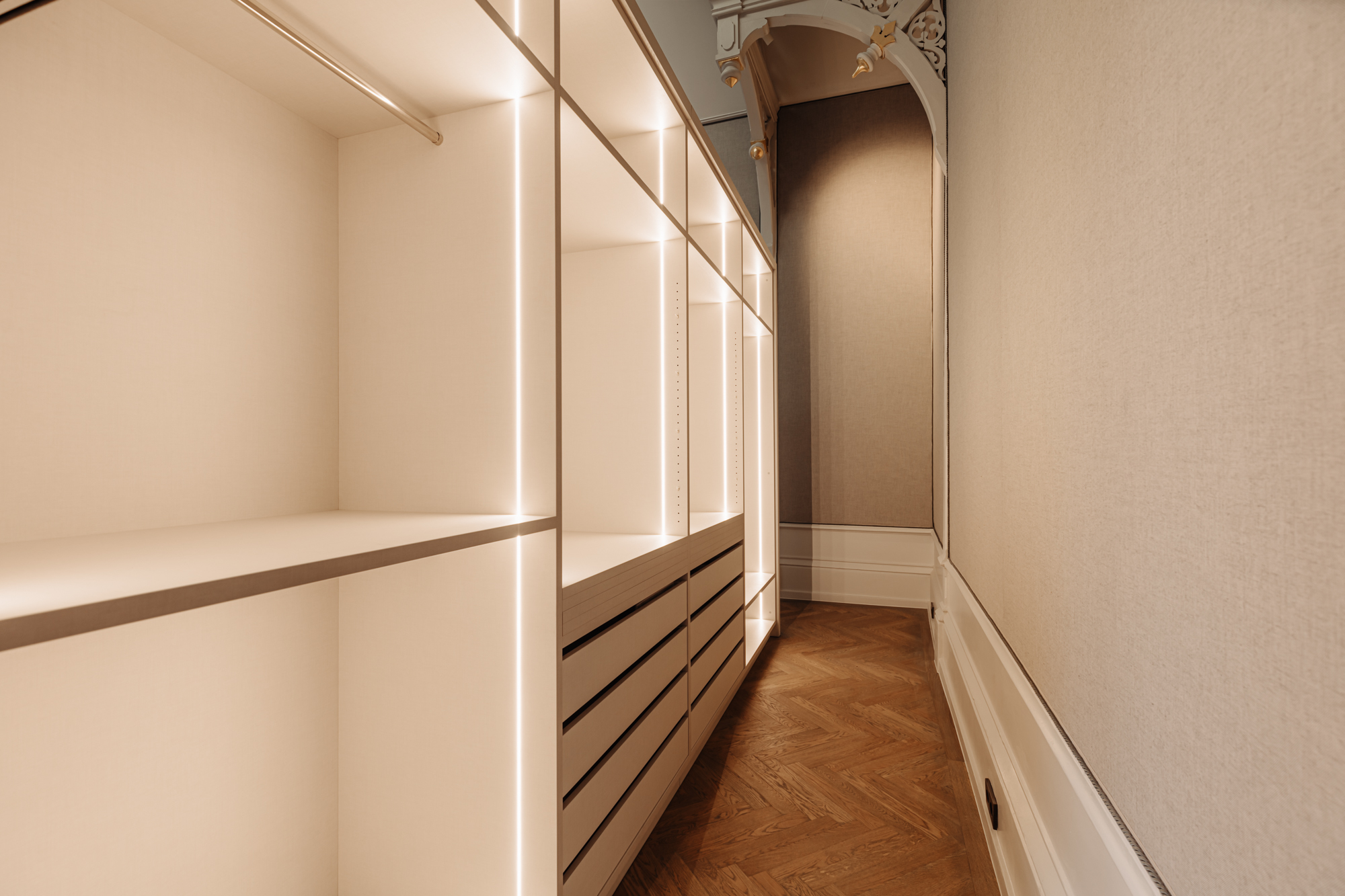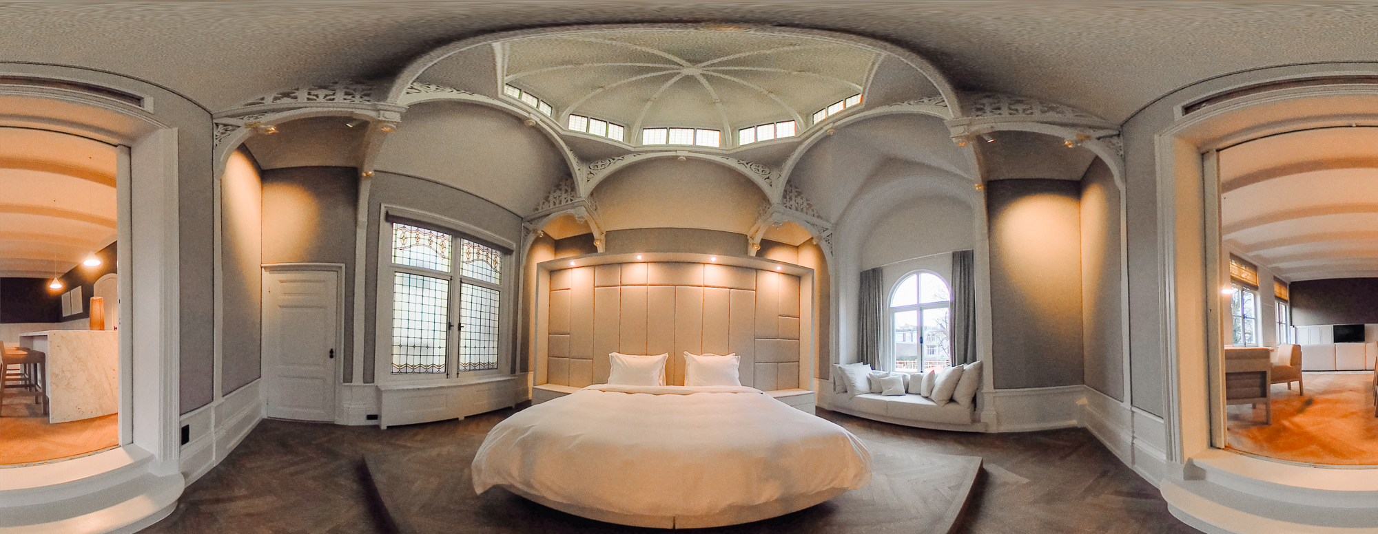 Via het bordes en de nette gemeenschappelijke hal is de entree op de eerste verdieping bereikbaar, zowel via de trap als met de lift. Het appartement beslaat de volledige breedte van de panden nr. 129 en 131 (circa 14 meter). In de hal bevinden zich een garderobe, een gastentoilet en een kast met aansluiting voor wasmachine en droger. De woonkamer is ruim en licht, met een moderne open keuken voorzien van een kookeiland met bar. De keuken is uitgerust met hoogwaardige inbouwapparatuur en een marmeren werkblad. Dankzij de grote ramen en het originele glas-in-lood is de ruimte zeer licht. Aangrenzend bevindt zich een stijlkamer met originele lambrisering, gespannen wandbekleding en een houten balkenplafond. De slaapkamer, bereikbaar via hoge schuifdeuren, is gelegen in de voormalige kapel van het pand. Deze ruimte is bijna 8,40 meter hoog en voorzien van gedetailleerd houtsnijwerk. Achter het bed bevindt zich een ruime inloopkast. De badkamer is volledig ingericht door Piet Boon en beschikt over een ligbad, inloopdouche, dubbele wastafel in travertin en een apart toilet. Door het hele appartement ligt een eikenhouten vloer met akoestische isolatie en vloerverwarming.
