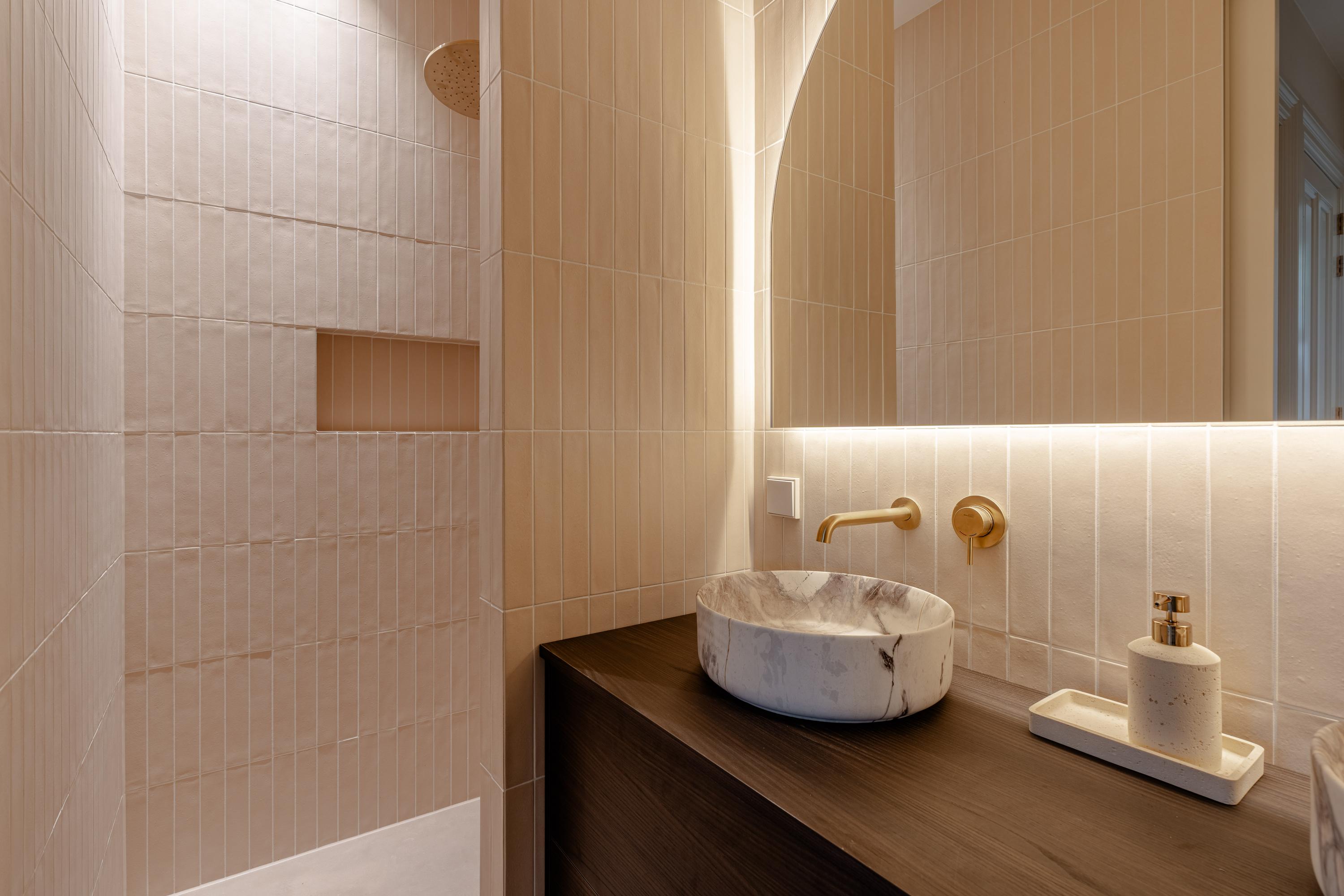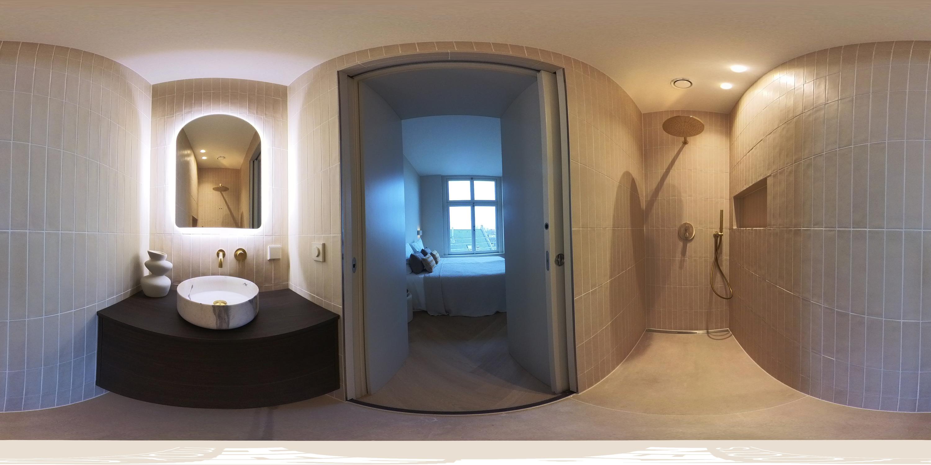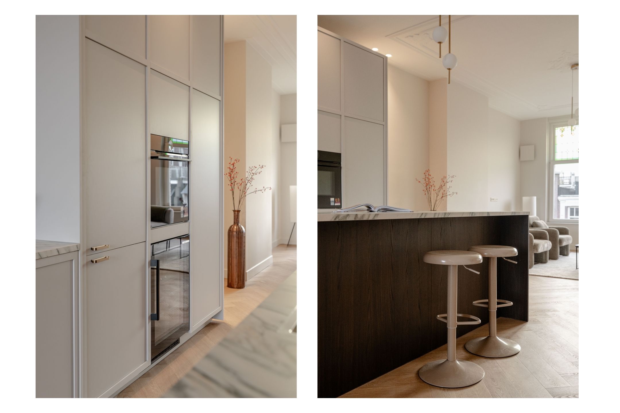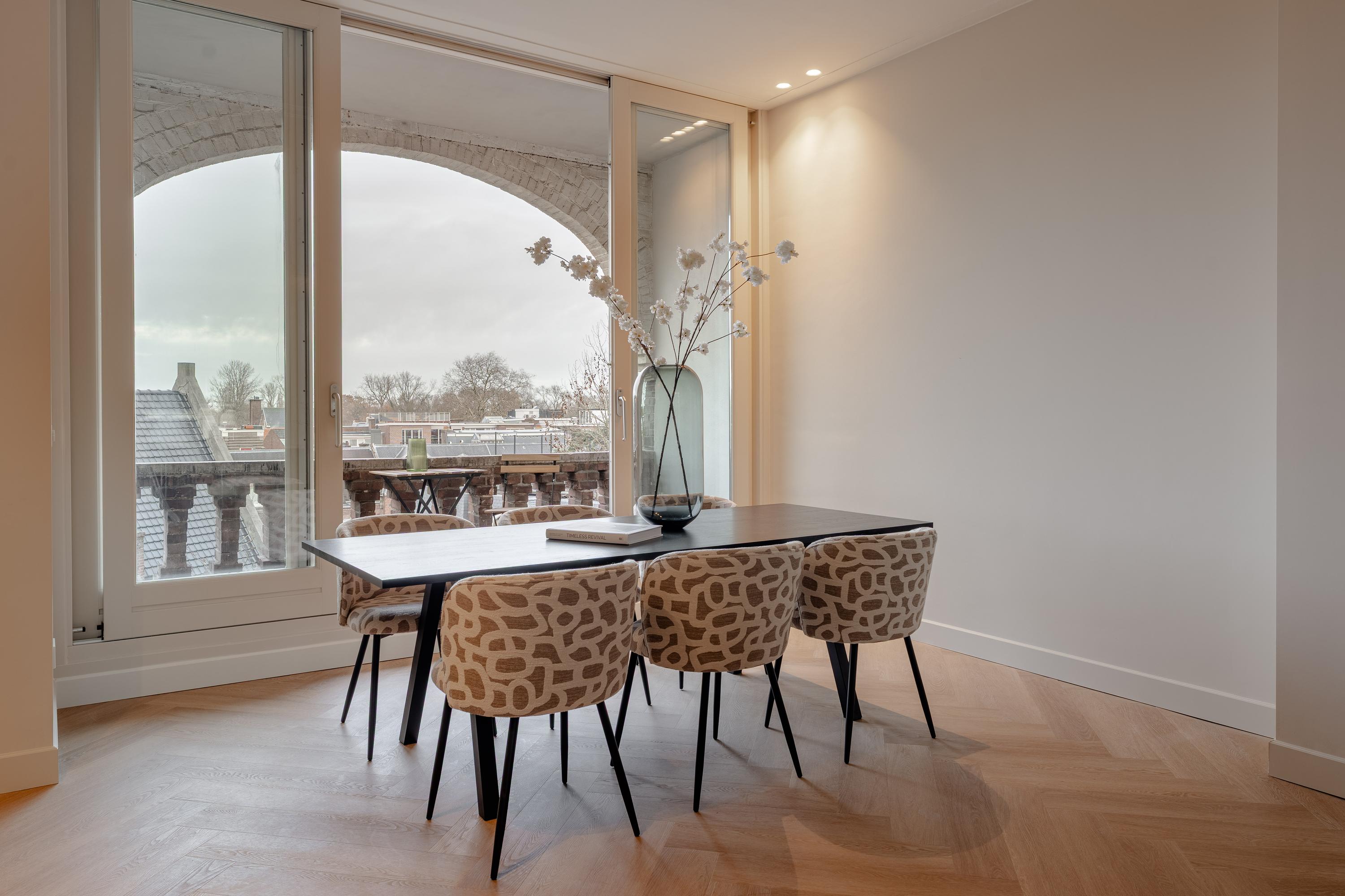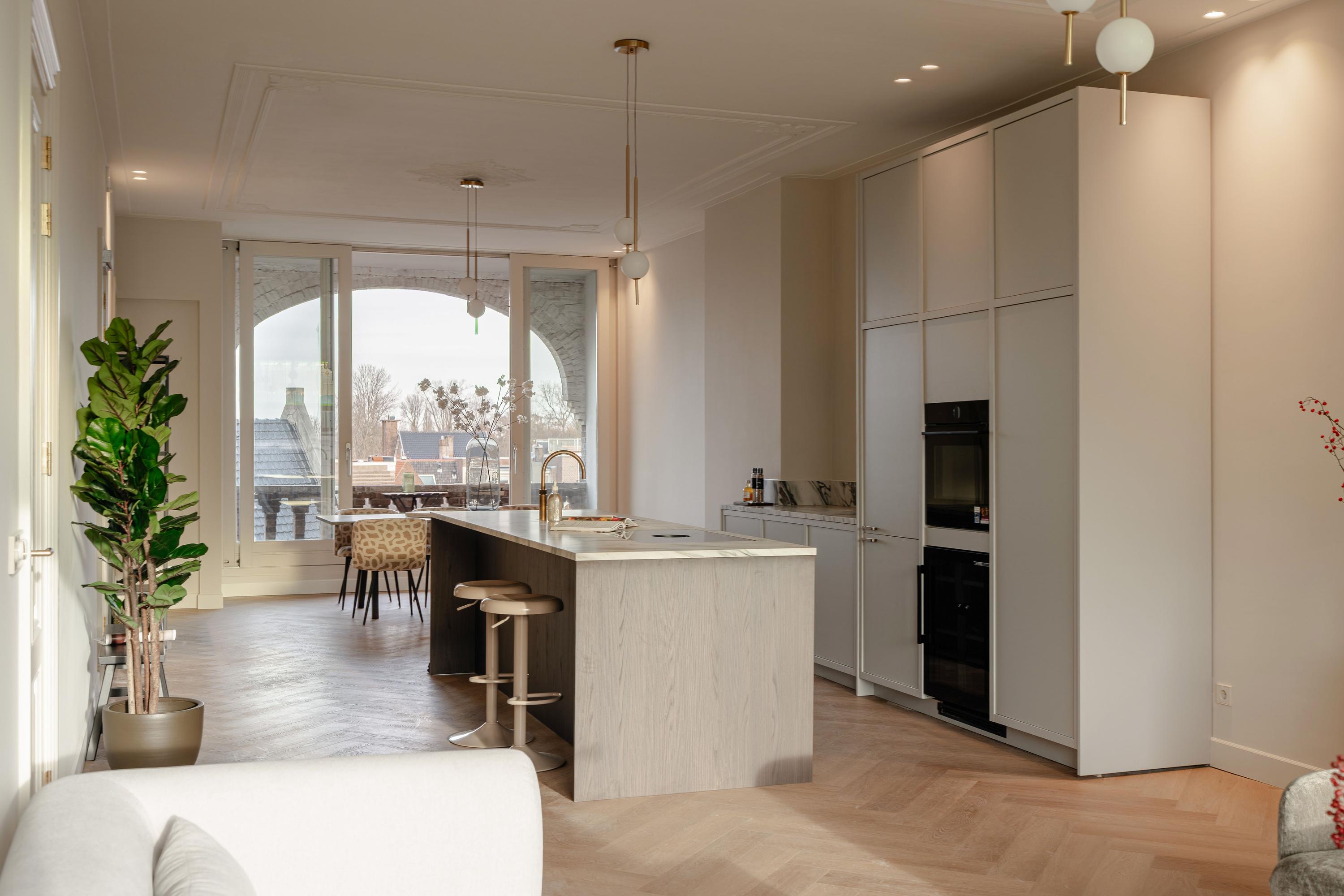Dit luxe appartement is gelegen op de derde verdieping en wordt gekenmerkt door een ruime en open indeling, met grote raampartijen aan zowel de voor- als achterzijde die zorgen voor een prettige lichtinval. De woning is hoogwaardig afgewerkt en biedt een comfortabele woonomgeving met een rustige, verfijnde uitstraling. De woonkamer is gesitueerd aan de voorzijde van het appartement en beschikt over een plafondhoogte van circa 3,07 meter. De woonruimte vormt samen met de keuken en eetkamer één grote, open leefruimte. De luxe keuken is centraal in de woning gelegen en uitgevoerd met een royaal spoel- en kookeiland, voorzien van een inductiekookplaat, spoelbak en Quooker. Daarnaast beschikt de keuken over een koelkast, vriezer, combi-oven, klimaatkast en voldoende kastruimte. Het kookeiland fungeert tevens als comfortabele bar. Aan de achterzijde van het appartement bevindt zich het overdekte balkon, dat een fraai uitzicht biedt over de groene tuinen aan de achterzijde en een rustige plek vormt om buiten te zitten. Aan de voorzijde van de woning bevindt zich de gang, vanwaar toegang is tot de eerste slaapkamer, het separate toilet, de wasruimte/berging en de eerste badkamer. Deze badkamer is uitgerust met een inloopdouche en een dubbele wastafel met meubel. De tweede slaapkamer is gelegen aan de achterzijde van het appartement en beschikt over vaste kastruimte en een ensuite badkamer, voorzien van een inloopdouche en een wastafel met meubel.