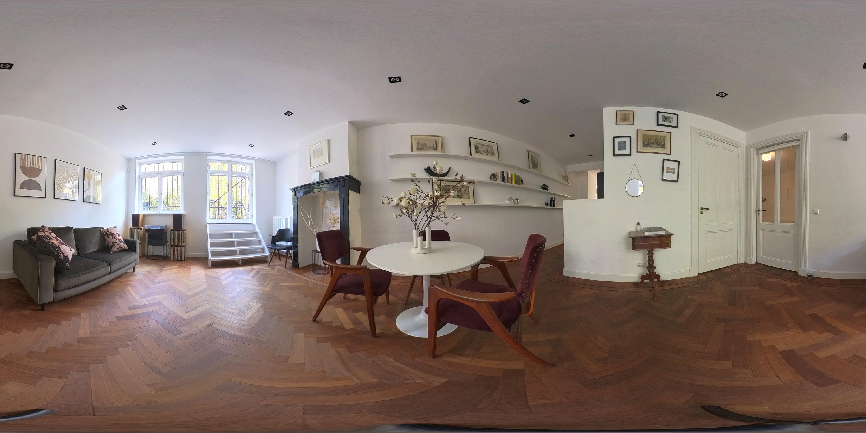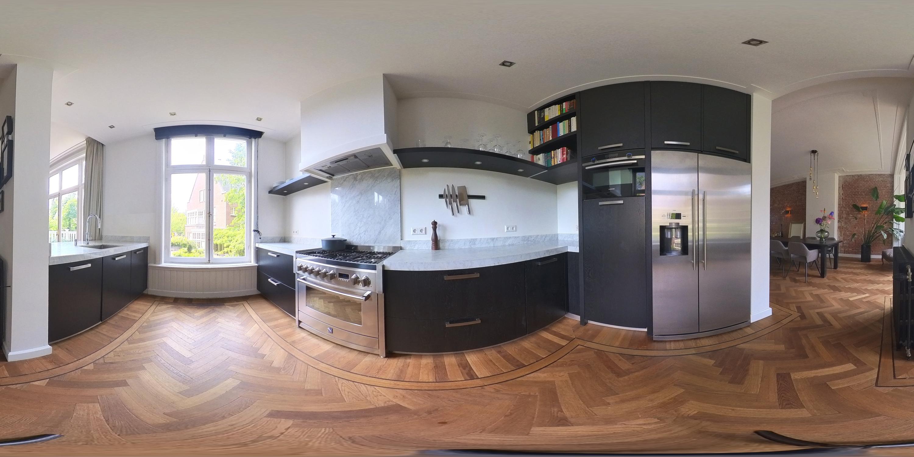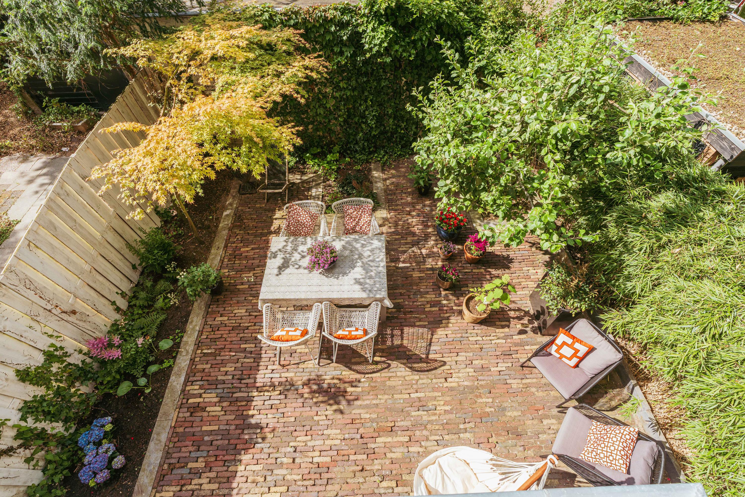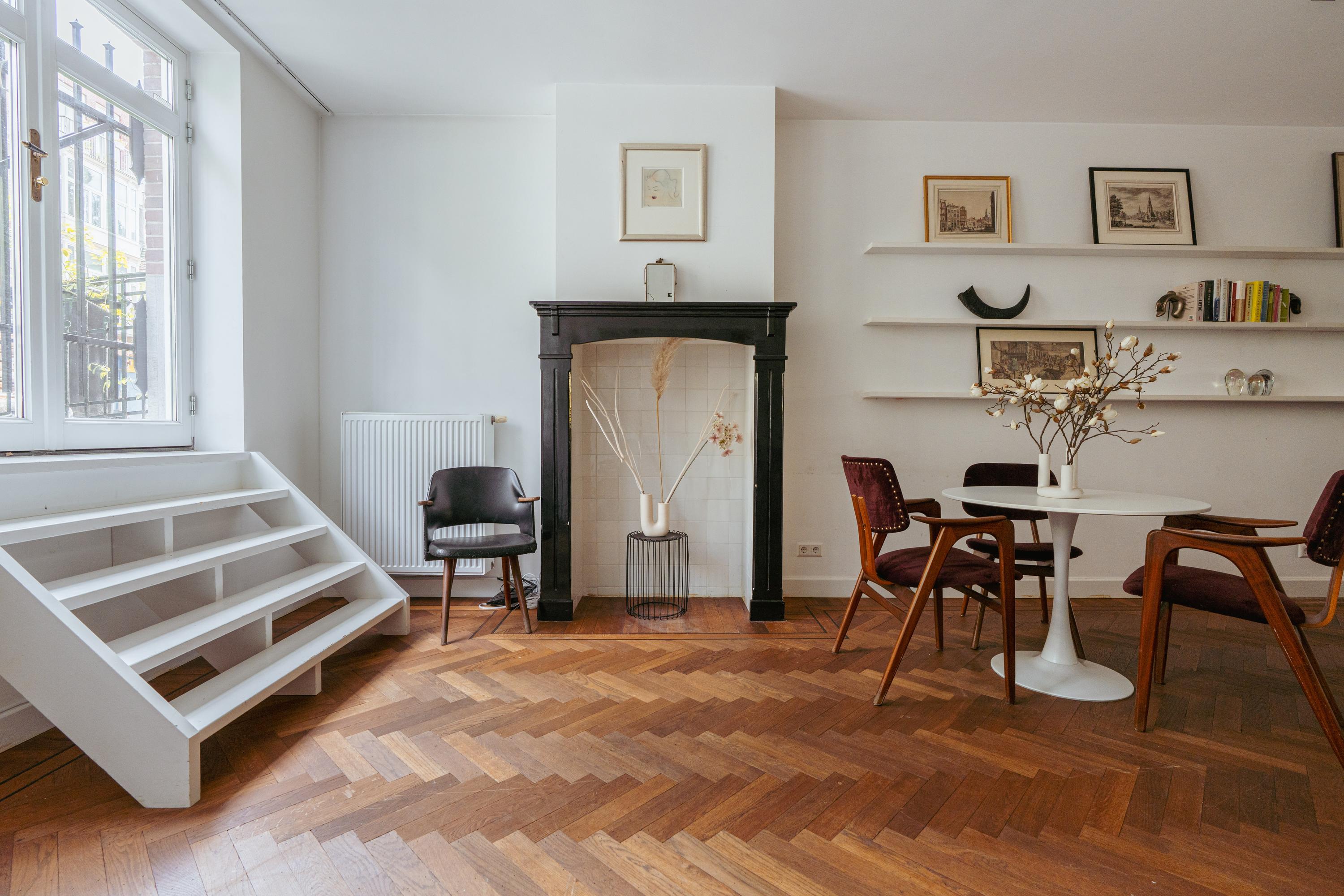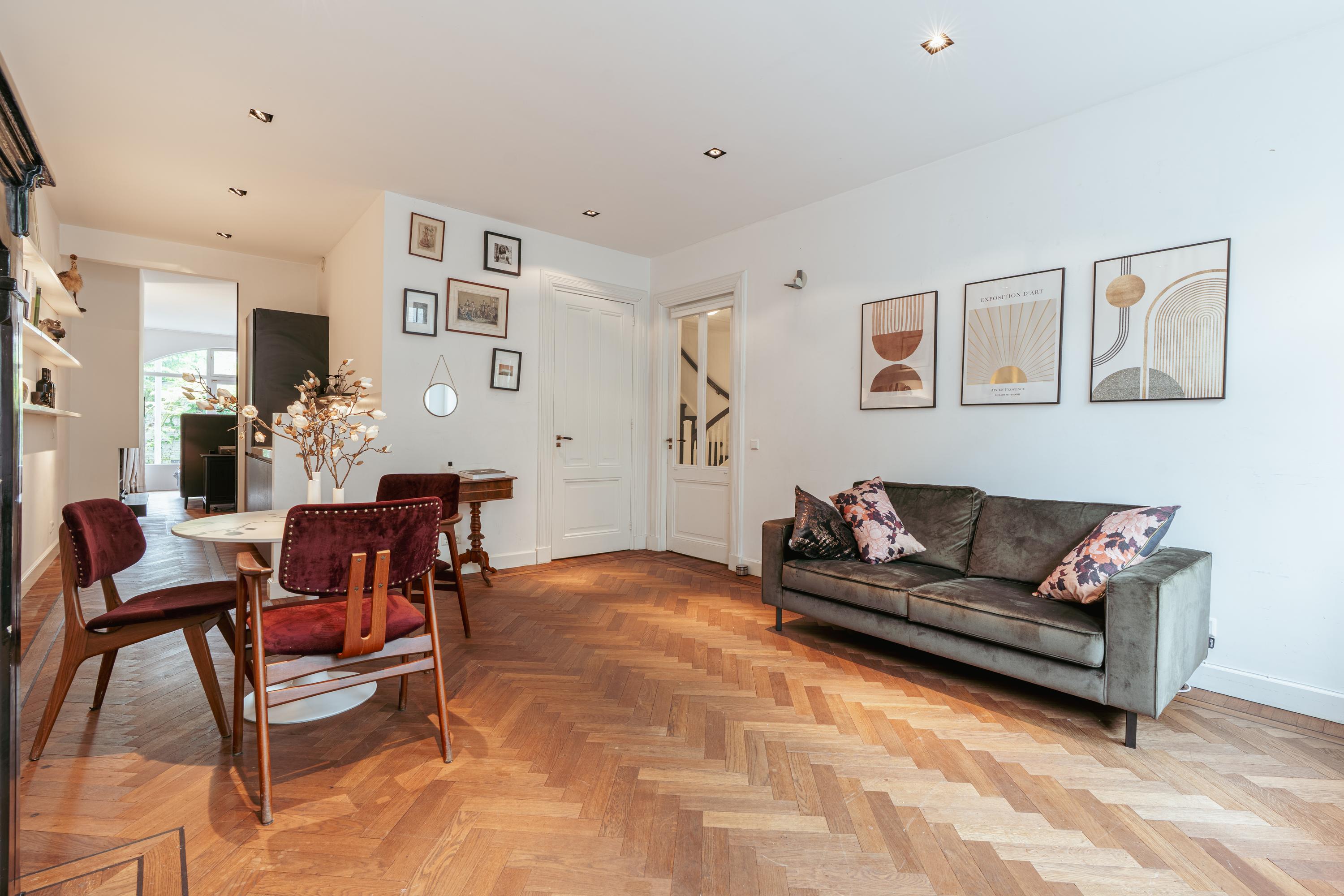 De riante woonkamer aan de voorzijde heeft een plafondhoogte van maar liefst 3,32 meter en beschikt over een sfeervolle open haard. De parketvloer, gecombineerd met een karakteristieke deels bakstenen muur, zorgt voor een warme, stijlvolle uitstraling. Aan de achterzijde bevindt zich de eetkamer, grenzend aan een zonnig balkon met openslaande deuren. Perfect om tot rust te komen na een werkdag. De halfopen keuken, grenzend aan de eetkamer is van alle gemakken voorzien. Naast een spoelbak, vaatwasser, dubbele oven, een 6-pits gasfornuis en een marmeren werkblad beschikt de keuken over een gezellig spoeleiland met bar – een ideale plek voor een glas wijn of een goed gesprek tijdens het koken. Grote raampartijen zorgen voor veel daglicht en een prettige doorkijk op het omliggende groen.