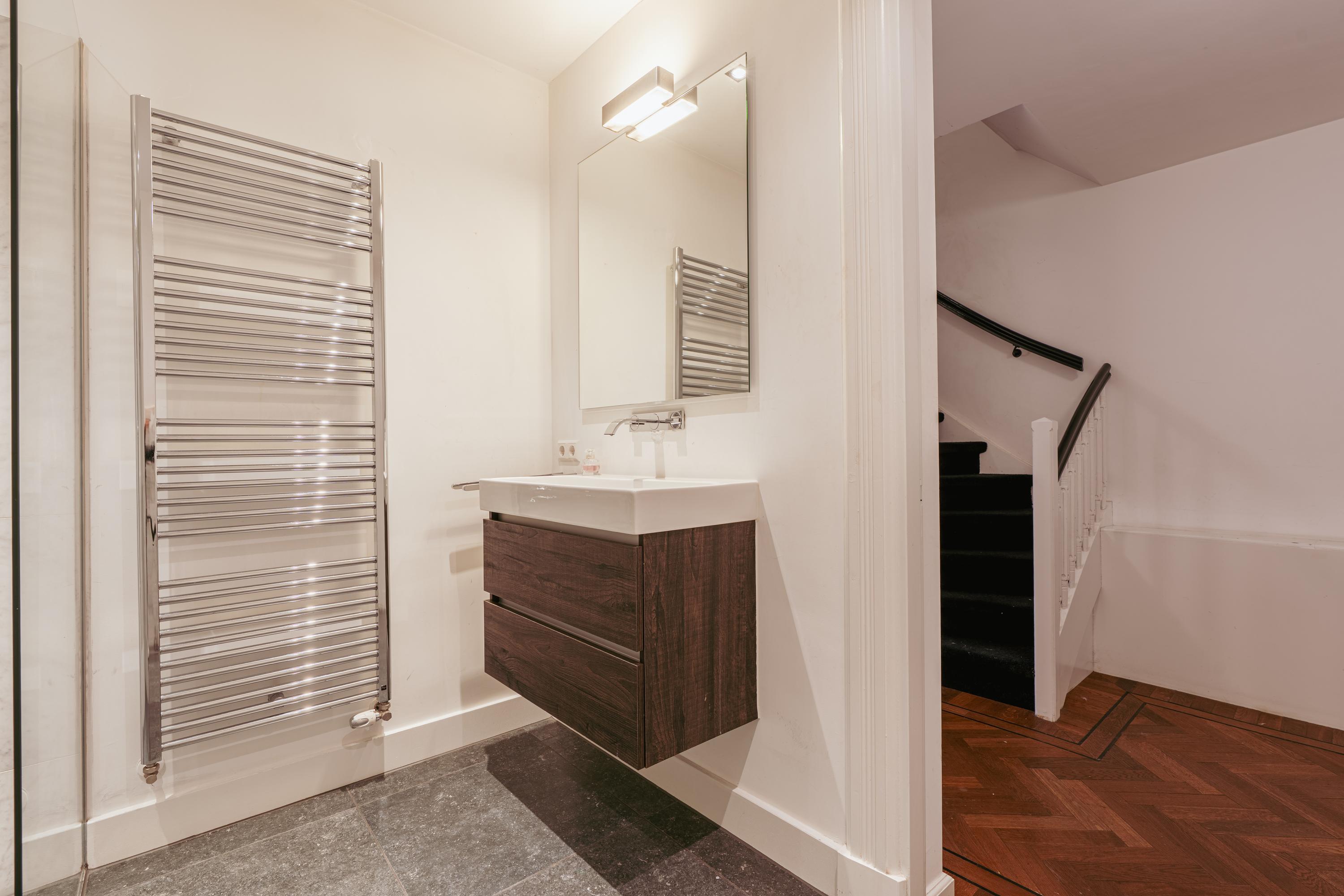 Aan de voorzijde bevindt zich een tweede woonkamer met eigen entree, waardoor deze woonlaag uitermate geschikt is voor gasten, een au pair of dubbele bewoning. De tweede keuken is voorzien van een spoelbak, een 2-pits gasfornuis, een koel-vriescombinatie en een marmeren werkblad. Verder vindt u op deze verdieping een badkamer met douche, wastafel en toilet, evenals een aparte berging met wasruimte en aansluitingen voor wasmachine en droger.