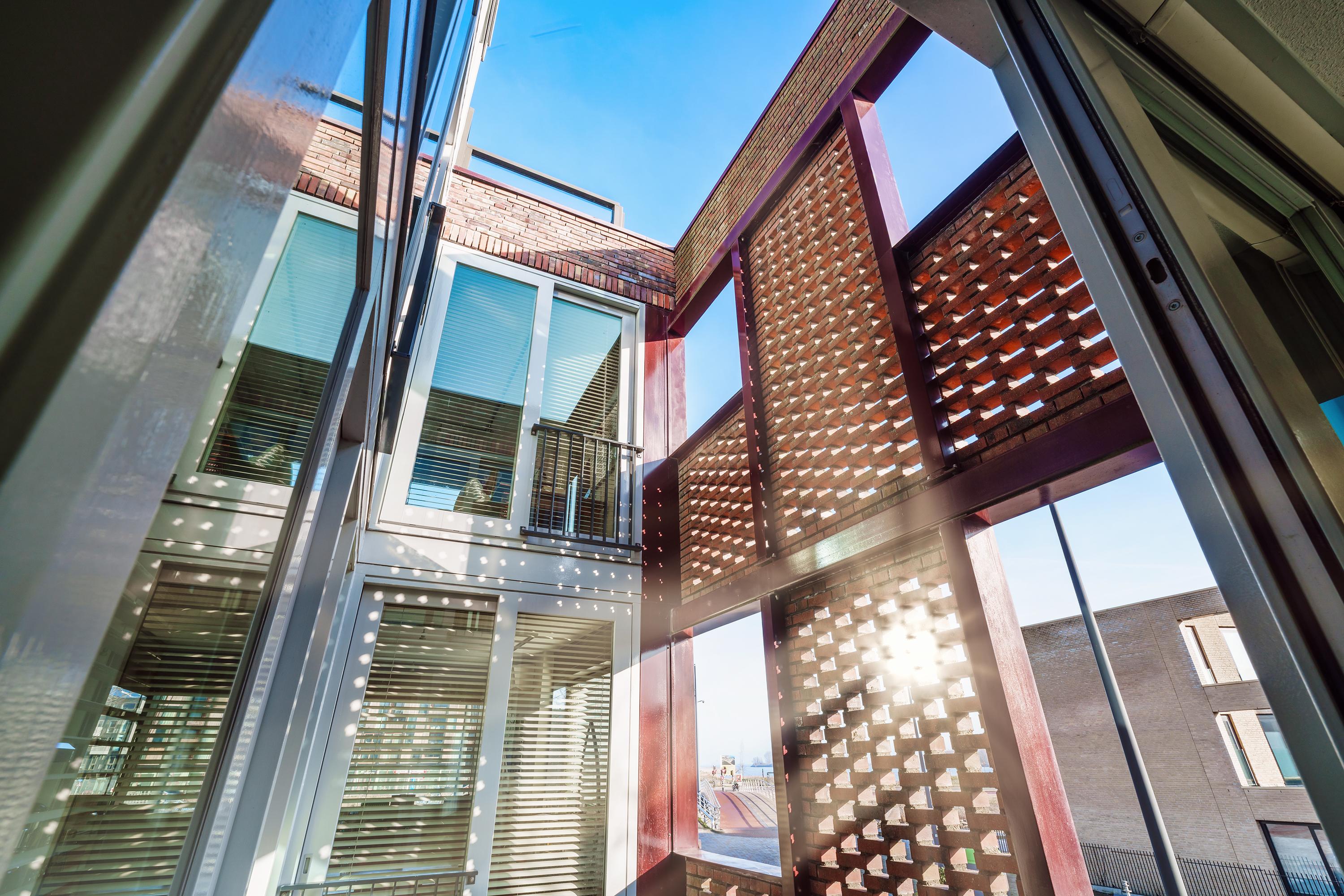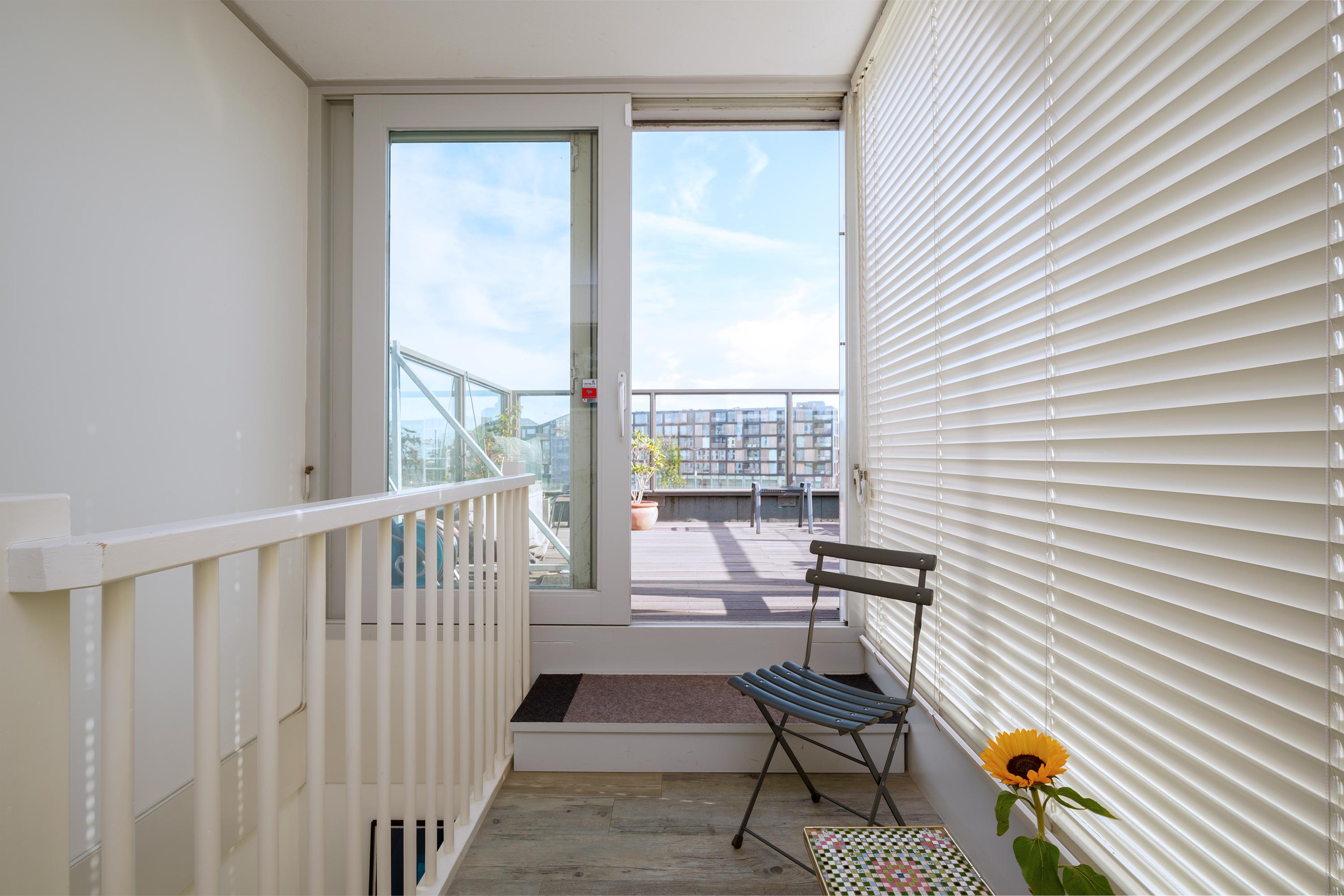 Een trap van de tweede verdieping leidt naar het royale dakterras (ruim 18m²), één van de eyecatchers van deze woning: groot, zonnig en met vrij uitzicht over het water en de wijk. De hoge glazen omheining (voorkomt wind!) en de vlondervloer geeft deze buitenruimte een moderne, open uitstraling met toch veel privacy.