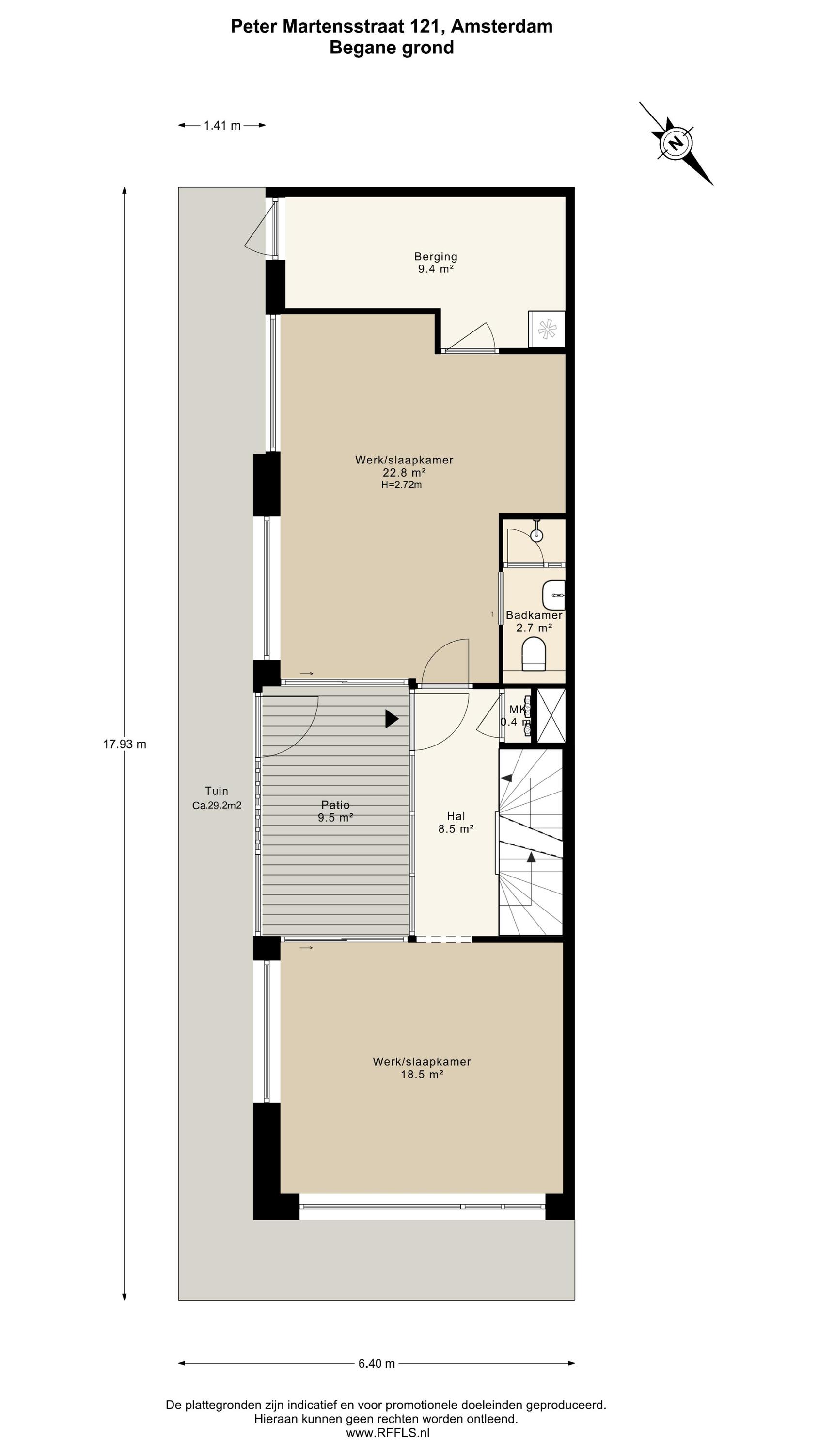 De voordeur leidt via de fijne, besloten patio-tuin naar een gang. Op deze verdieping bevinden zich twee royale kamers en de trap naar de eerste verdieping. Links van de gang bevindt zich een werk/slaapkamer van ruim 22 m² met een eigen douche en toilet. Deze werk/slaapkamer is ook bereikbaar via de tweede entree die leidt naar de ruime en lichte berging, een berging die perfect geschikt is voor opslag of fietsen.